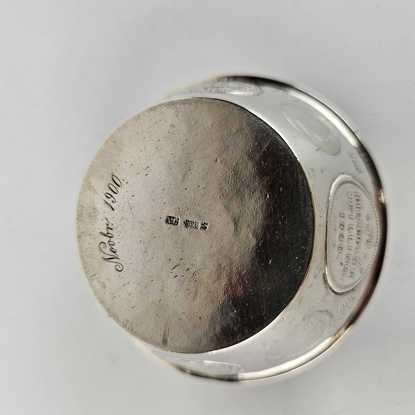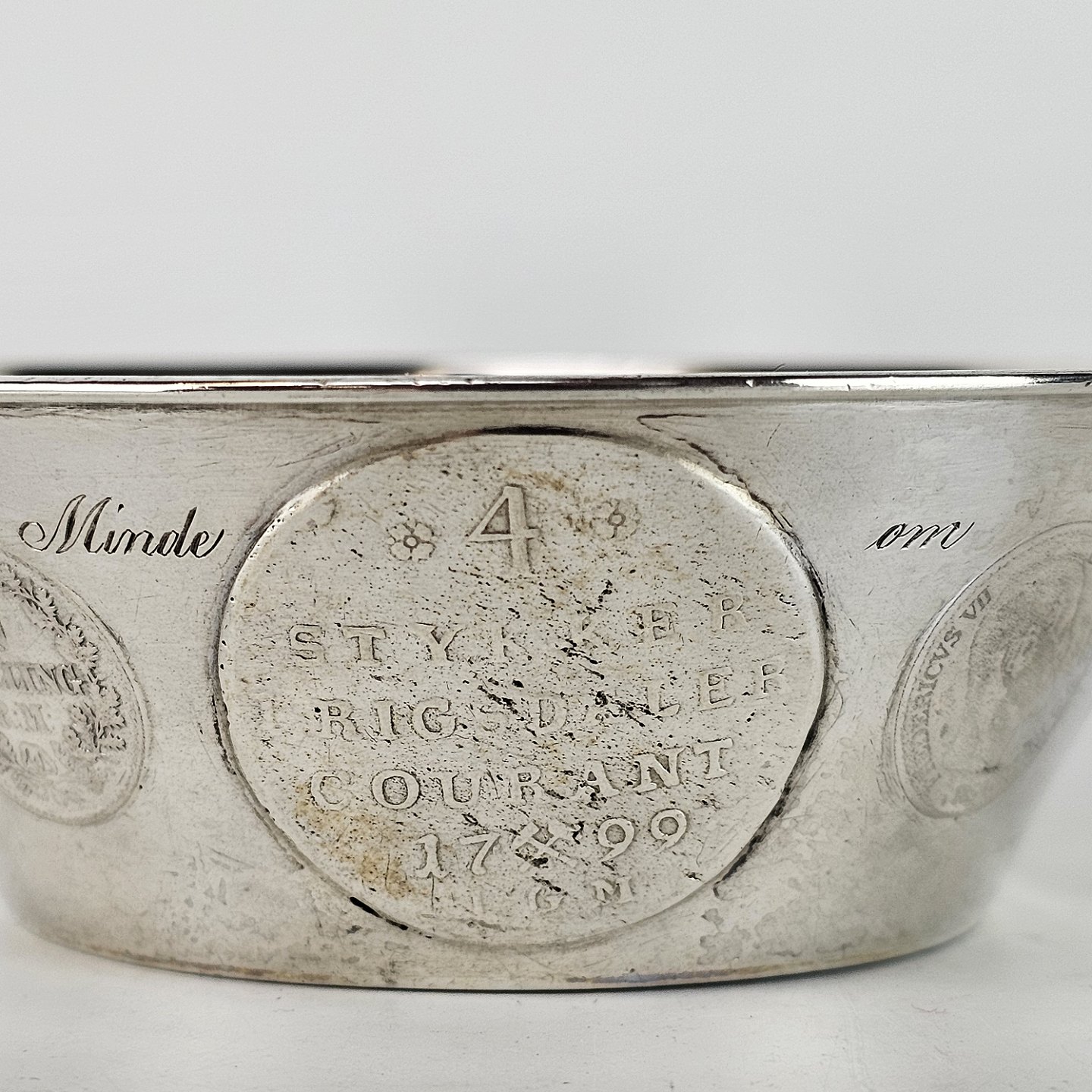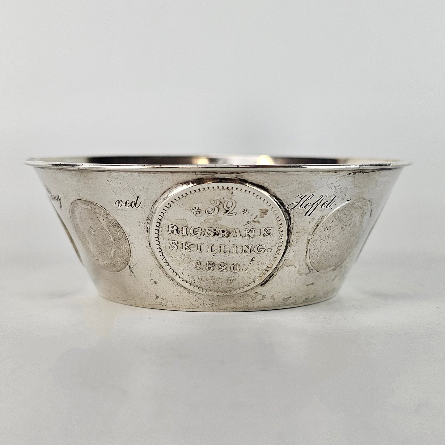 Bæger af sølv med otte gamle indsatte mønter.
