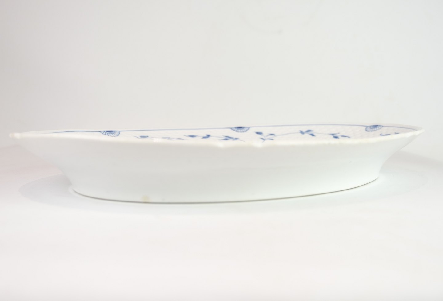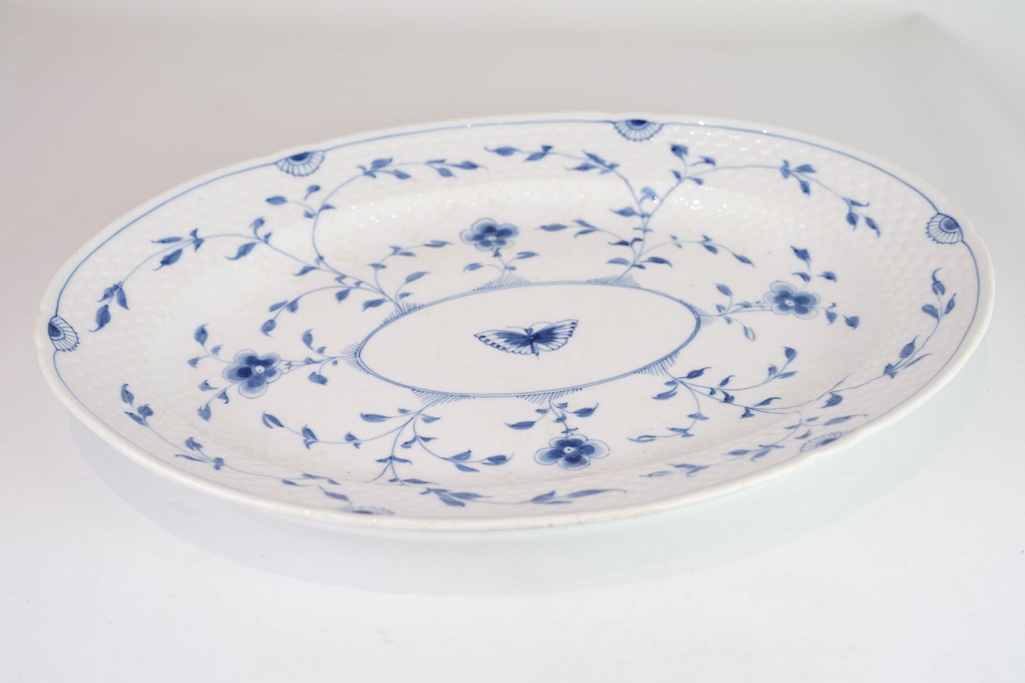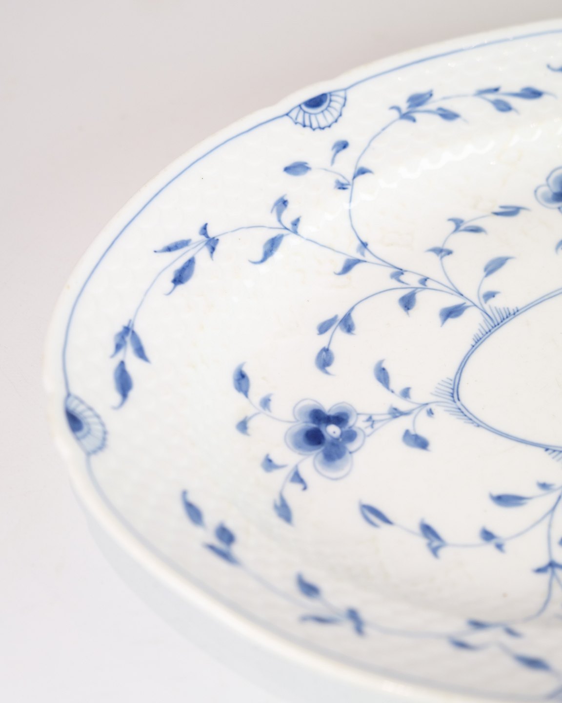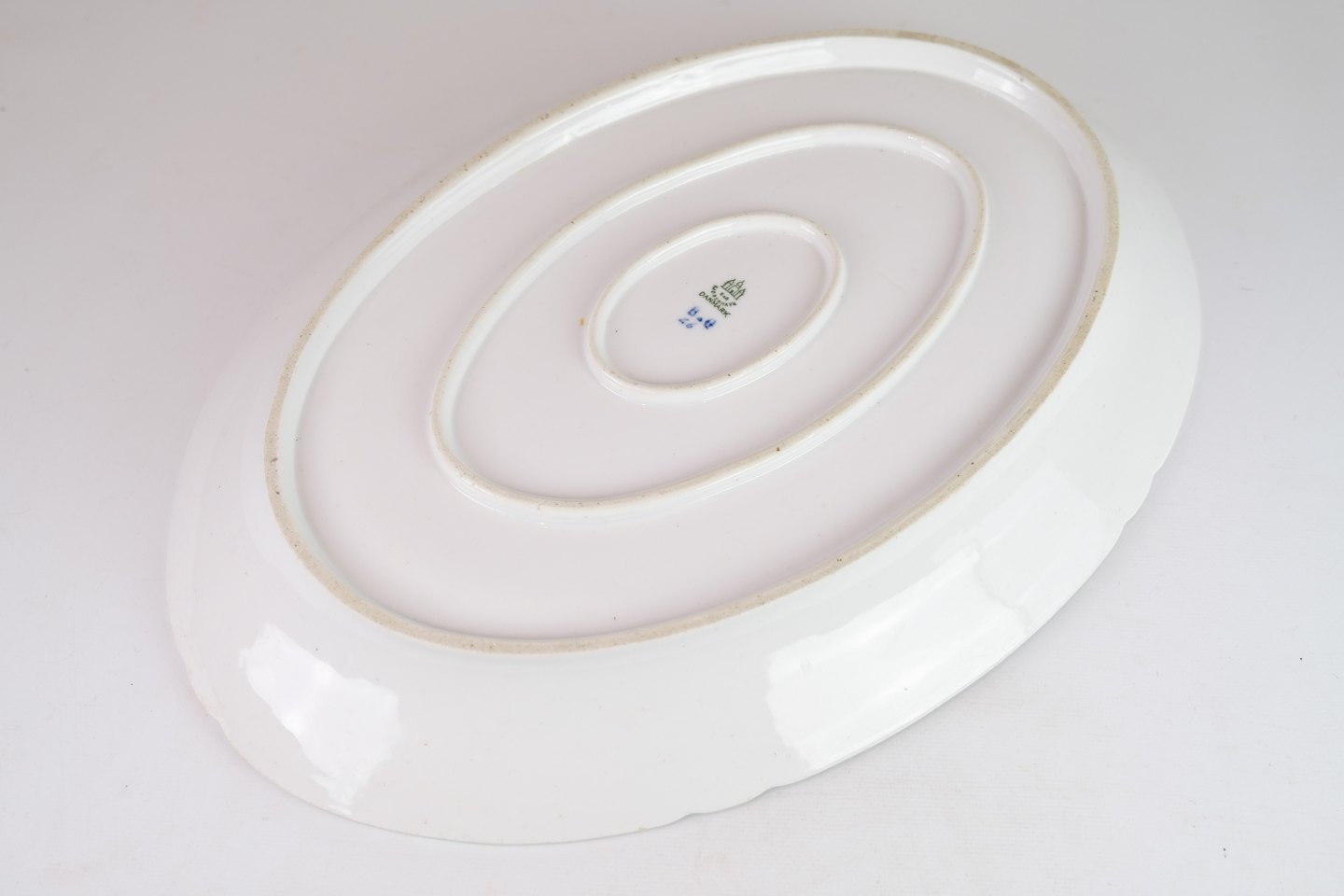 Stort ovalt fad, nr. 26, fra Bing & Grøndahl. Udført i porcelæn med håndmalet sommerfuglmotiv, med stempel i bunden.