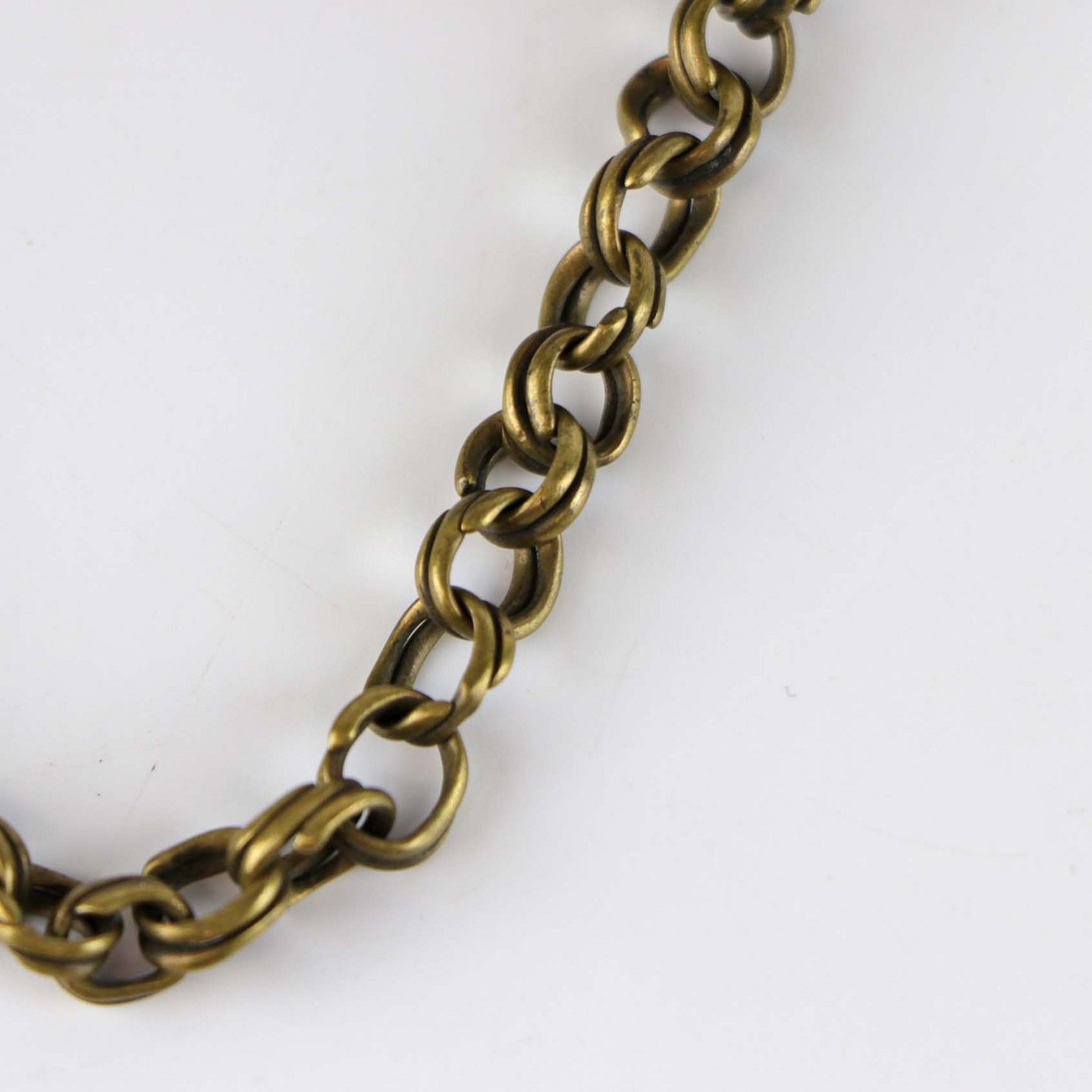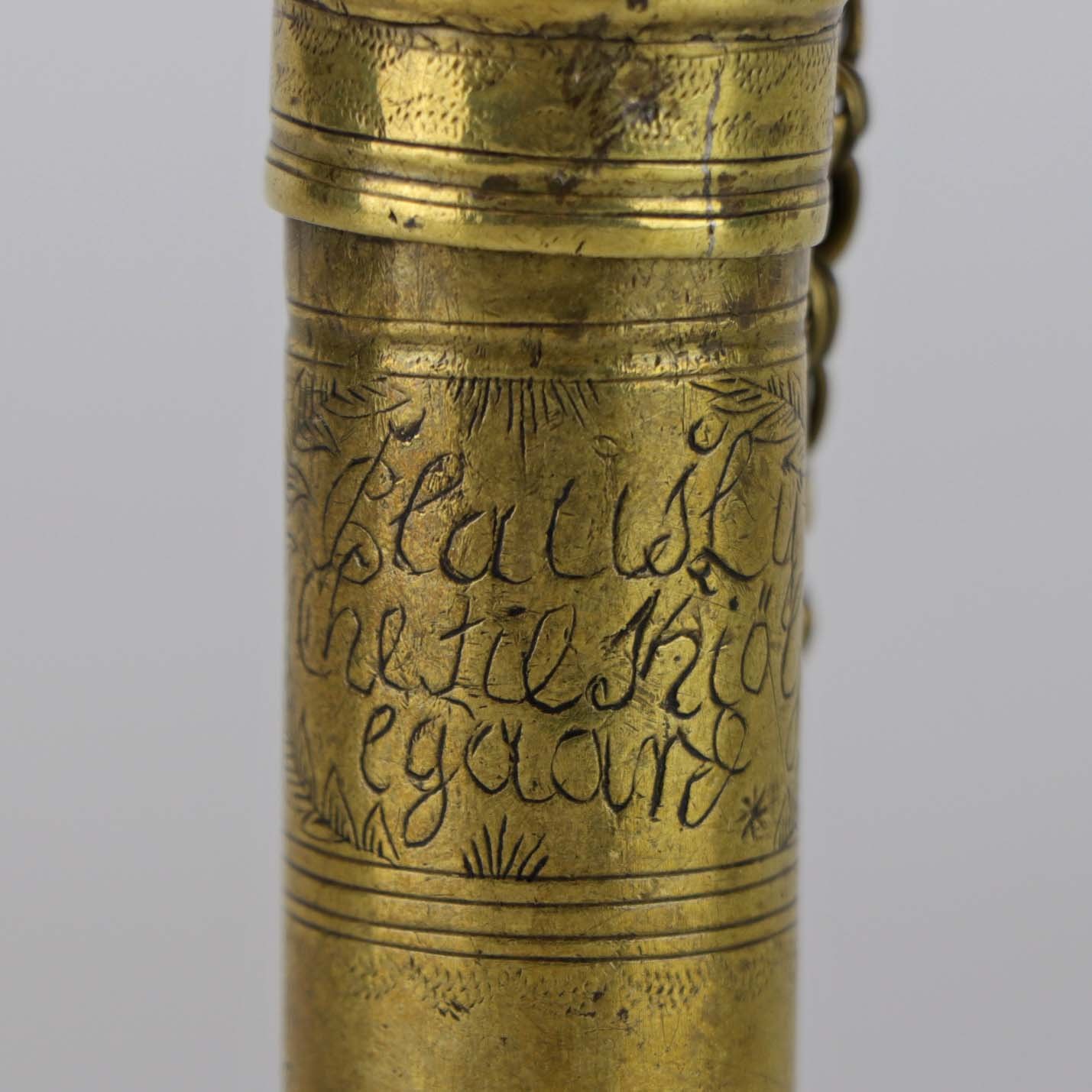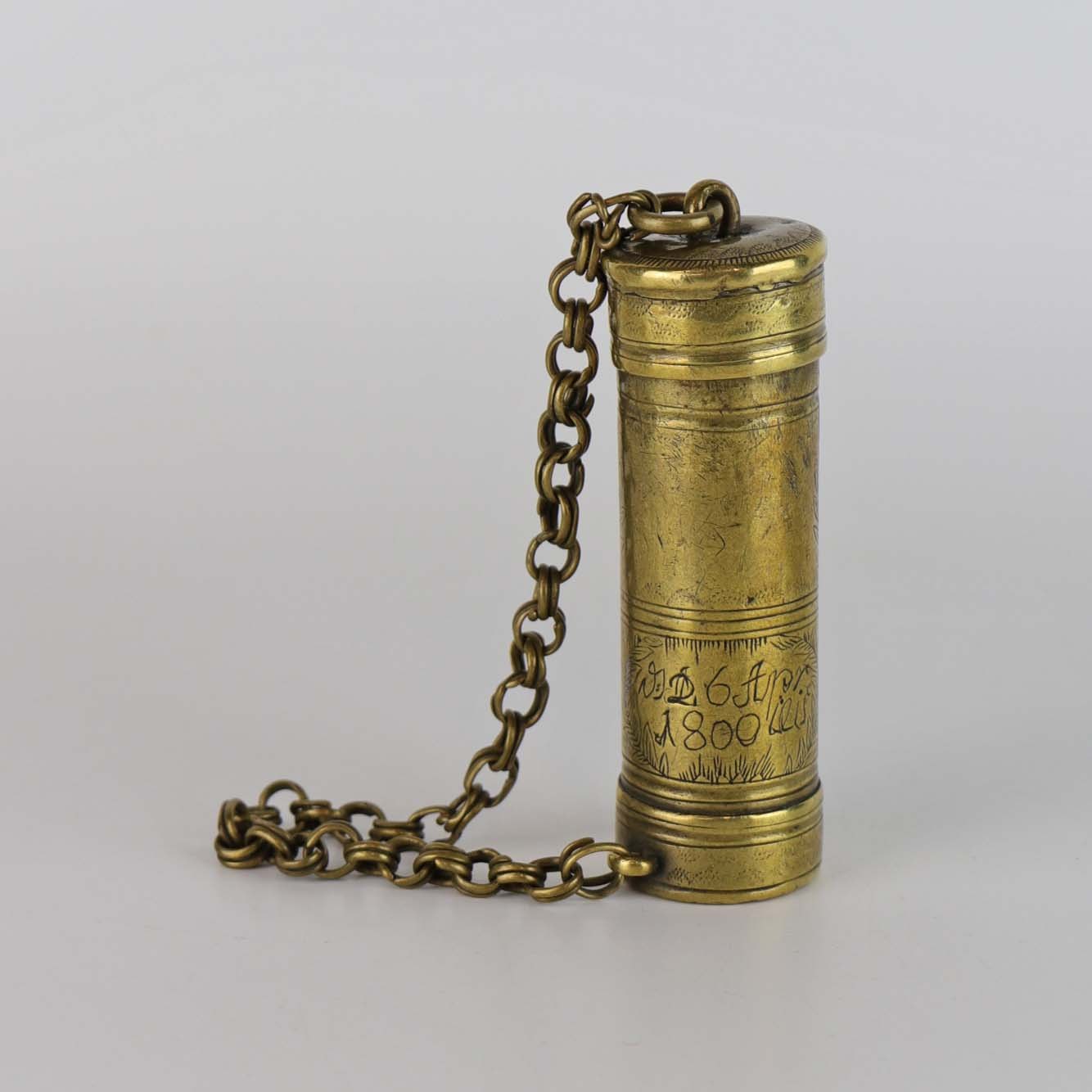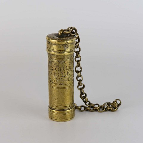 Antik tobakshylster i solid messing med kæde og tekst fra 1800-tallet