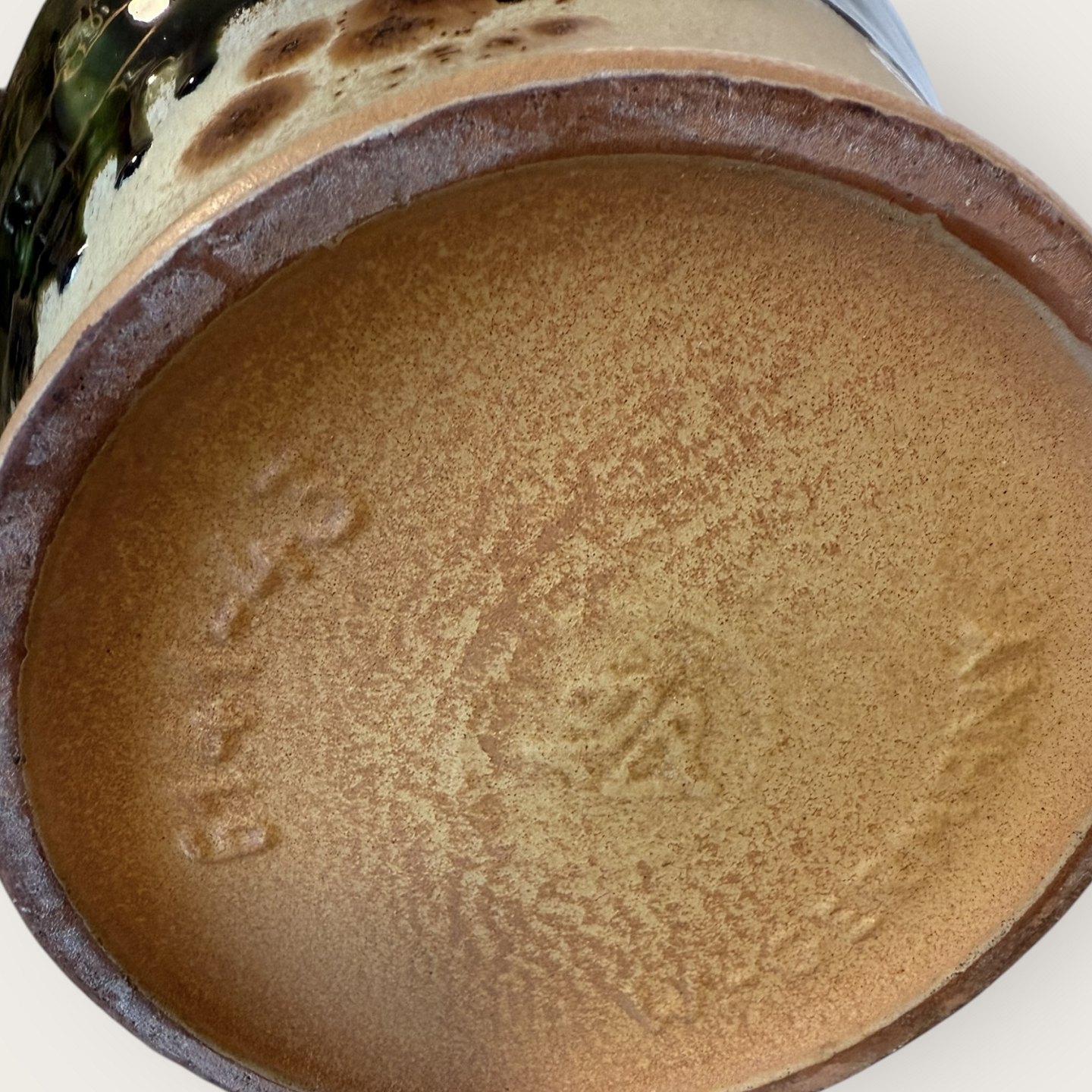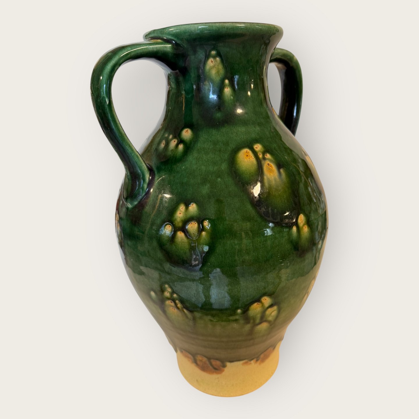 Stor gulvvase fra West Germany med grøn løbeglasur, Rigtig pæn stand dog en meget lille ujævnhed / afslag ved bunden (se foto), Højde 44 cm