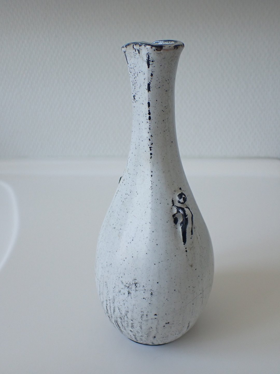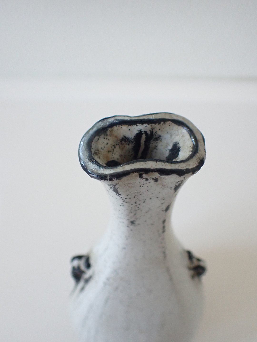 Svend Hammershøj (1873 - 1948) for Kähler. Slank keramikvase i sort/hvid dobbeltglasur(askeglasur) med små dekorative "øre", Stemplet HAK. Højde: 19,5 cm. I pæn stand med mikroskopisk glasurafslag på øverste kant. HAK-mærket næsten usynlig.