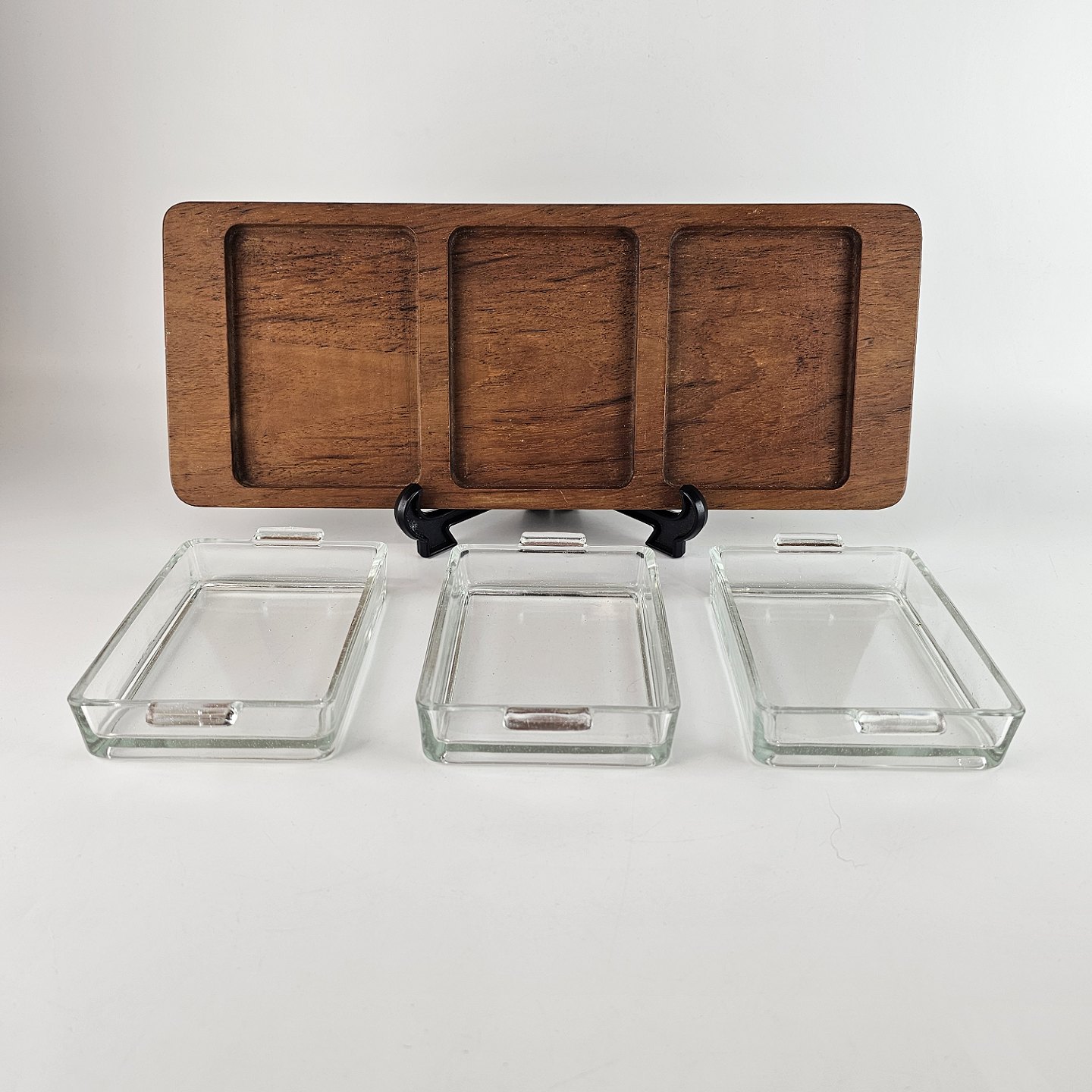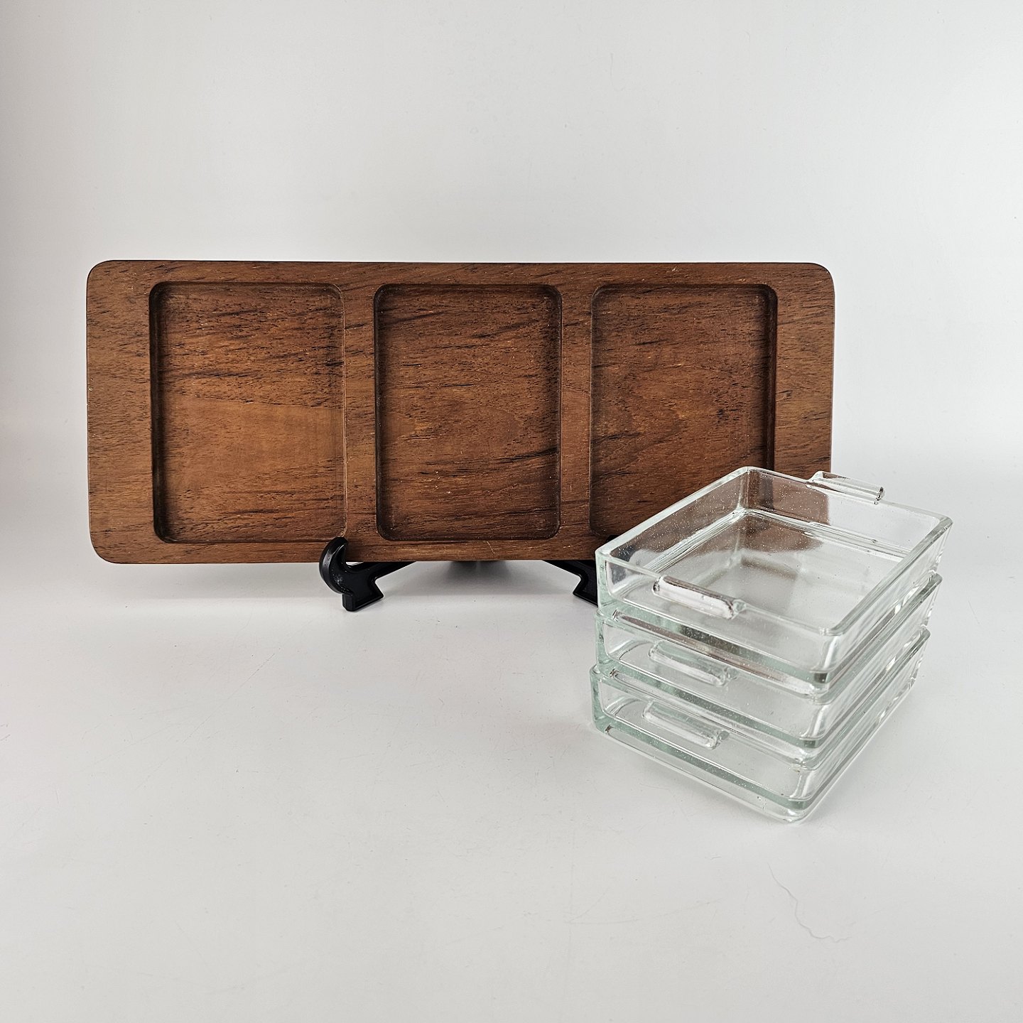 Cabaret fad i teaktræ, med tre skåle af glas.