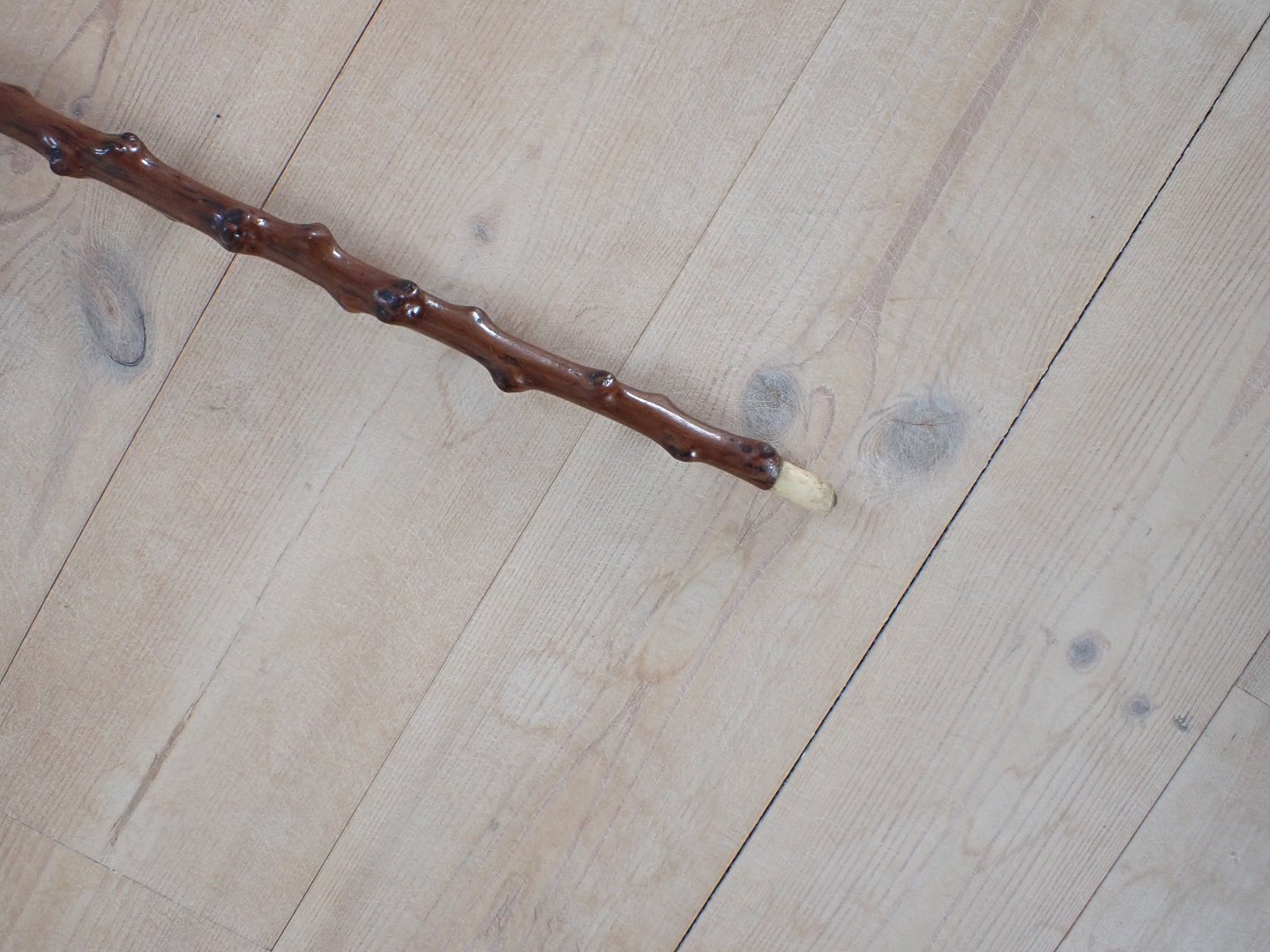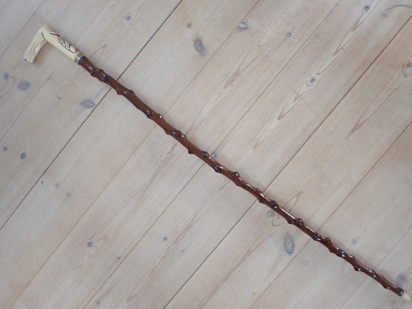 Stok med greb af udskåret ben med en agerngren fæstet til en tjørnestok med et dekoreret messingbånd og med dupsko af horn. Engelsk? Ca. 1900. Længde: 81,5 cm. I pæn tidstypisk stand med en enkelt tørrerevne i træet.