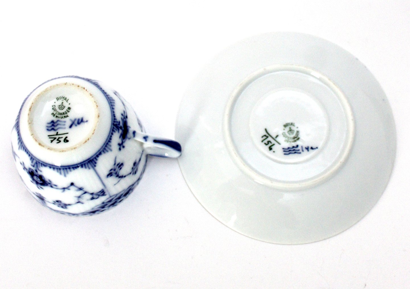 Royal Copenhagen, Musselmalet halvblonde. Kaffekop med underkop. Nr. 1/756. Højde 6 cm. Diameter 7,4 cm. Kaffekop II. sortering. Underkop I. sortering. Pris: 150 kr. stk. Lager: 2