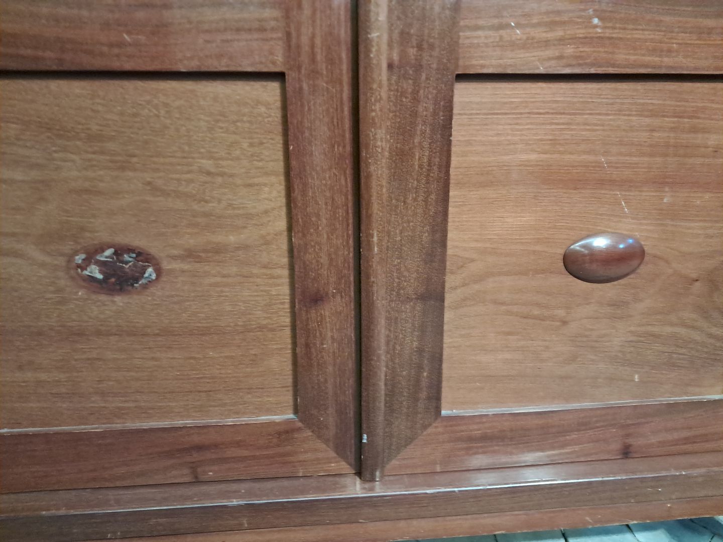 Det har brugsspor og mangler et prydstykke på venstre låge.