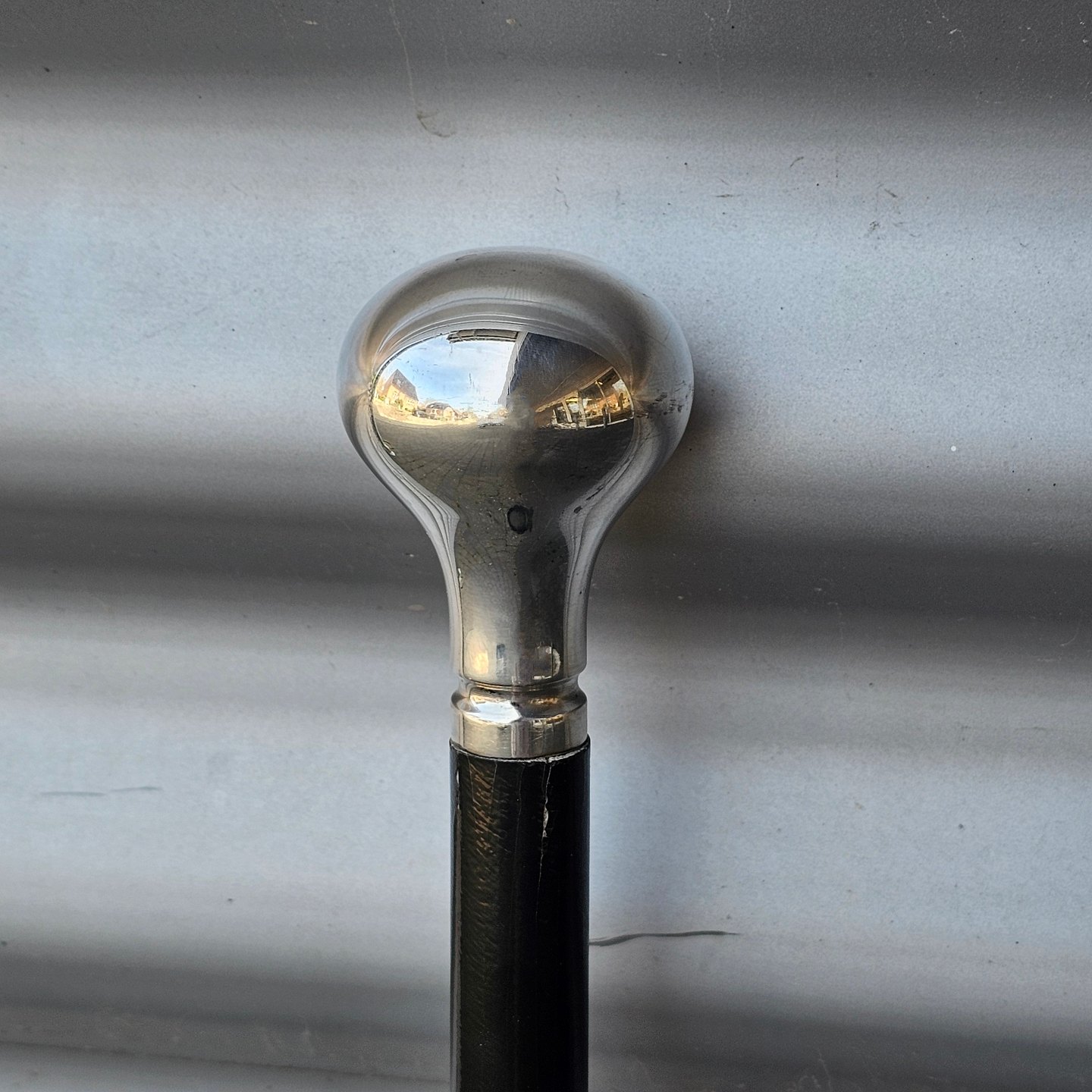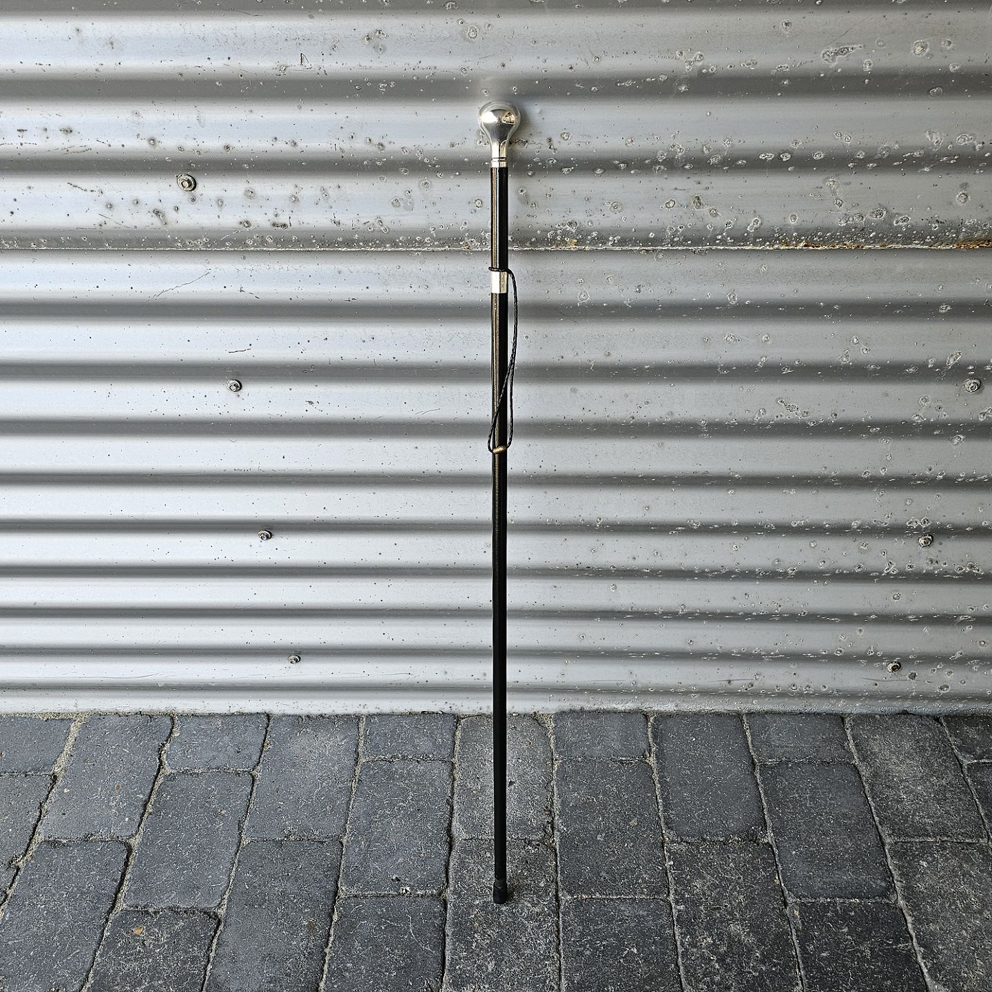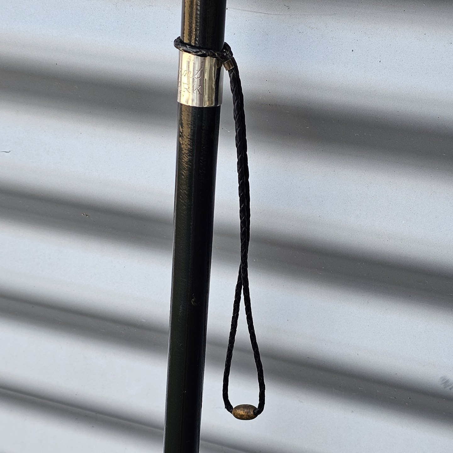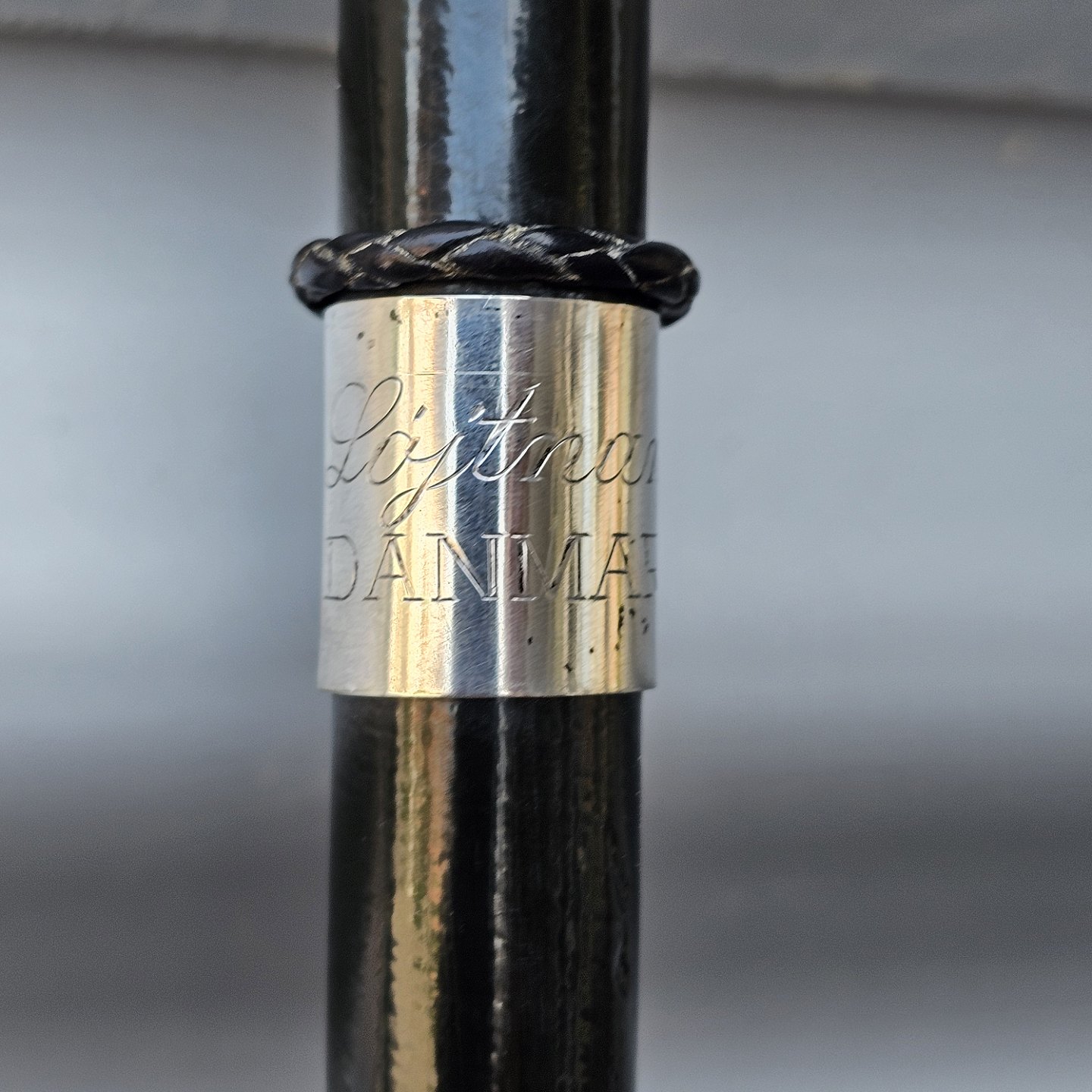 Kulfiber stok med knop af sterlingssølv og læderrem. Indskription på sølvet: Løjtnant Danmark
