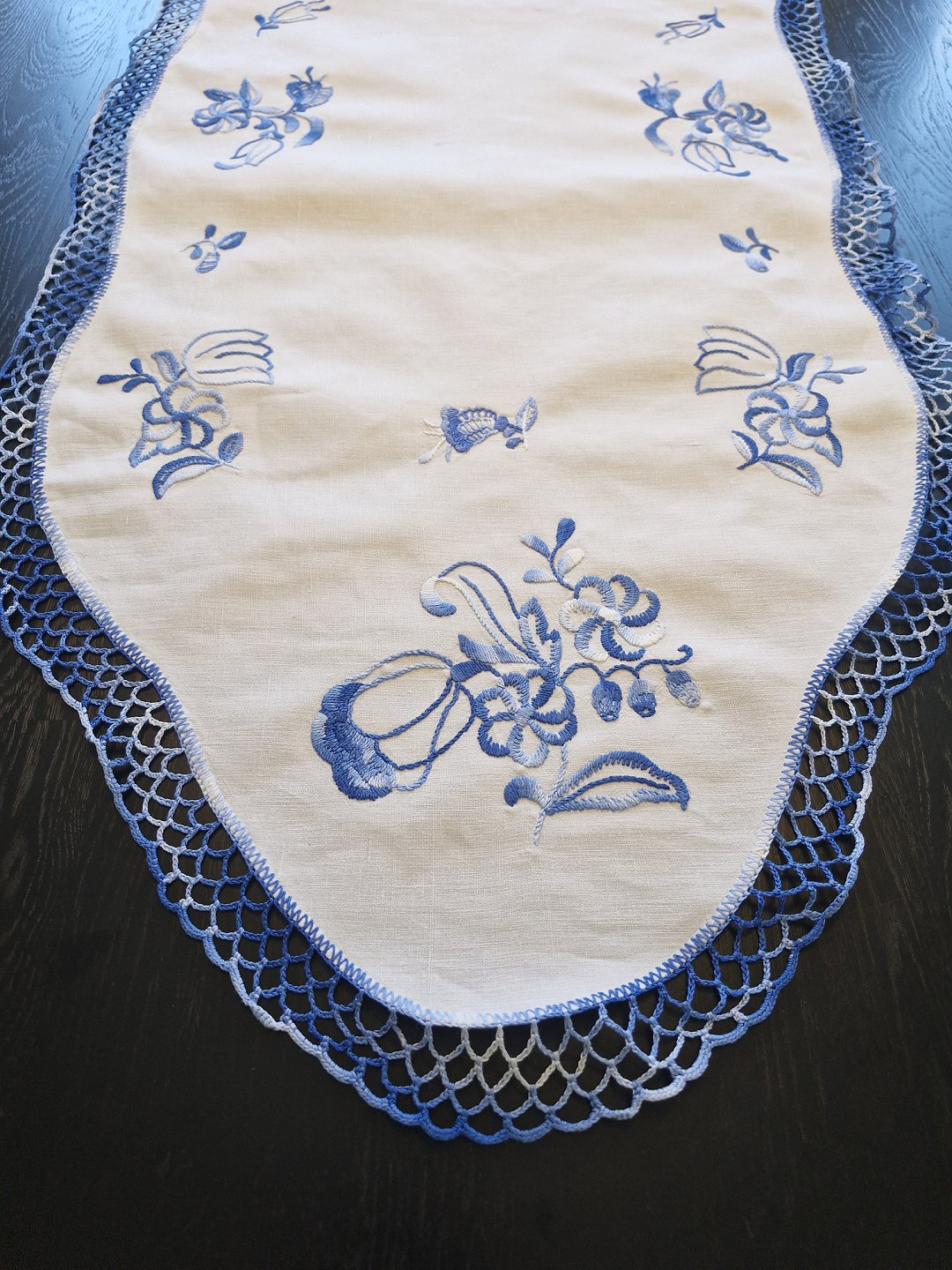 Bordløber smukt broderet med blå blomster 48 x 135 cm.