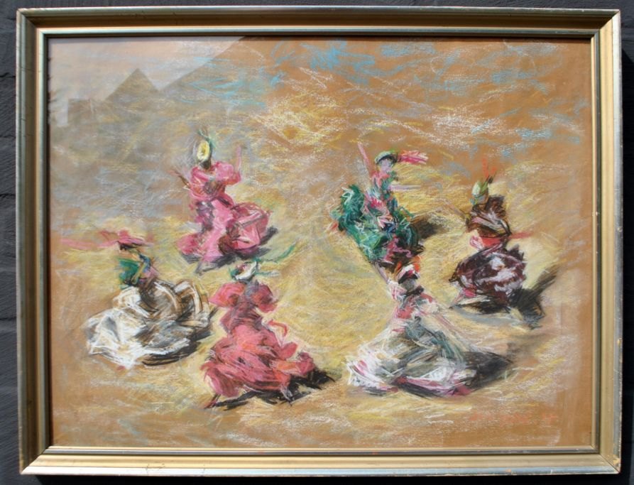 Stuhr, William Siiger (1882 - 1958) Danmark: Flamingo dansende kvinder. Pastel på brunt papir. 46 x 61 cm. Signeret 1937.