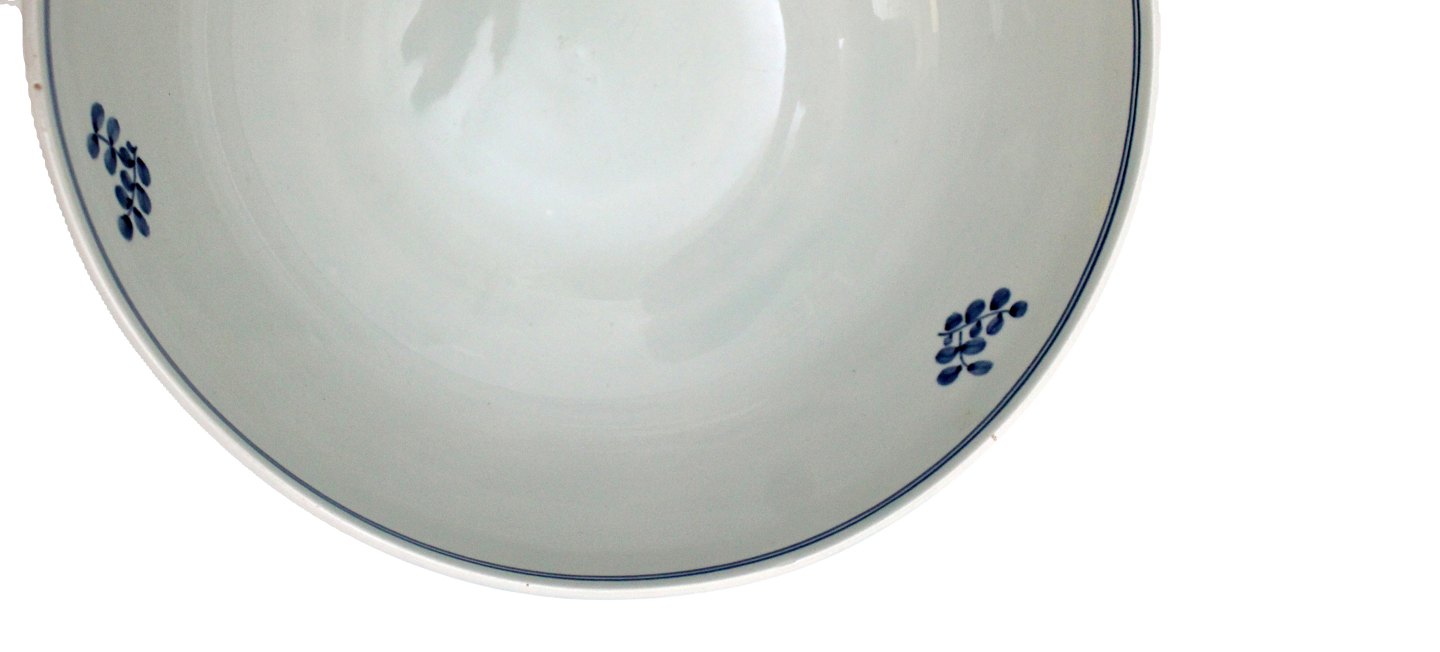 Aluminia, Tranquebar lyseblå fajance med mørkeblå tulipan og flettet bort designet af Christian Joachim. Produceret fra 1914 til 1969, hvor det overgik til Royal Copenhagen. Håndmalet.