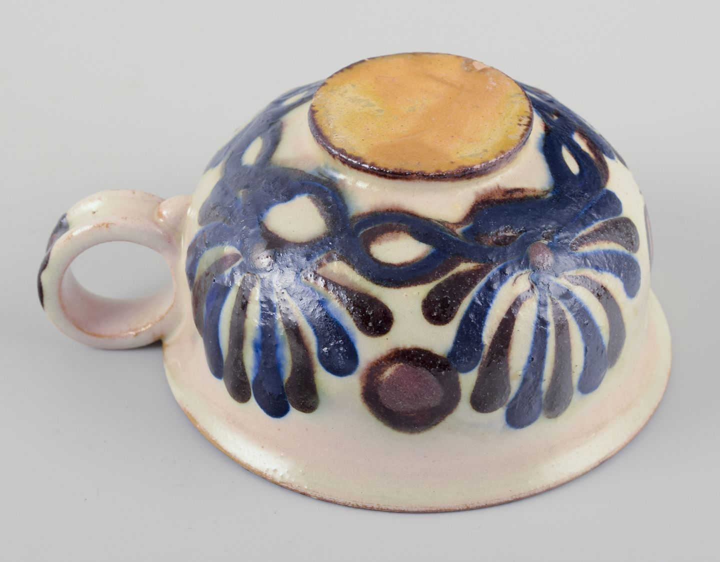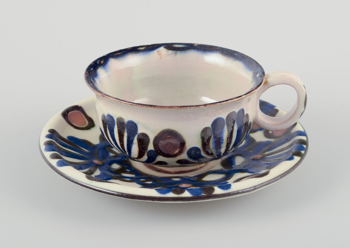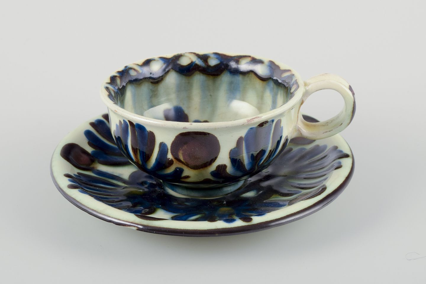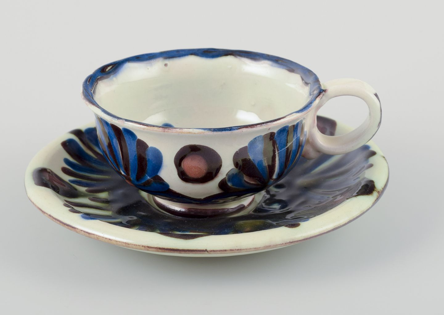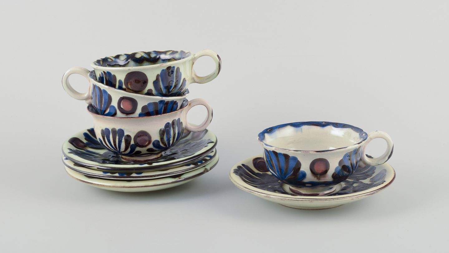 Nils Joakim Kähler for Kähler. Et sæt på fire ”Marguerit” tekopper og underkopper af glaseret stentøj.