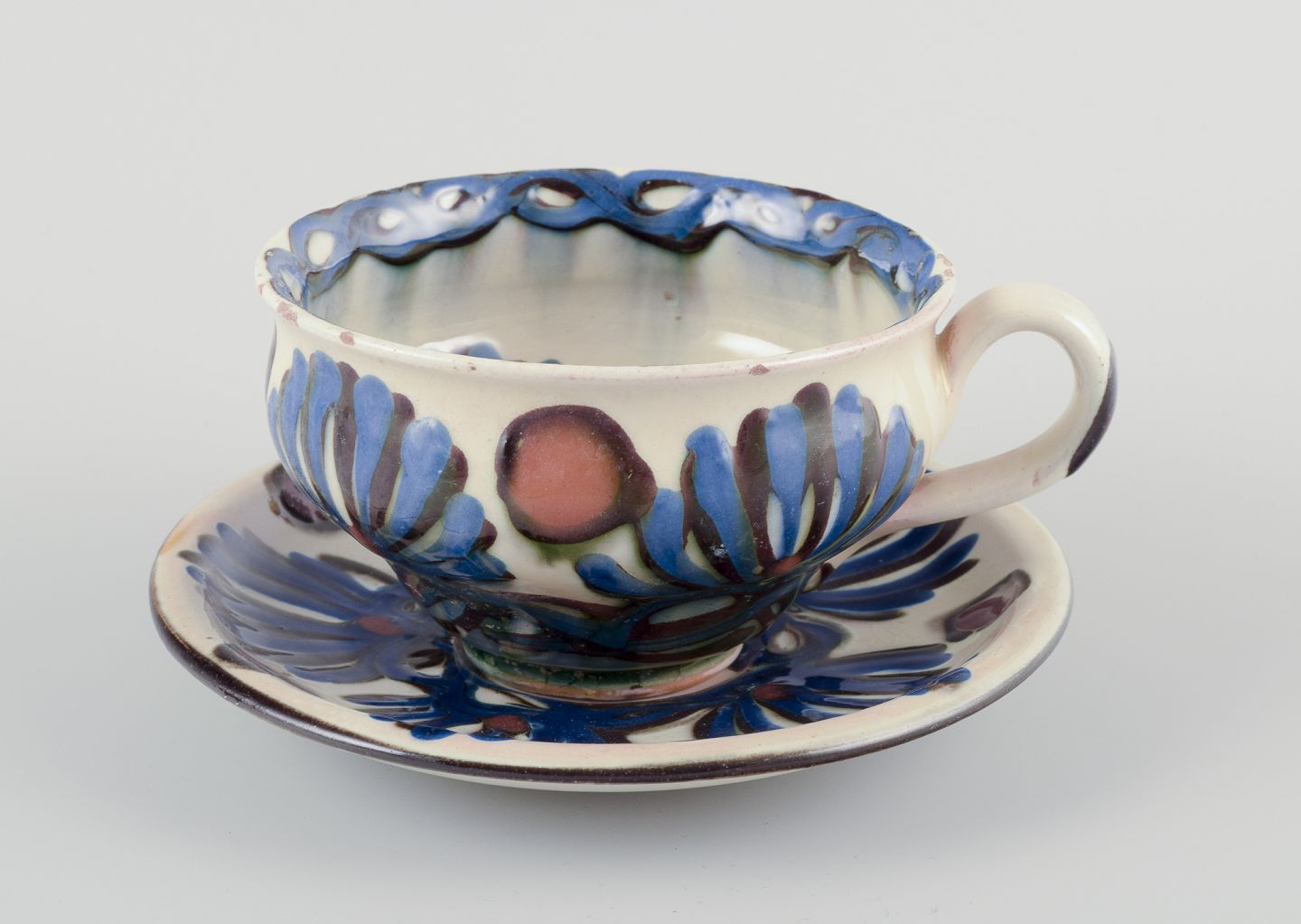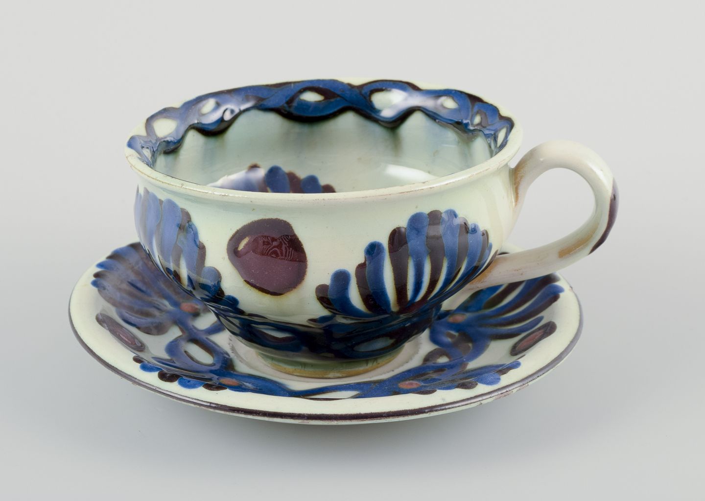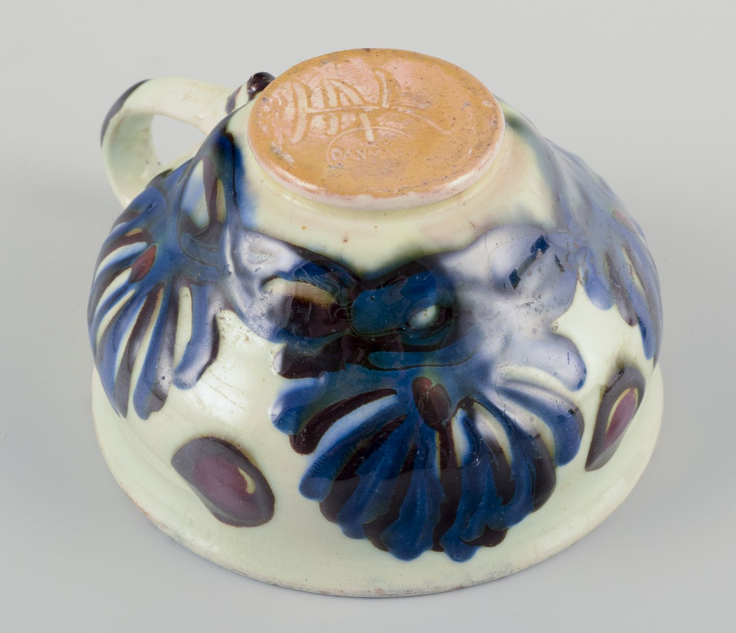 Nils Joakim Kähler for Kähler. Et sæt på fire store ”Marguerit” tekopper og underkopper af glaseret stentøj.