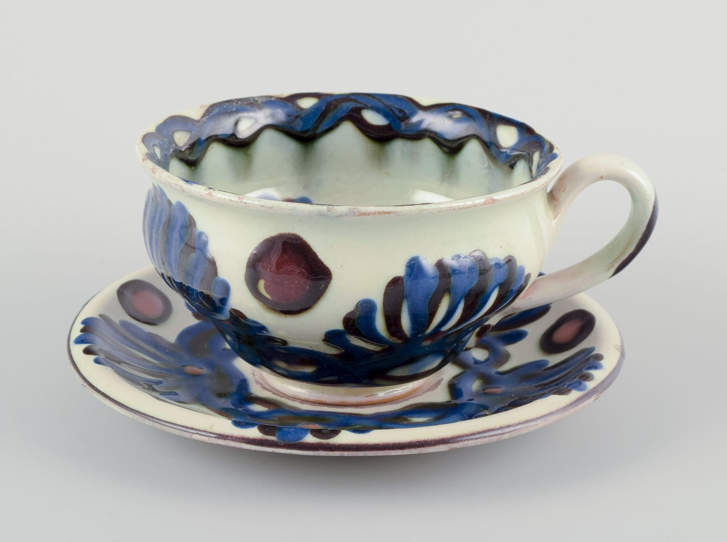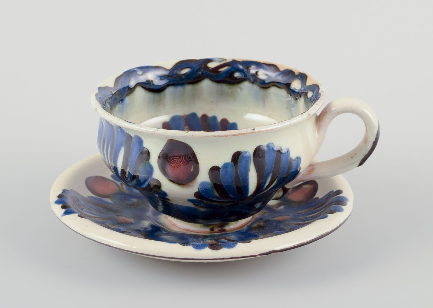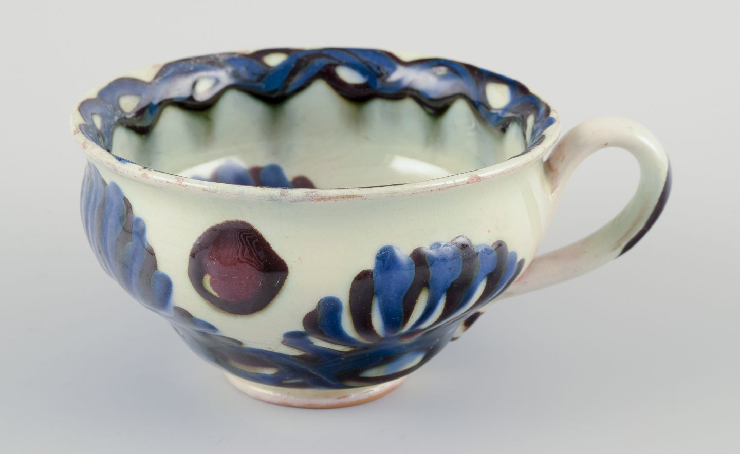 Nils Joakim Kähler for Kähler. Et sæt på fire store ”Marguerit” tekopper og underkopper af glaseret stentøj.