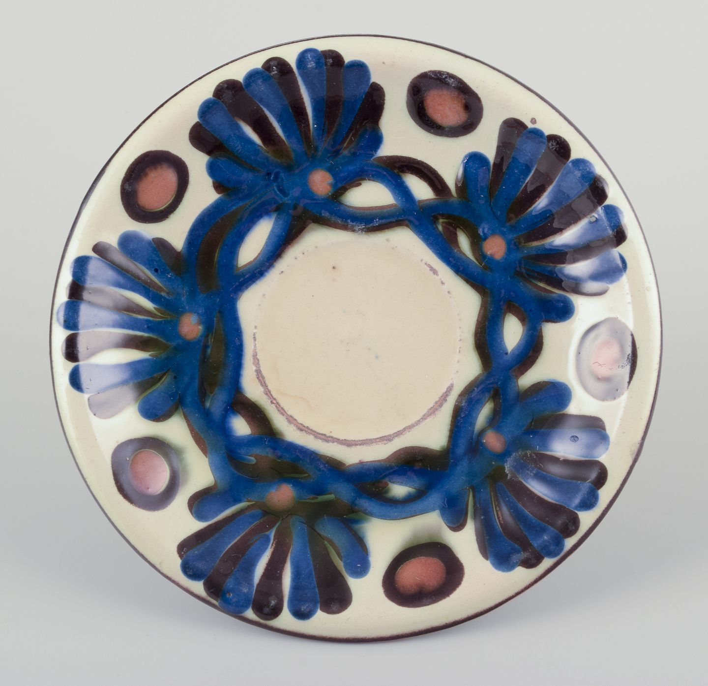Hånddekoreret i blåt og brunt på cremefarvet bund.