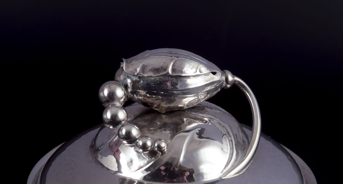Magnolia (also known as Blossom) is one of Georg Jensen’s most famous Art Nouveau tea and coffee set and flatware collections. It was originally designed by Georg Jensen in 1905 as part of his tea and coffee set, with the full flatware range launched in 1919. The collection celebrates natural forms with a magnolia bud that elegantly spirals up the handle and finishes in a floral knob. The series is also characterized by its distinctive hammered finish, creating a soft, moonlit glow.