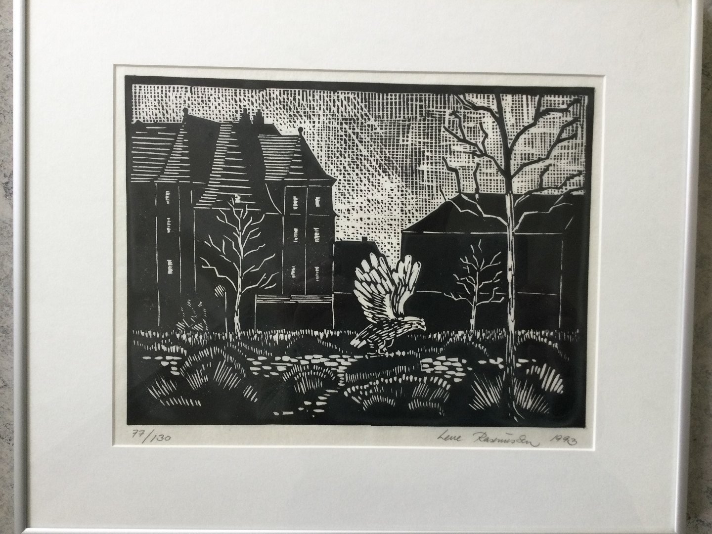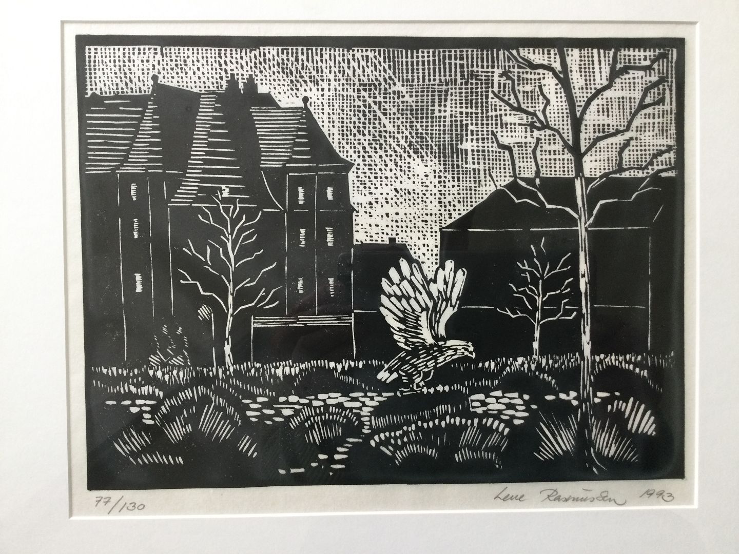Litografi af Lene Rasmussen - Bygninger og fugle 1993.
