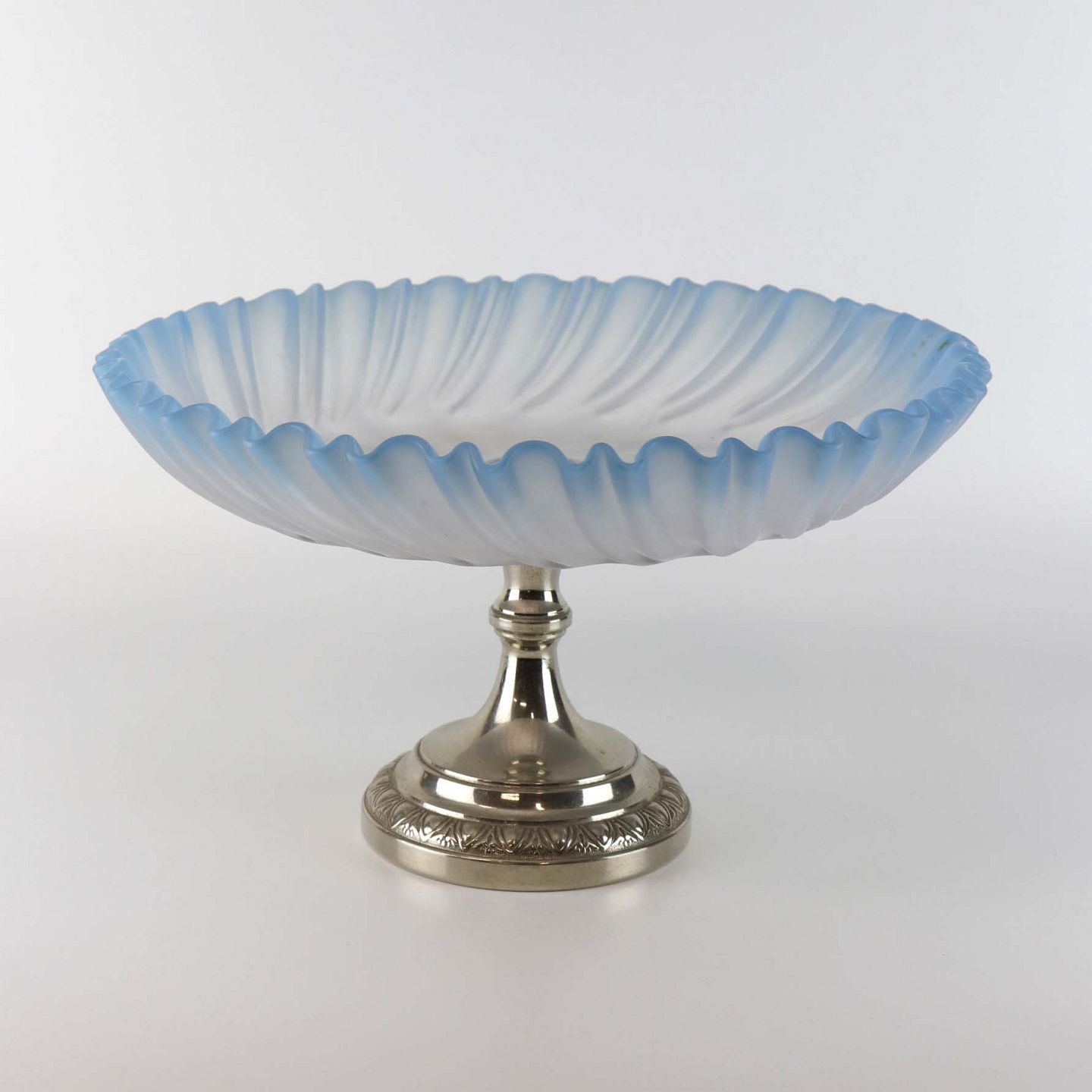 Visitkort holder i glas og metal. Holderen er udformet tåget hvidt glas med blå bølget kant sat på en fod af dekoreret metal. Dateret til år 1900-1910