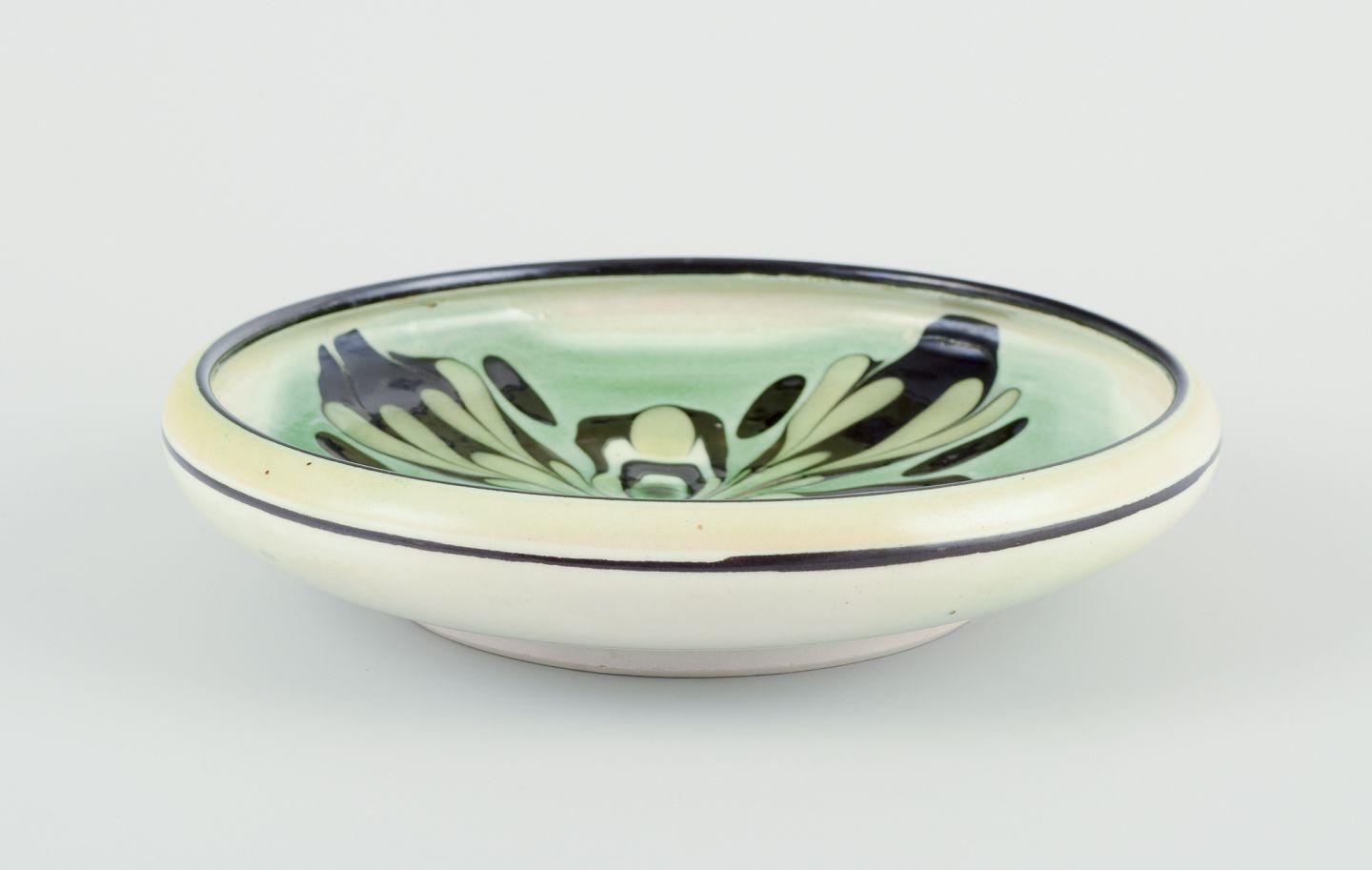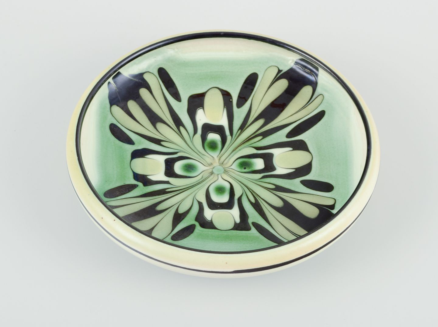 Keramikfad med blomstermotiv. Glasur i grønne og sorte toner.