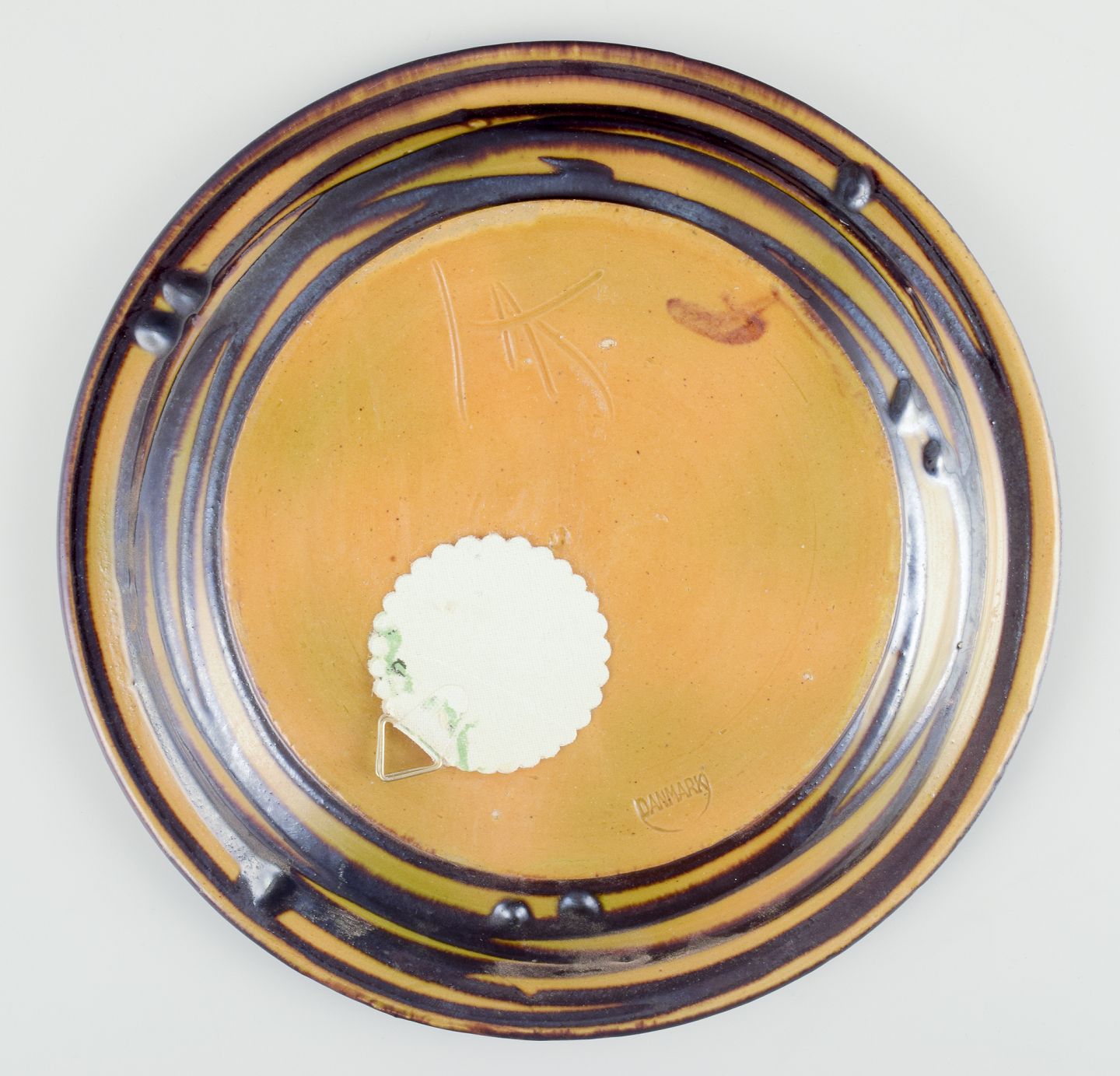 Fad/vægrelief af keramik med blomstermotiv. Glasur i grønne og sorte toner på okkergul bund.