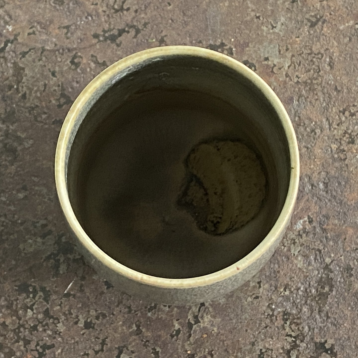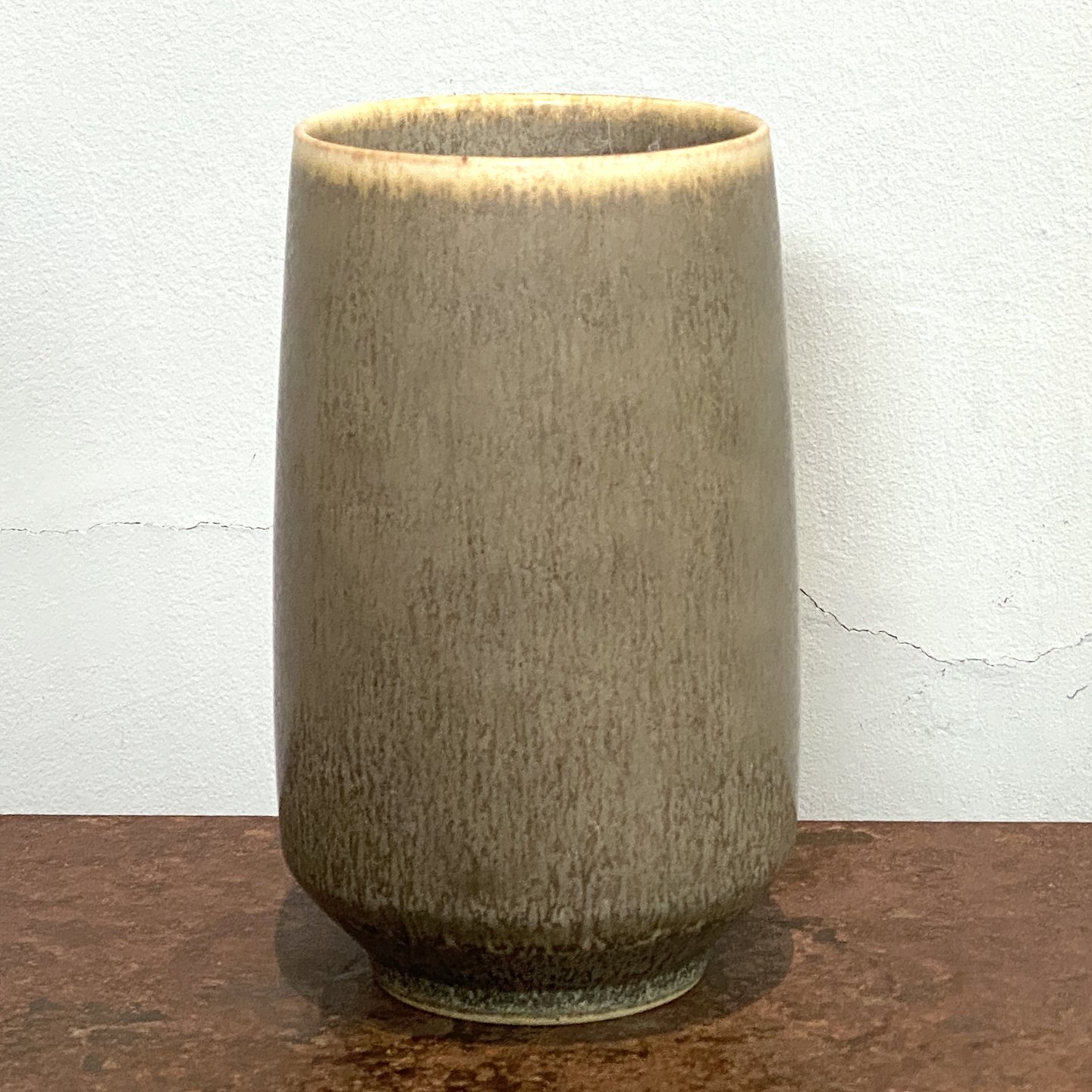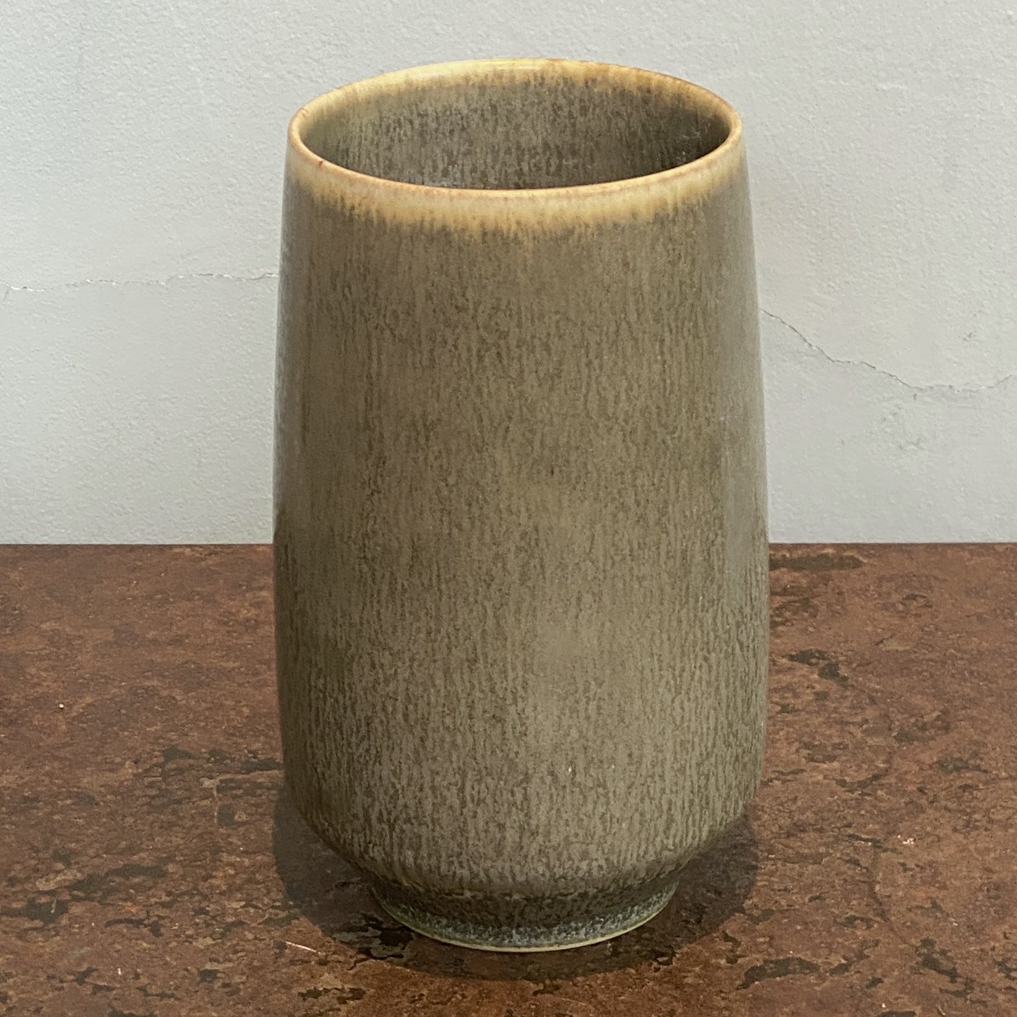 Palshus vase af stentøj med grågrøn harrepelsglasur.