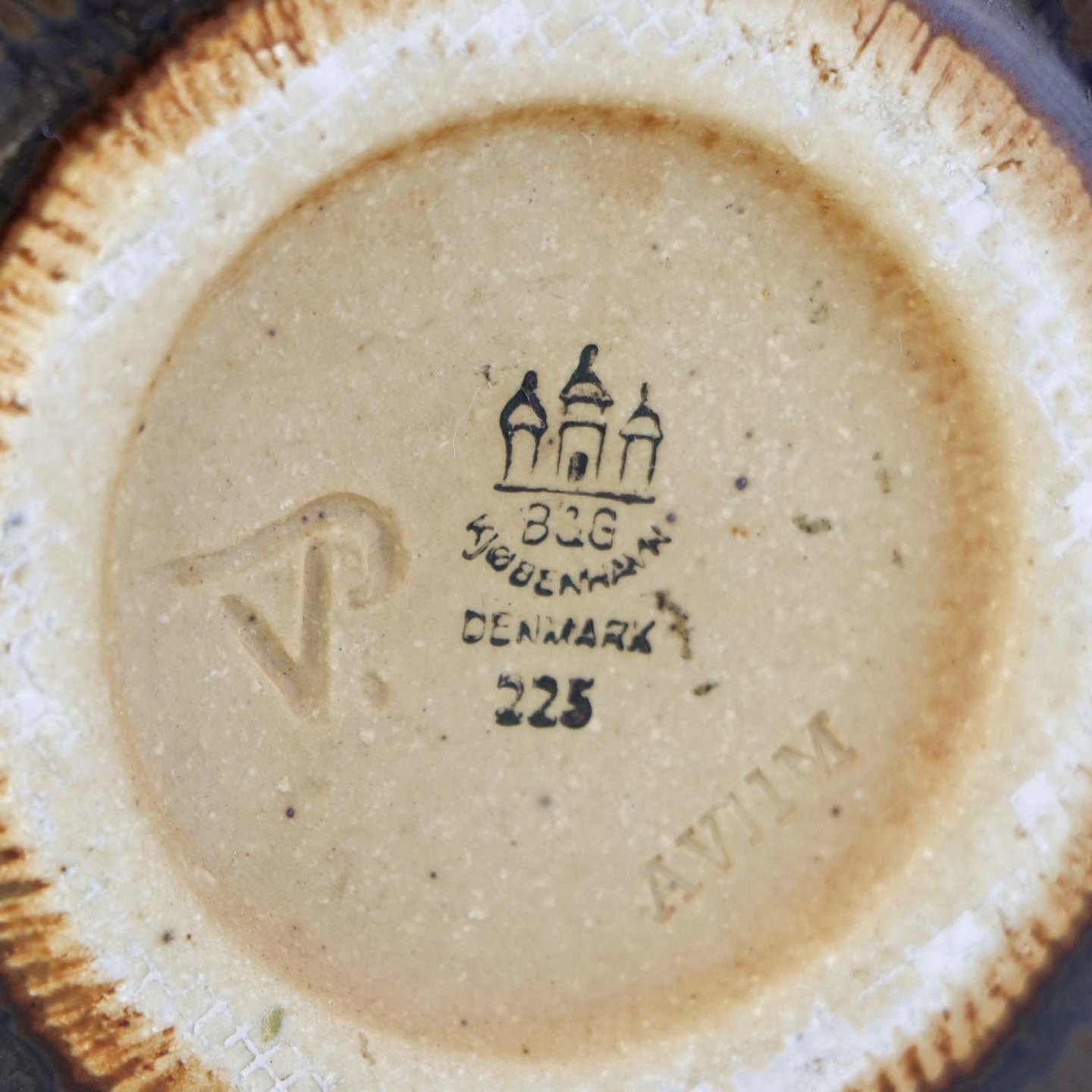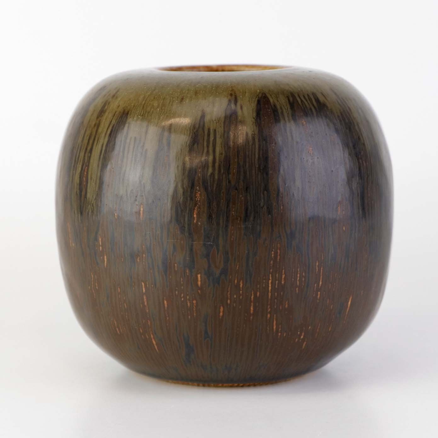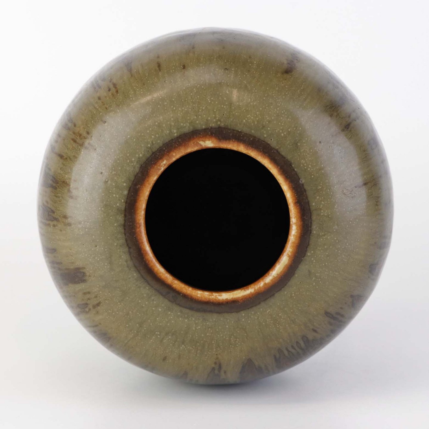 Rund kugleformet vase i stentøj med glasur i brunlige nuancer. Nr. 225