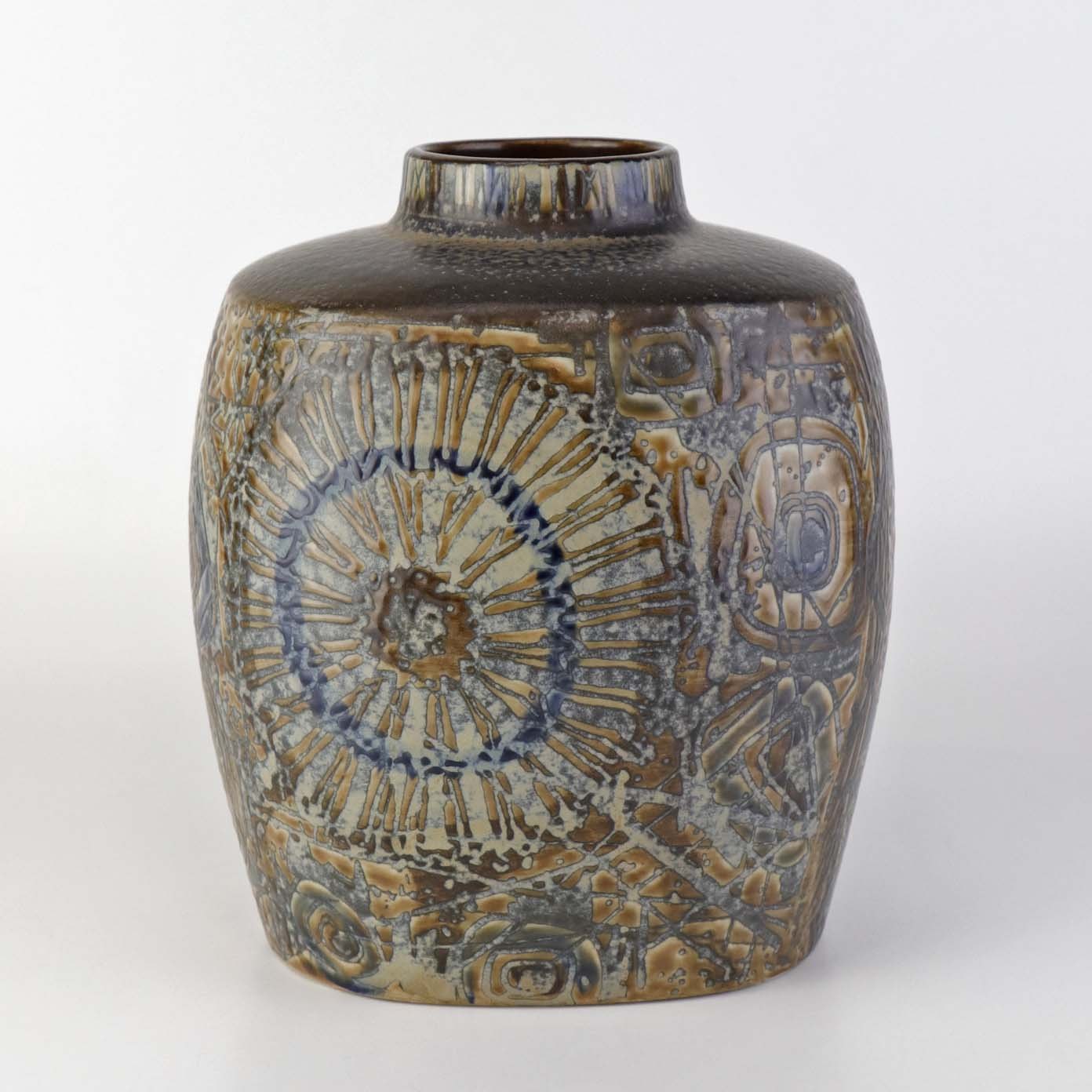 Kantet vase i fajance med mønster i brune nuancer. Nr. 870/3757