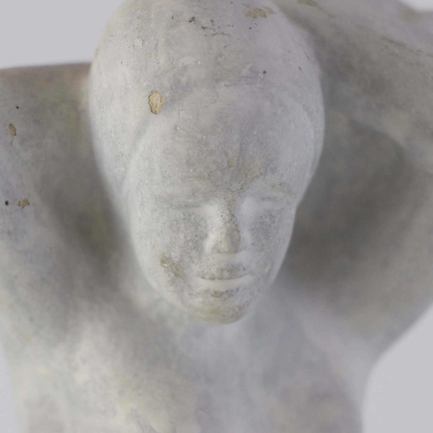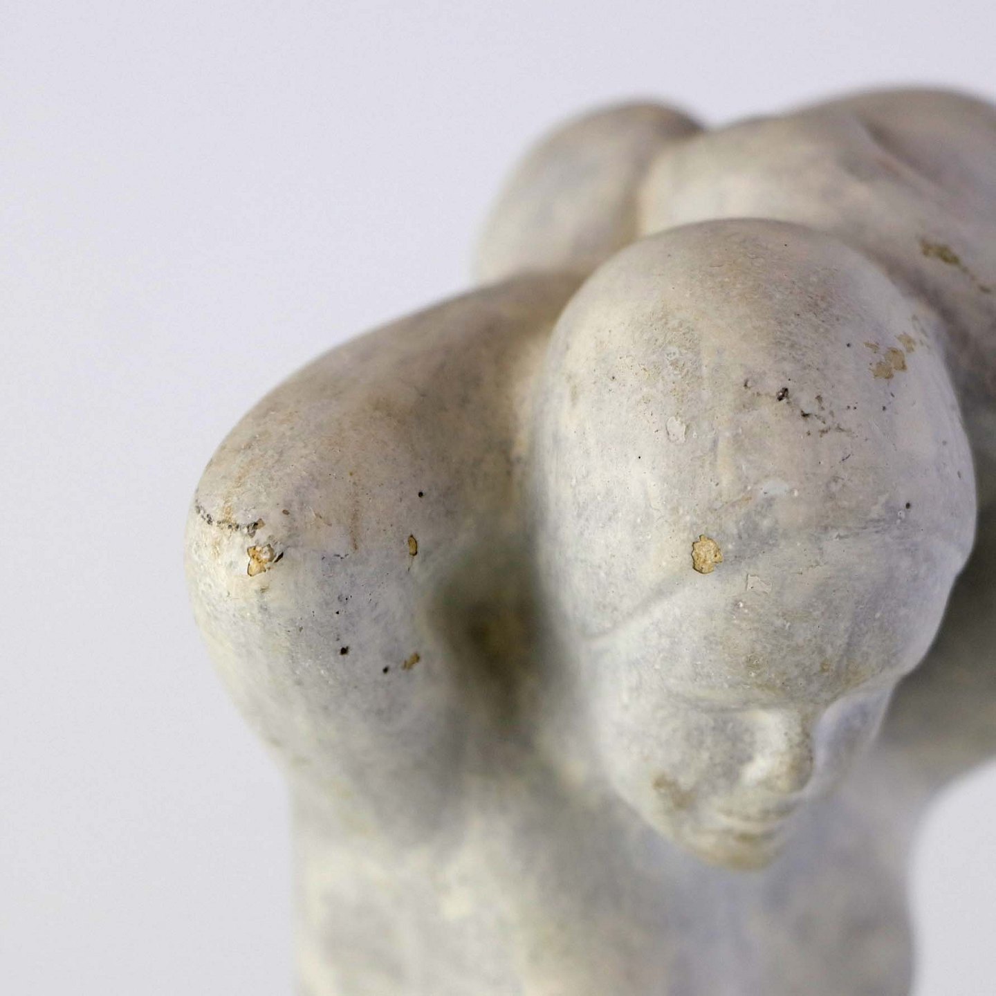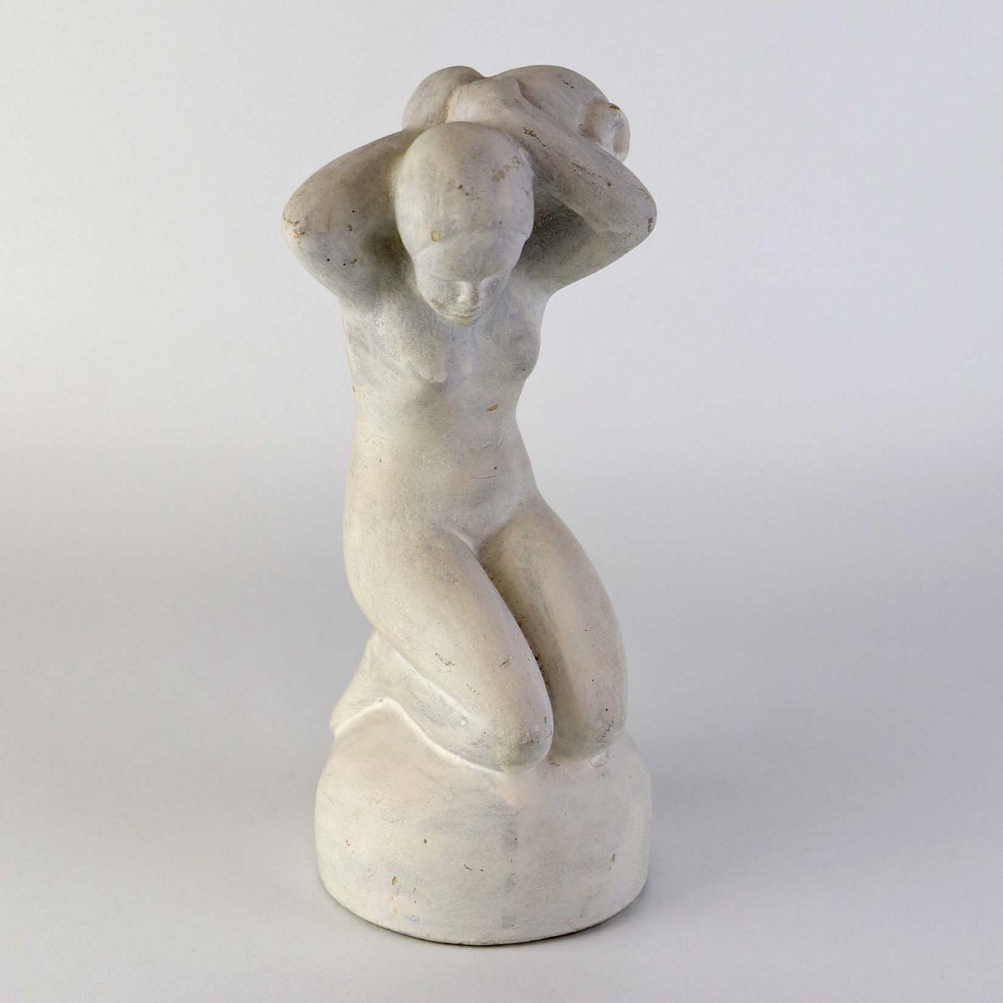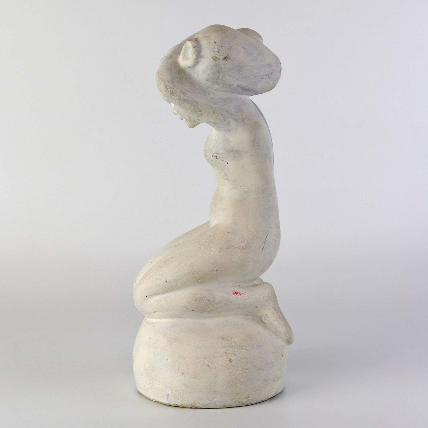Figur i hvidmalet sandsten med motiv af siddende kvinde med vandekrukke.