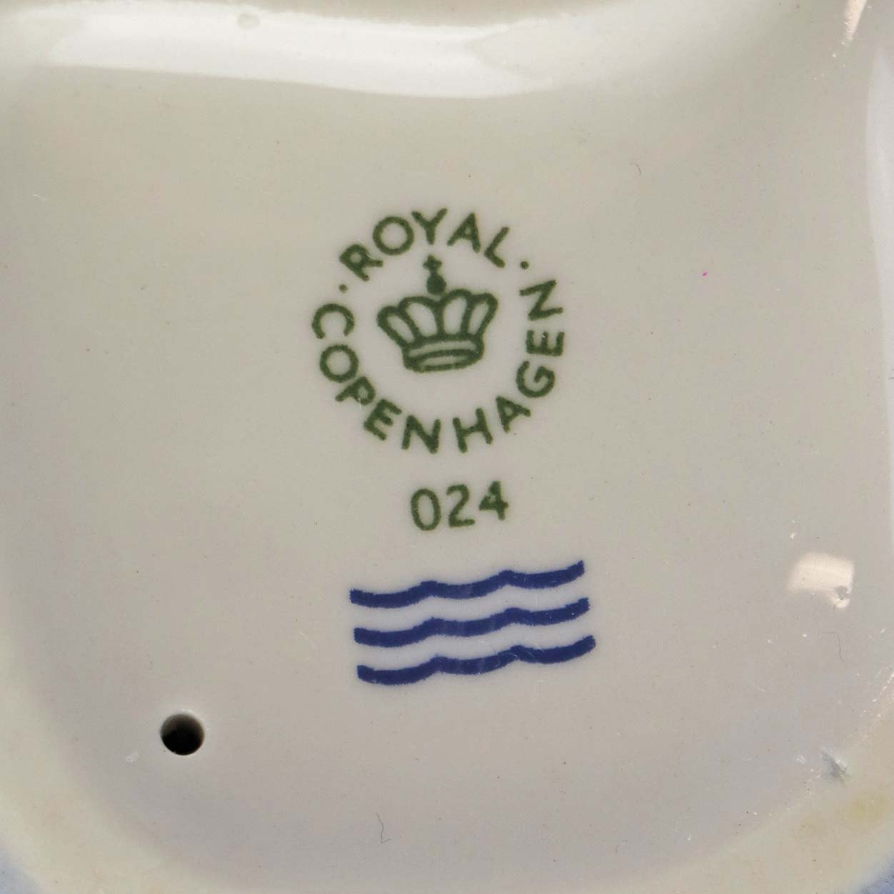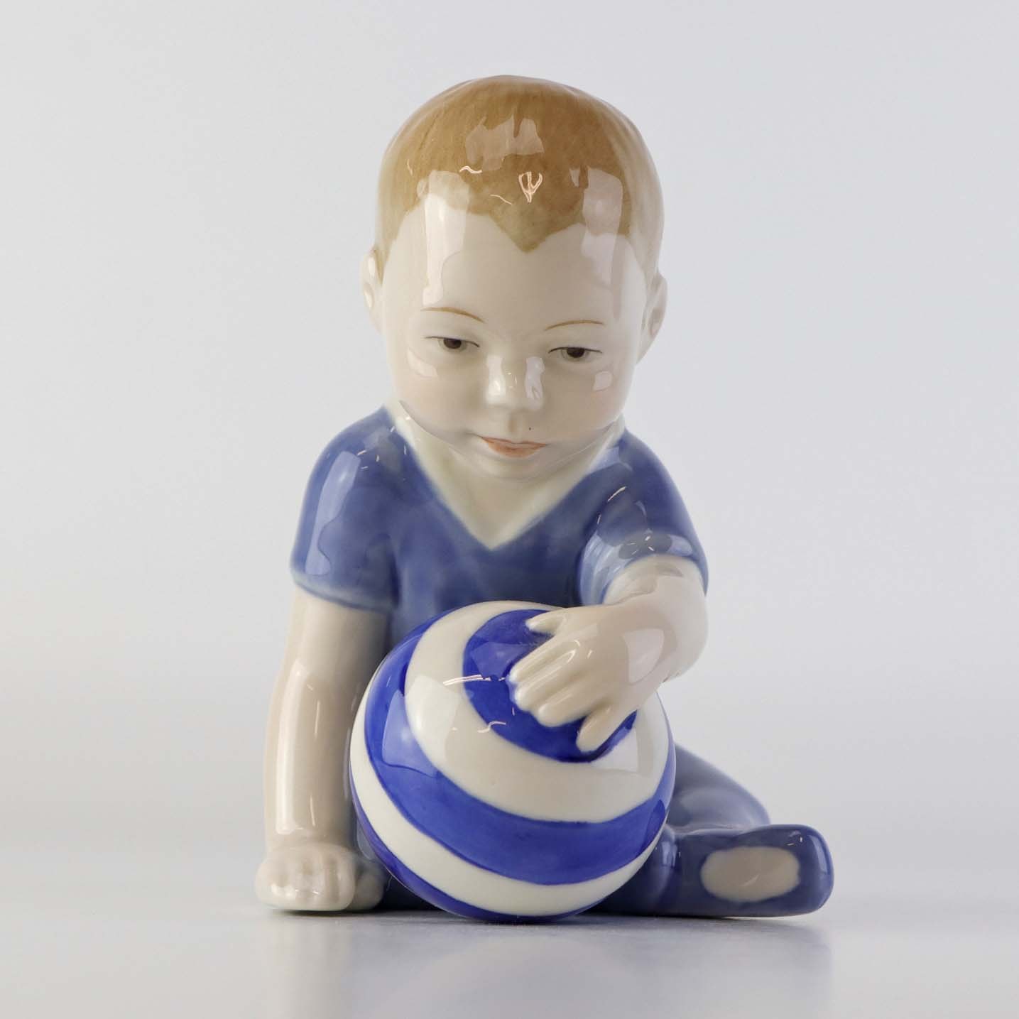 Figur i porcelæn med motiv af lille dreng siddende med sin blåstribede bold. Nr. 024