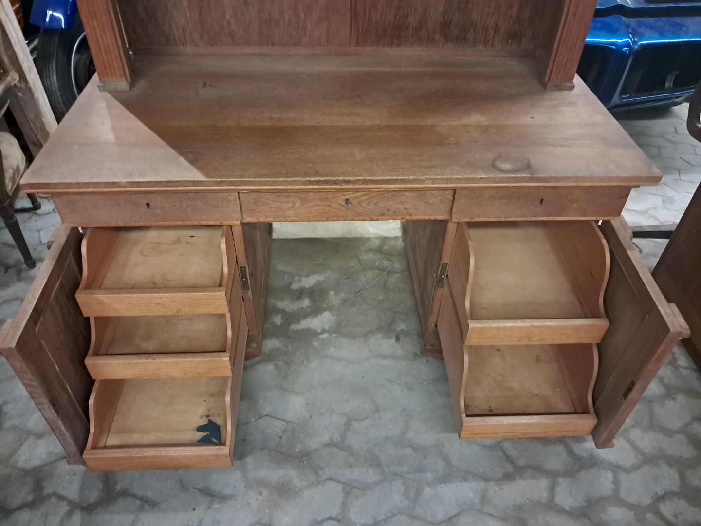 Text available in Danish: Skrivebord i fineret og massivt egetræ, fra 1920erne.