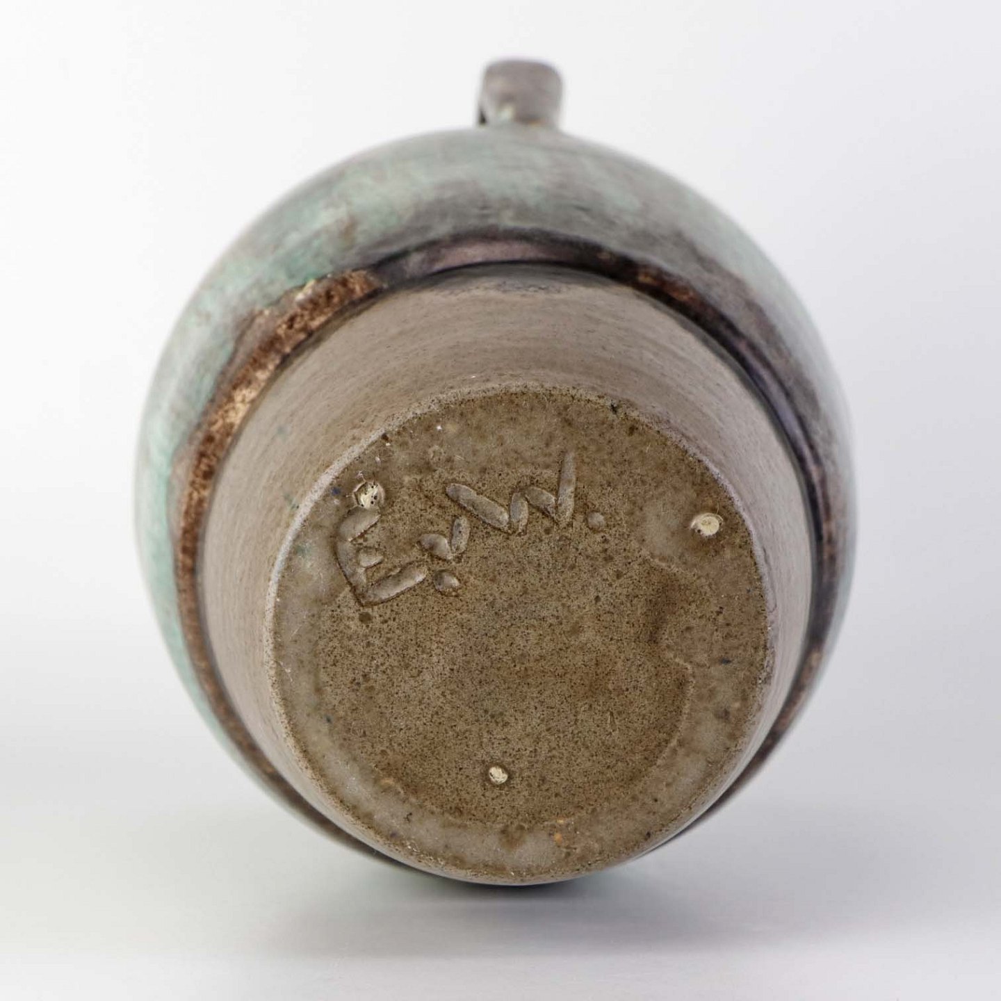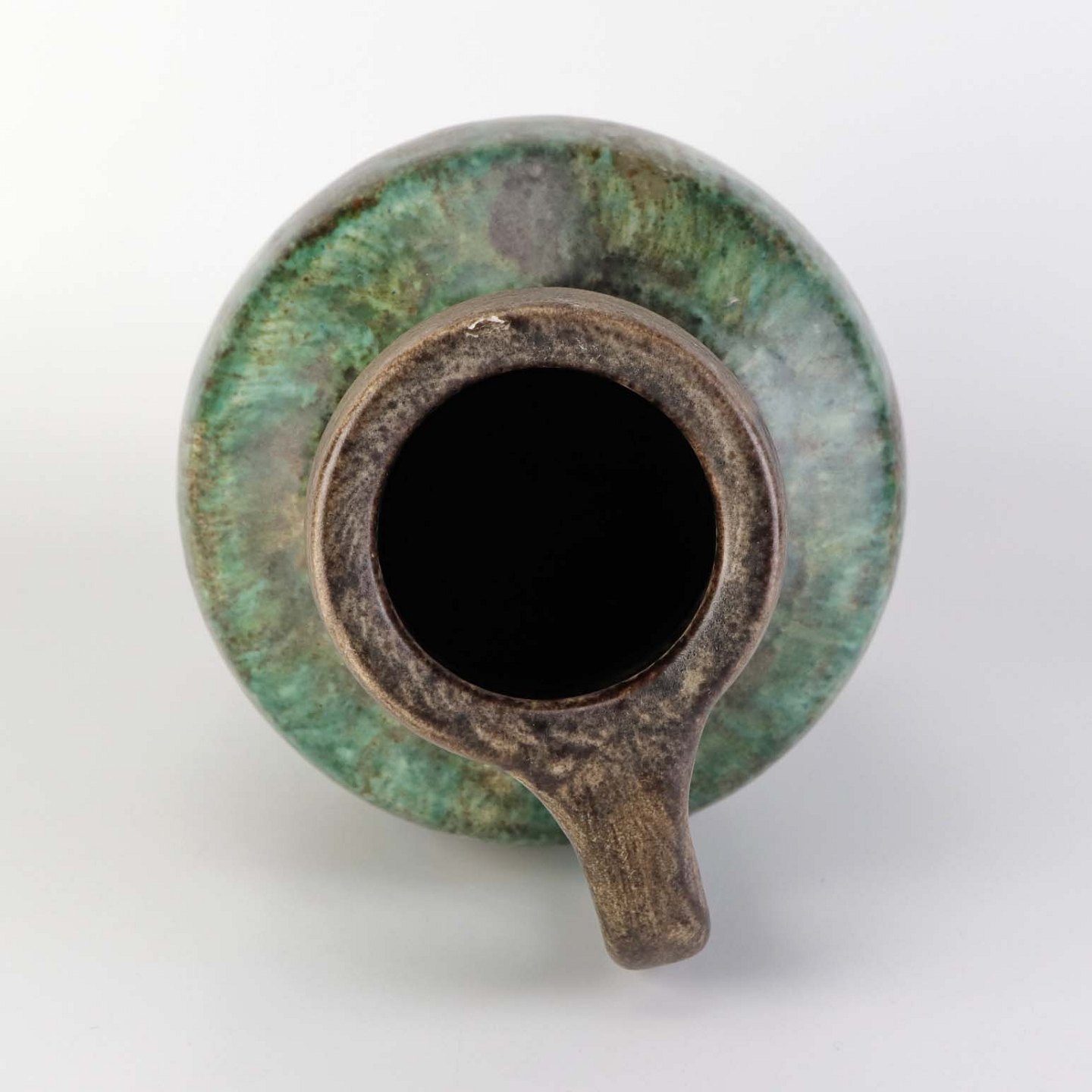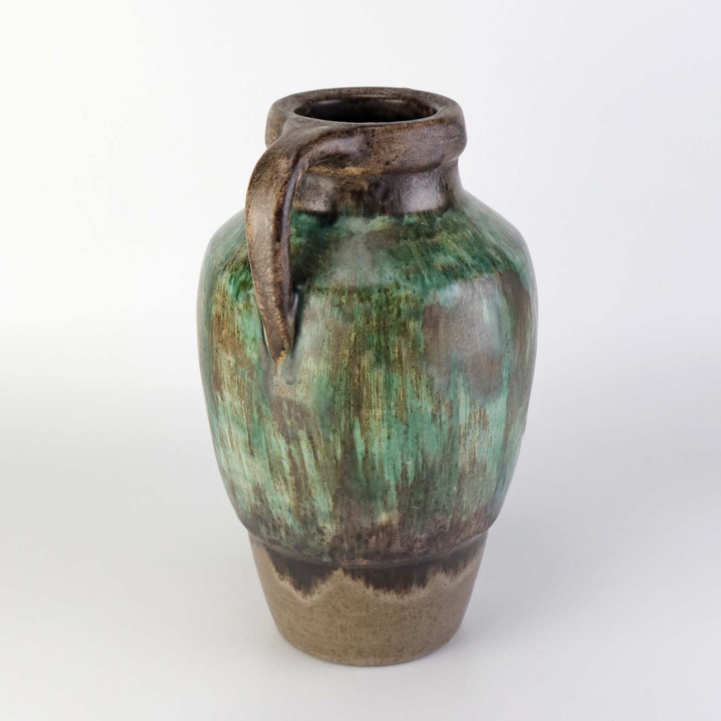 Vase i keramik med hank. Vasen er med glasur i grønne og brunlige nuancer.