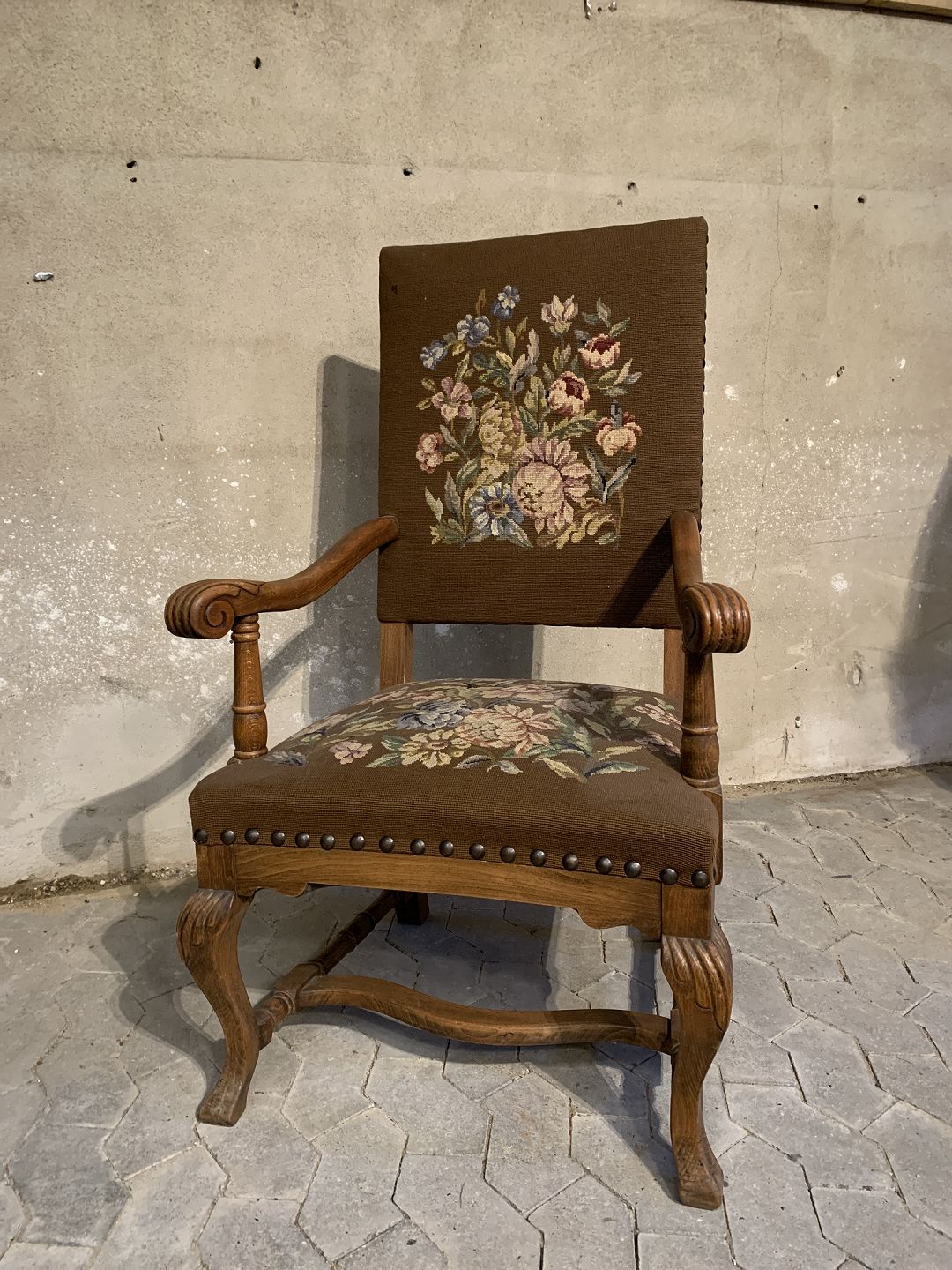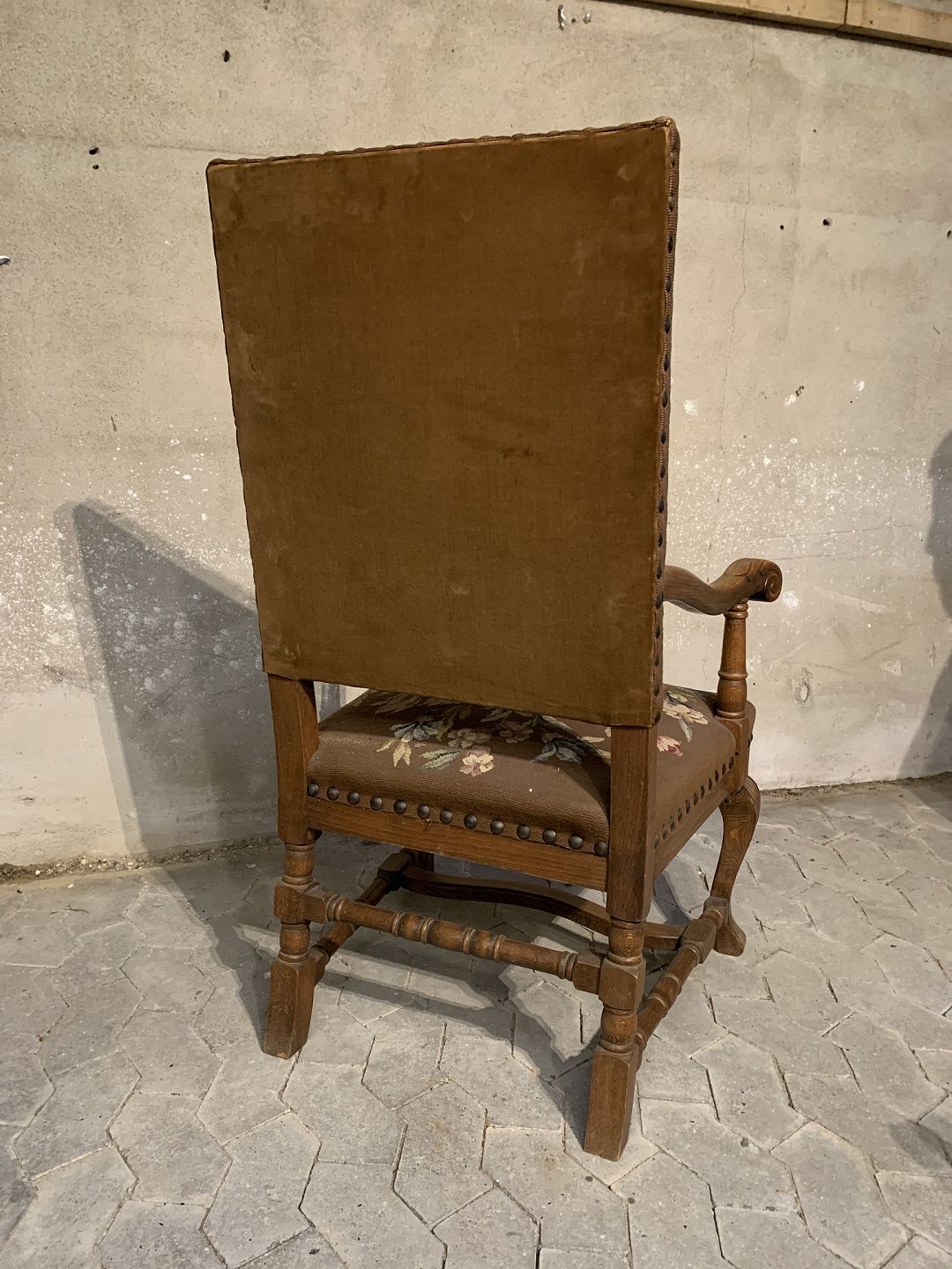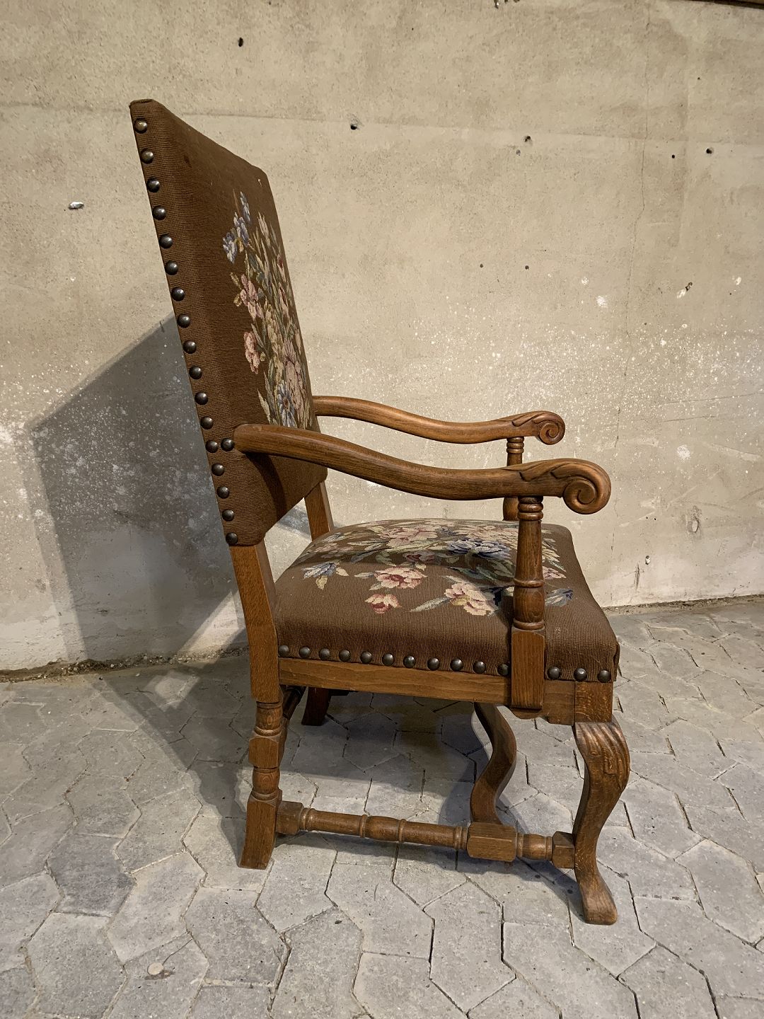 Armstol i massivt egetræ med broderet betræk, fra 1930erne.
