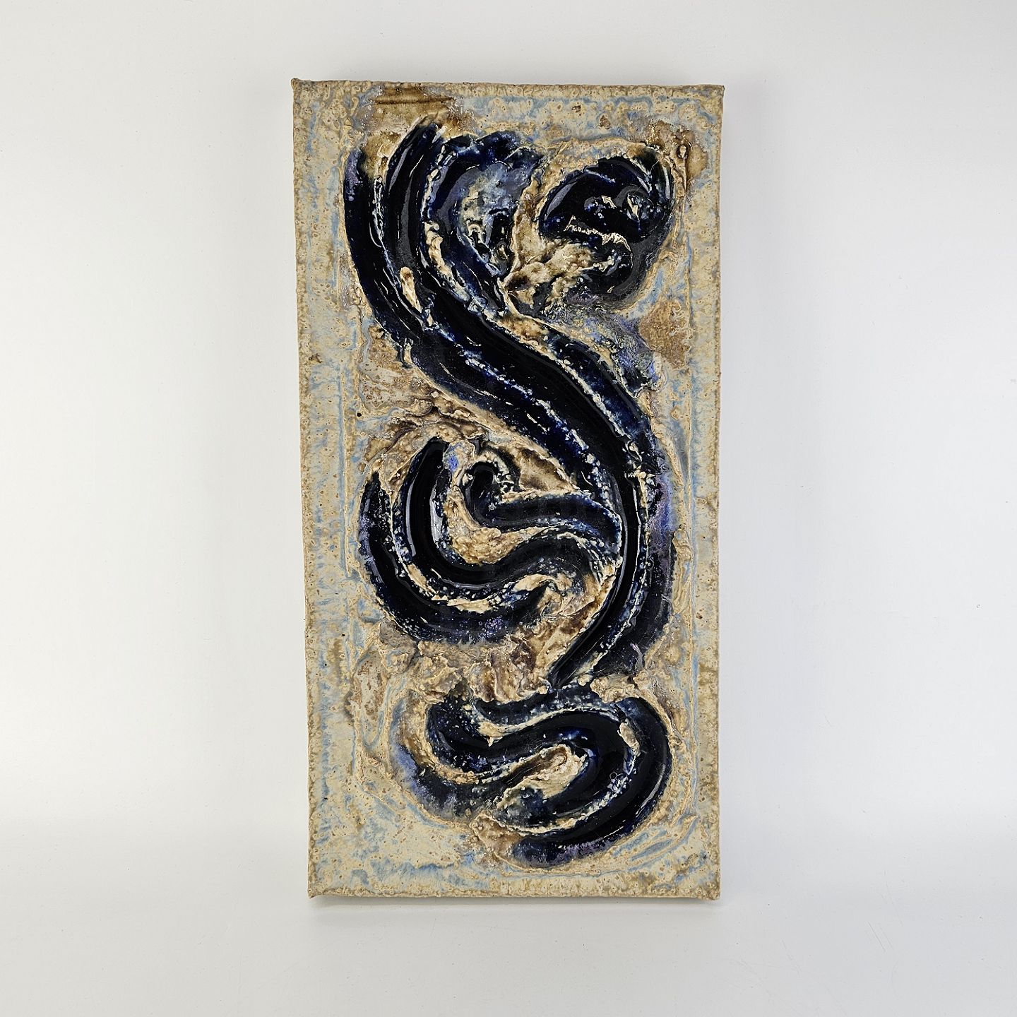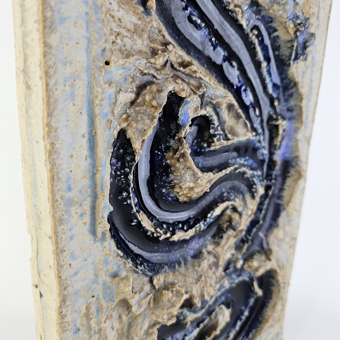 Relief af keramik med motiv af blå hvirvler
