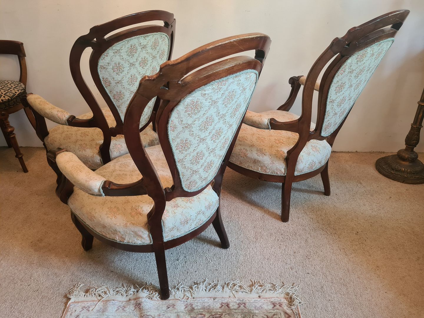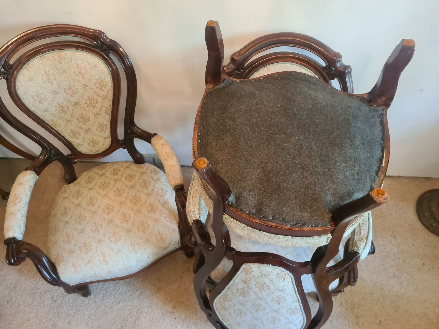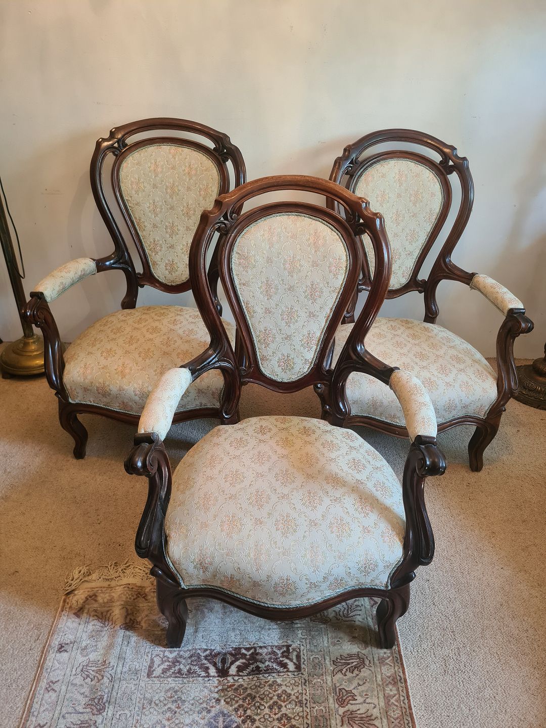3 Rokokostole fra 1920'erne i mahogni og med nyere polstring. Fremstår pæne og solide uden nævneværdige brugsspor.