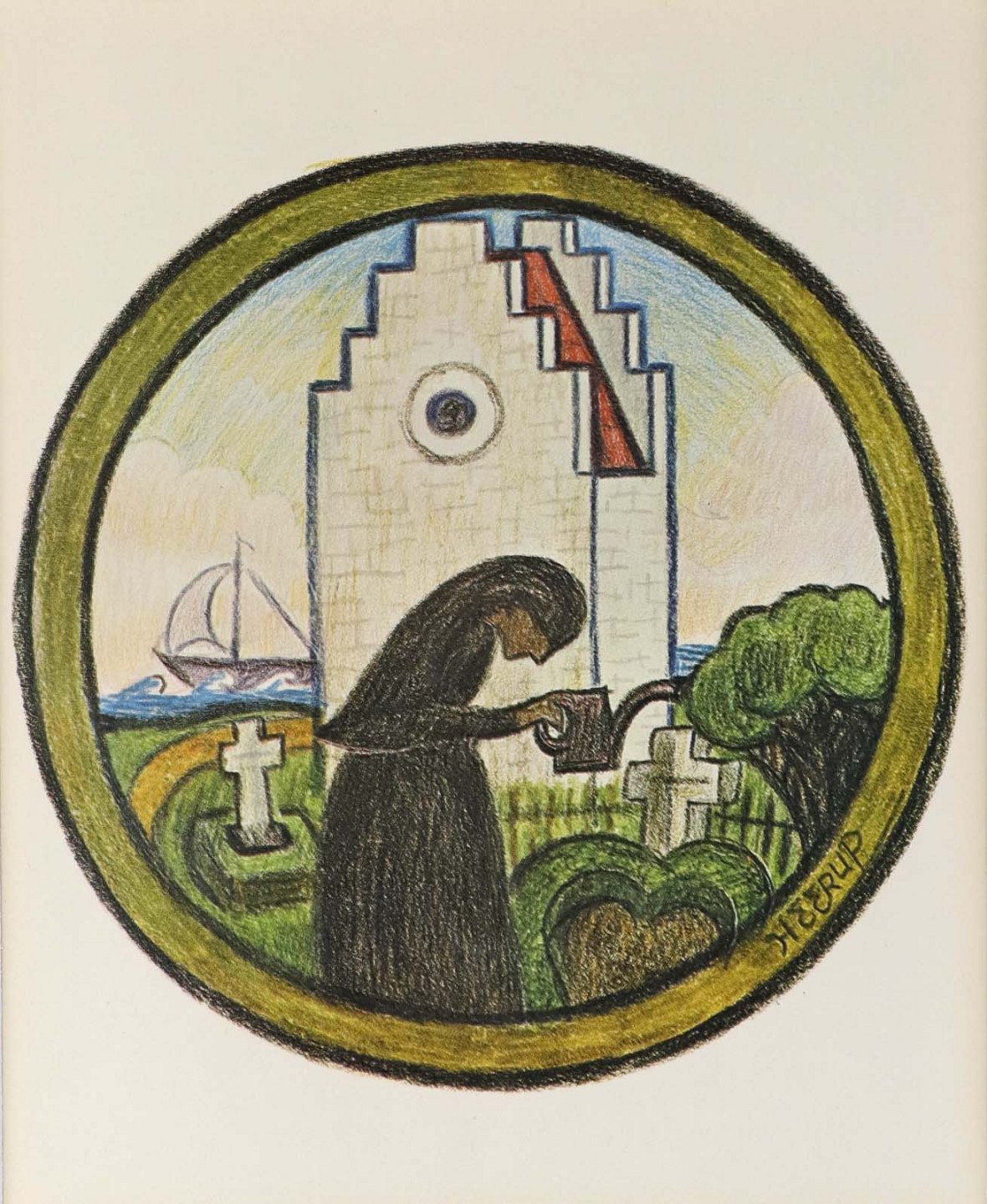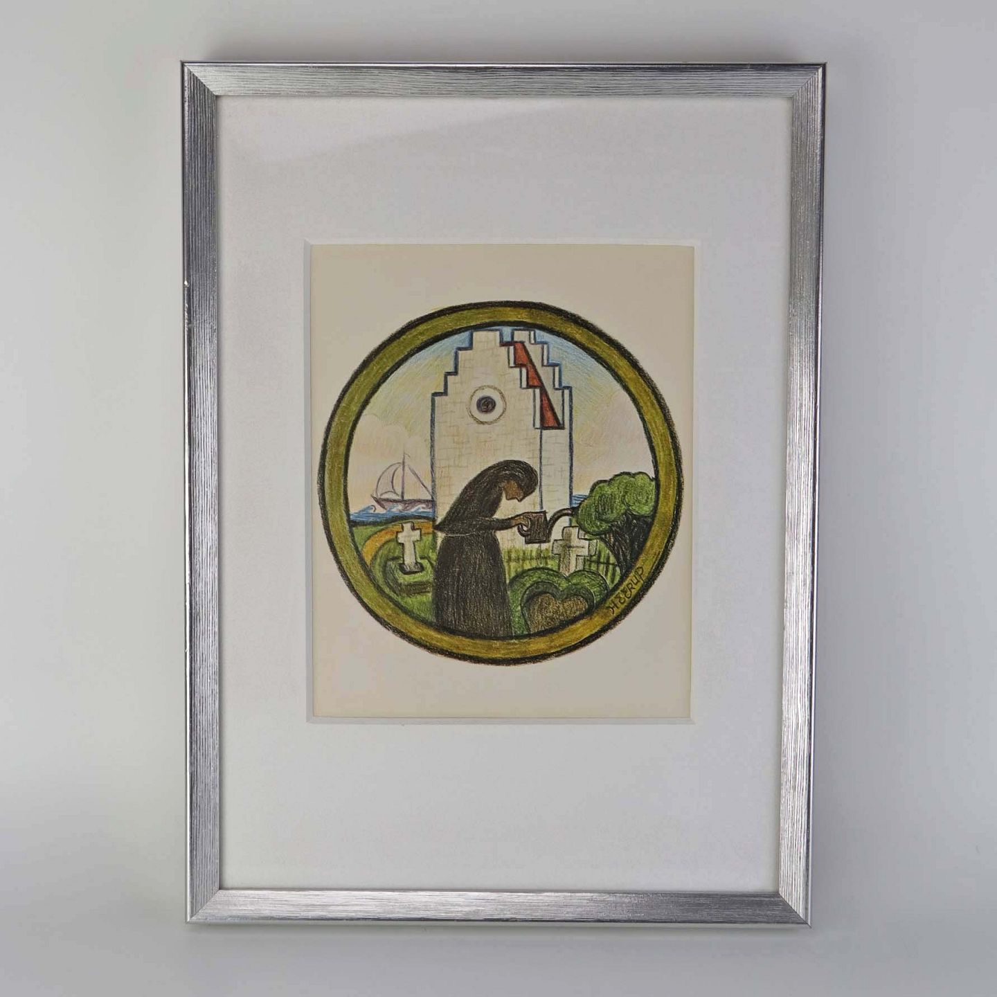 Indrammet tryk i passepartout med sølvmalet træramme og motiv af sørgende kvinde, som vander planter på kirkegaarden.