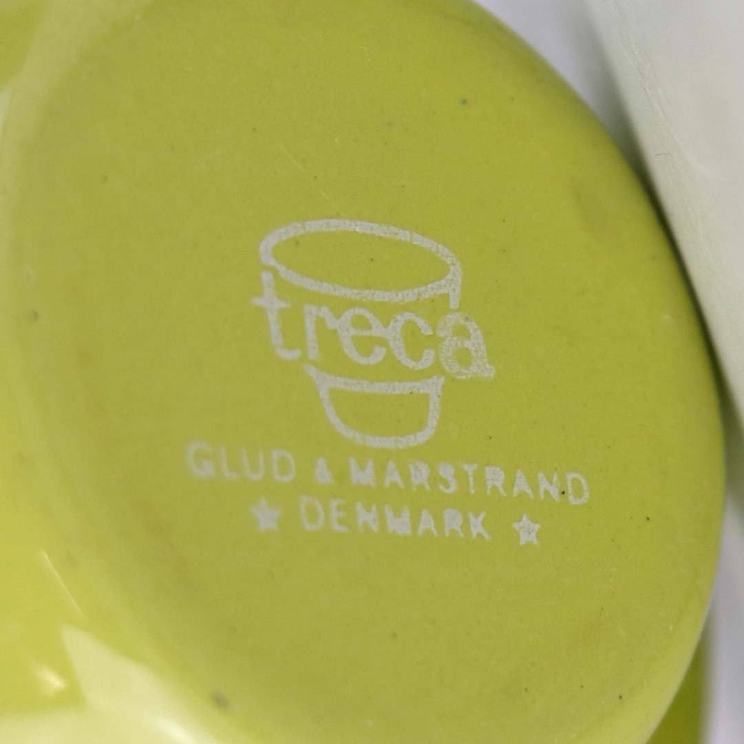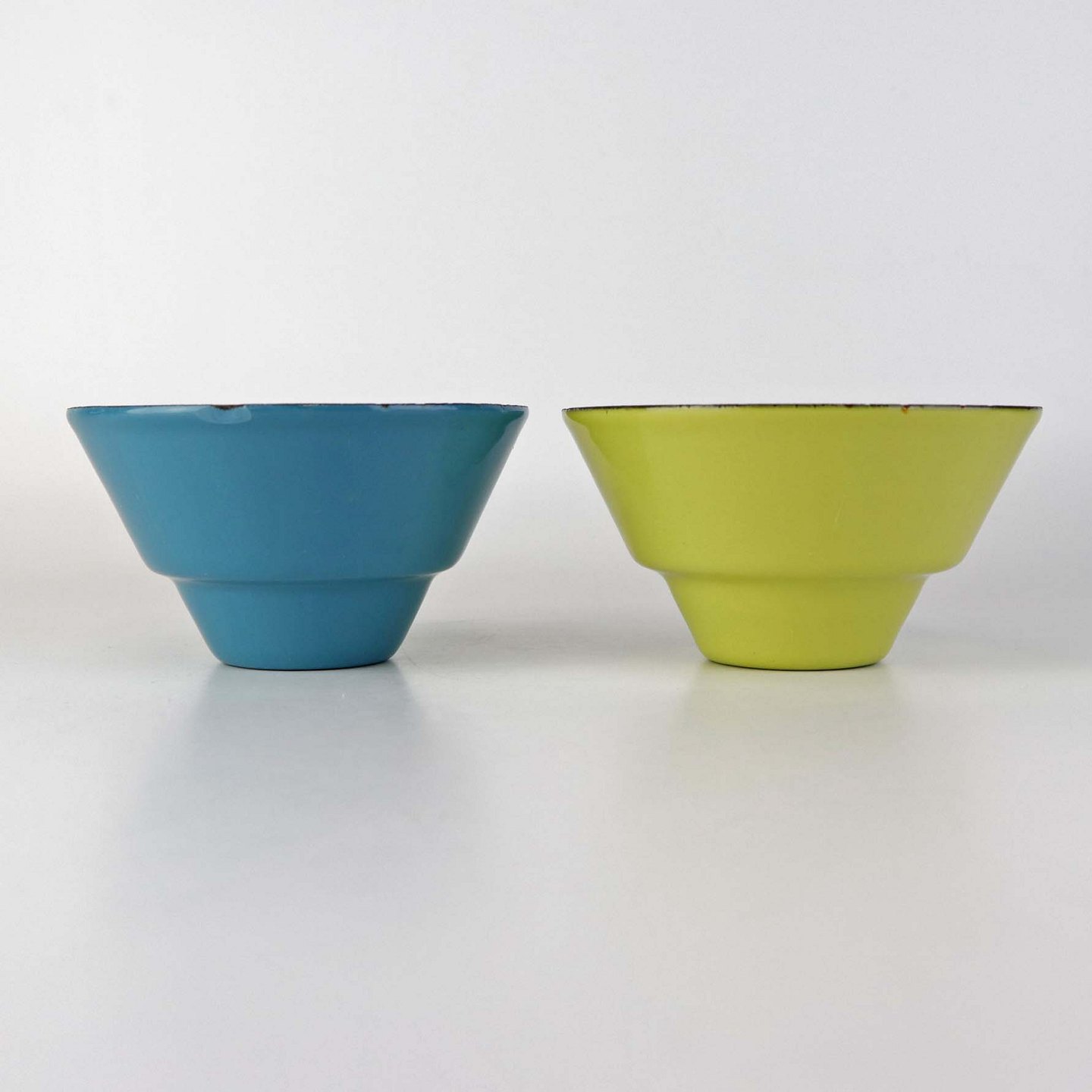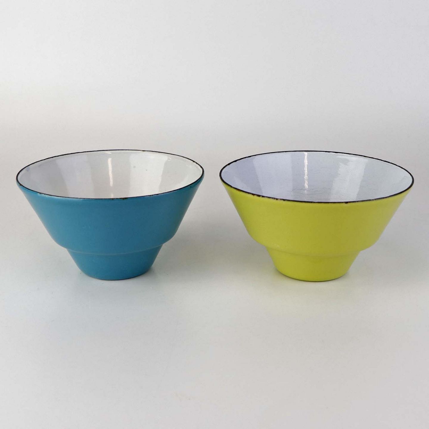 Text available in Danish: Et sæt med to mindre skåle i blå og limegrøn emalje med hvid emalje på indersiden. Model Treca