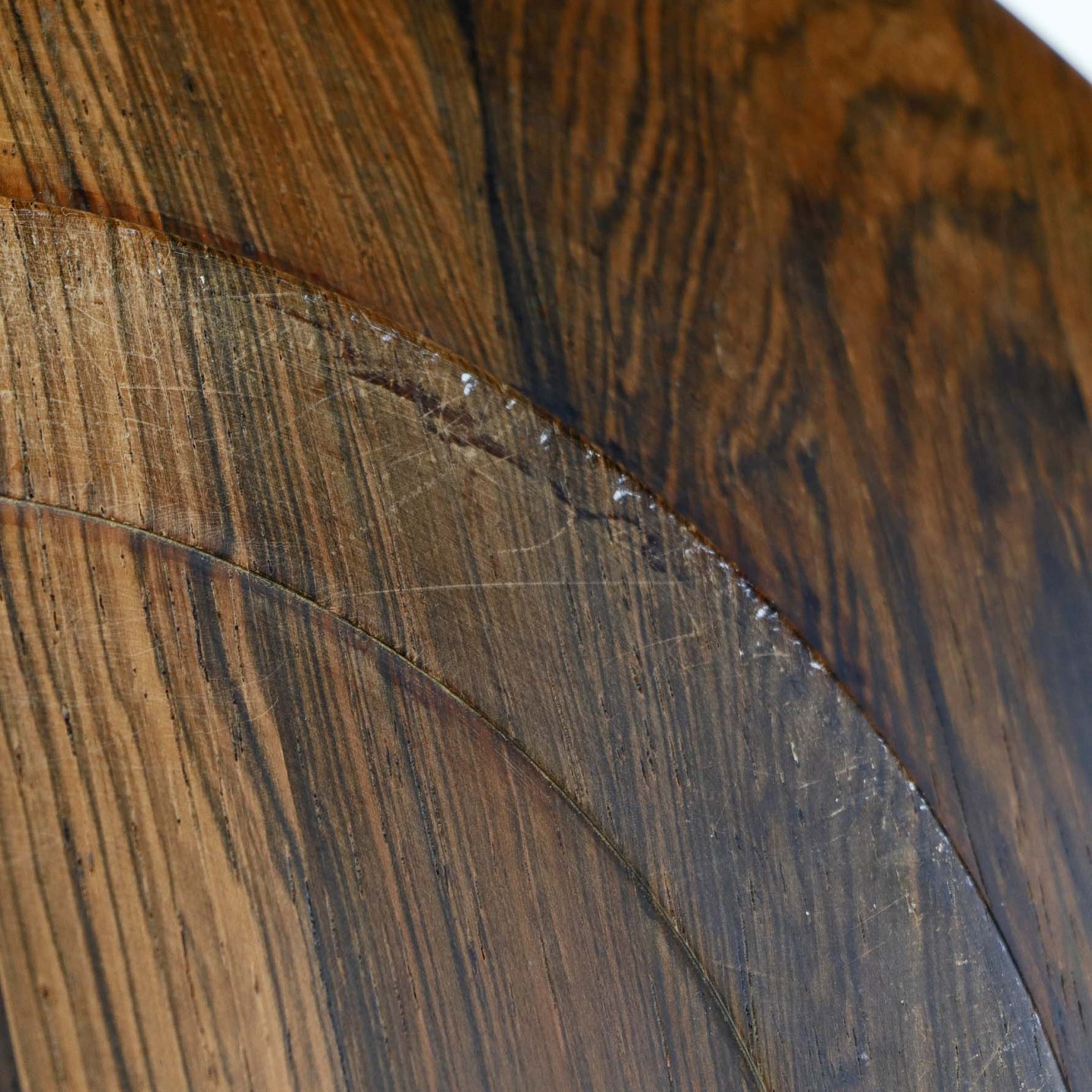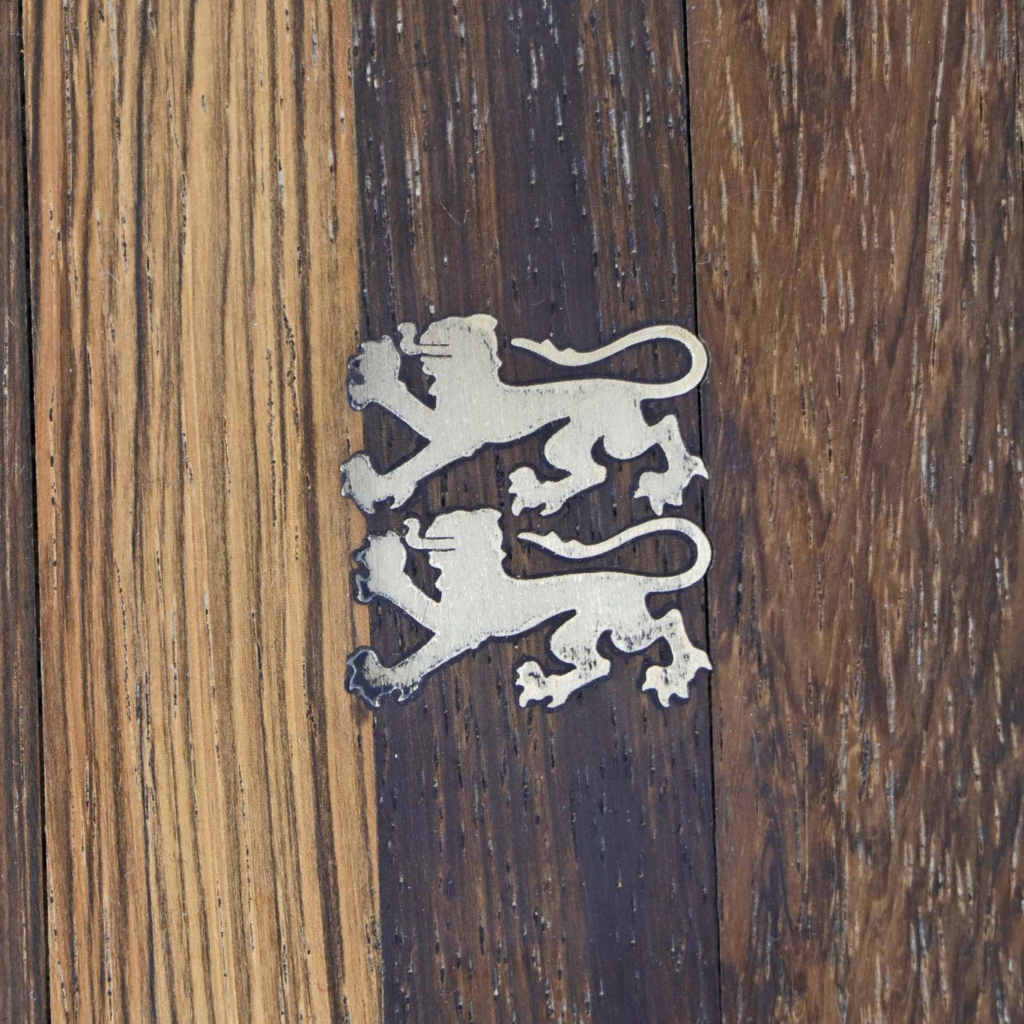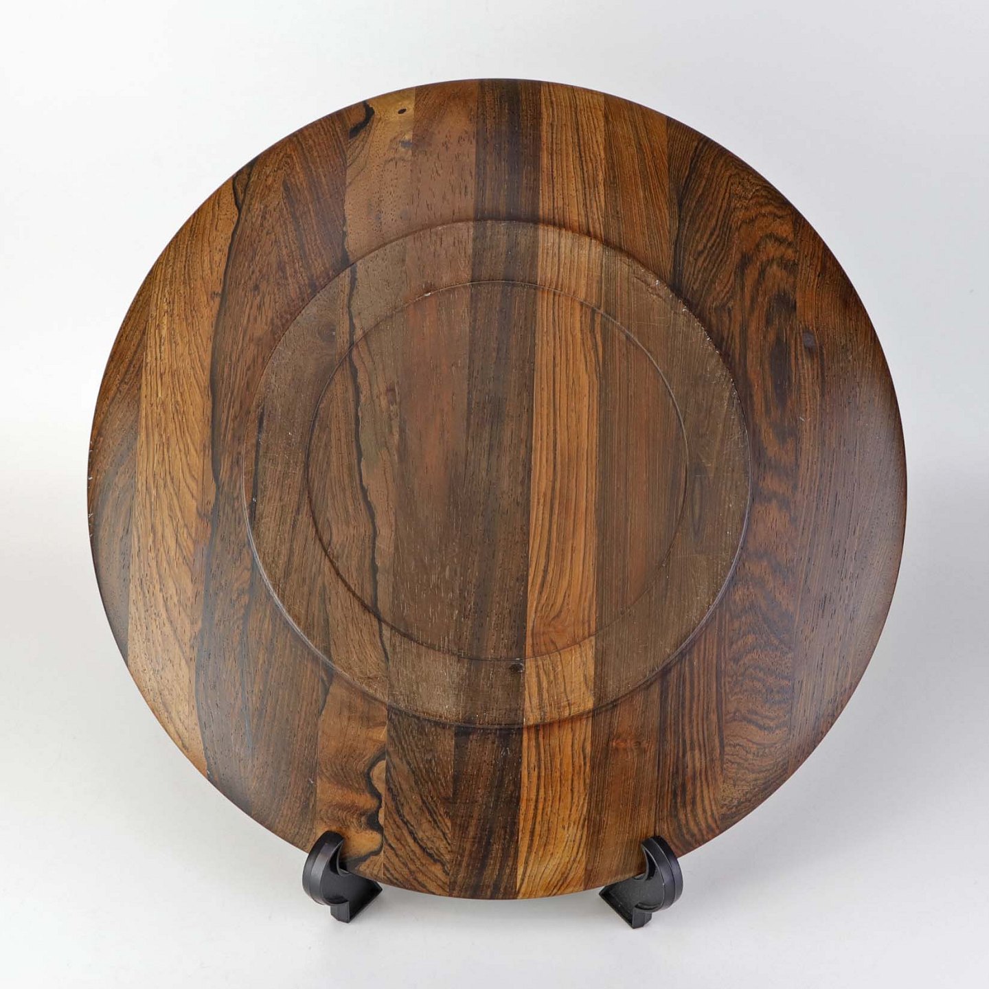 Dæktallerken i træ med indlagt dekoration af to løver i sølv.