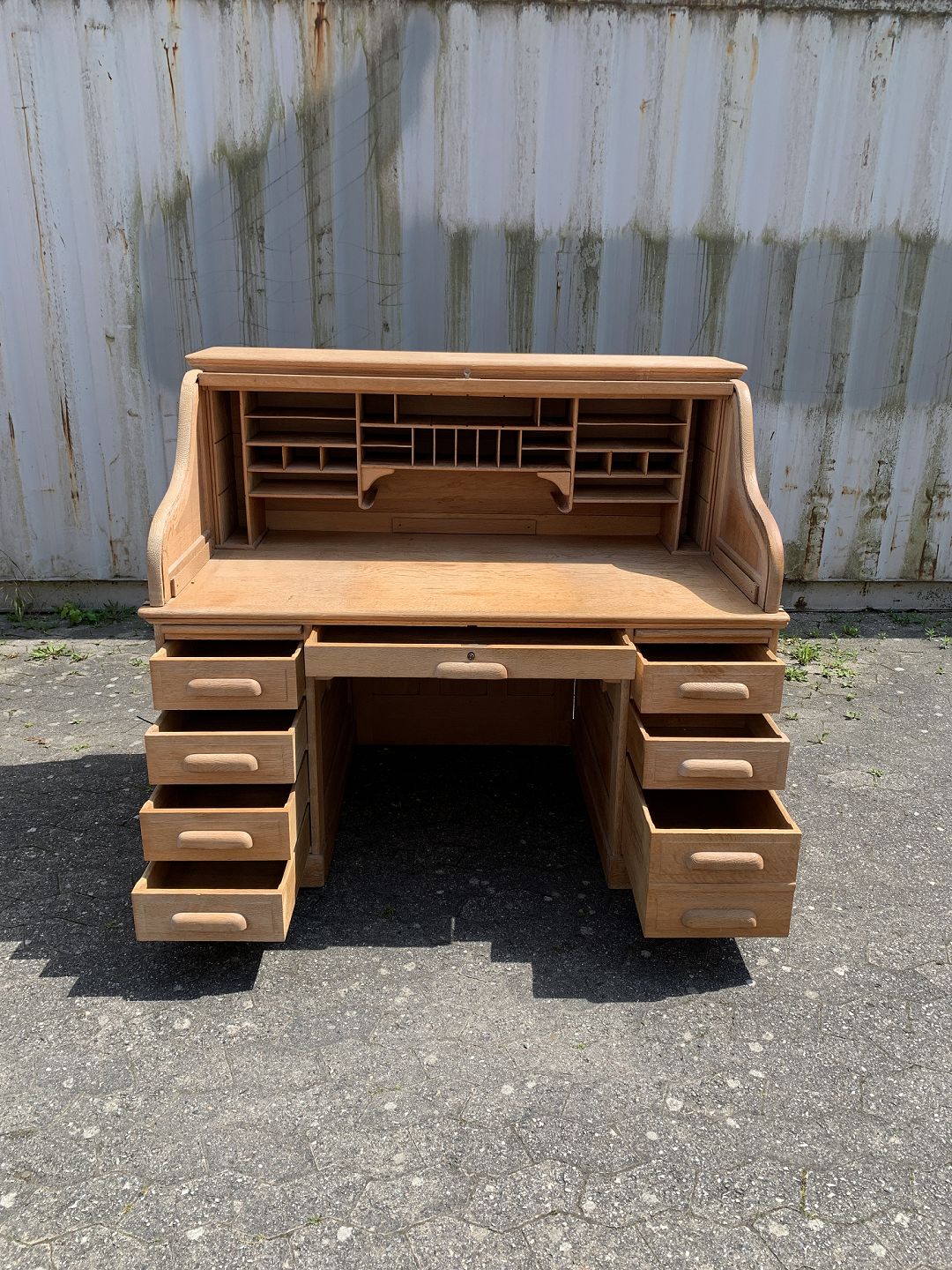 Text available in Danish: Amrikansk skrivebord i massivt egetræ, fra 1920erne.