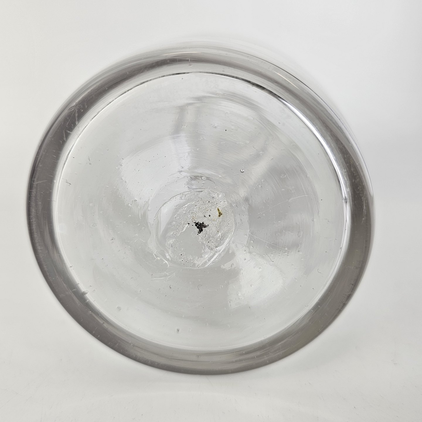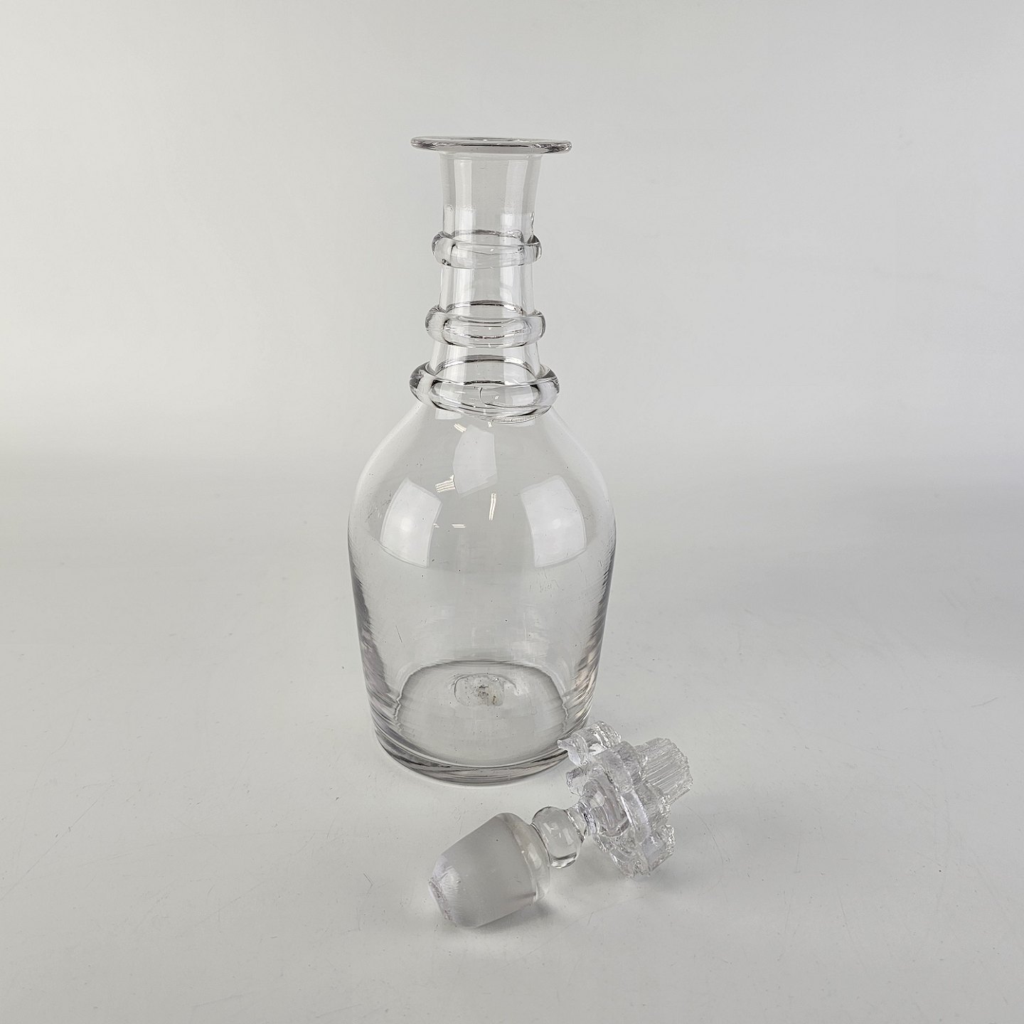 Mundblæst karaffel af glas med tre ringe om halsen.