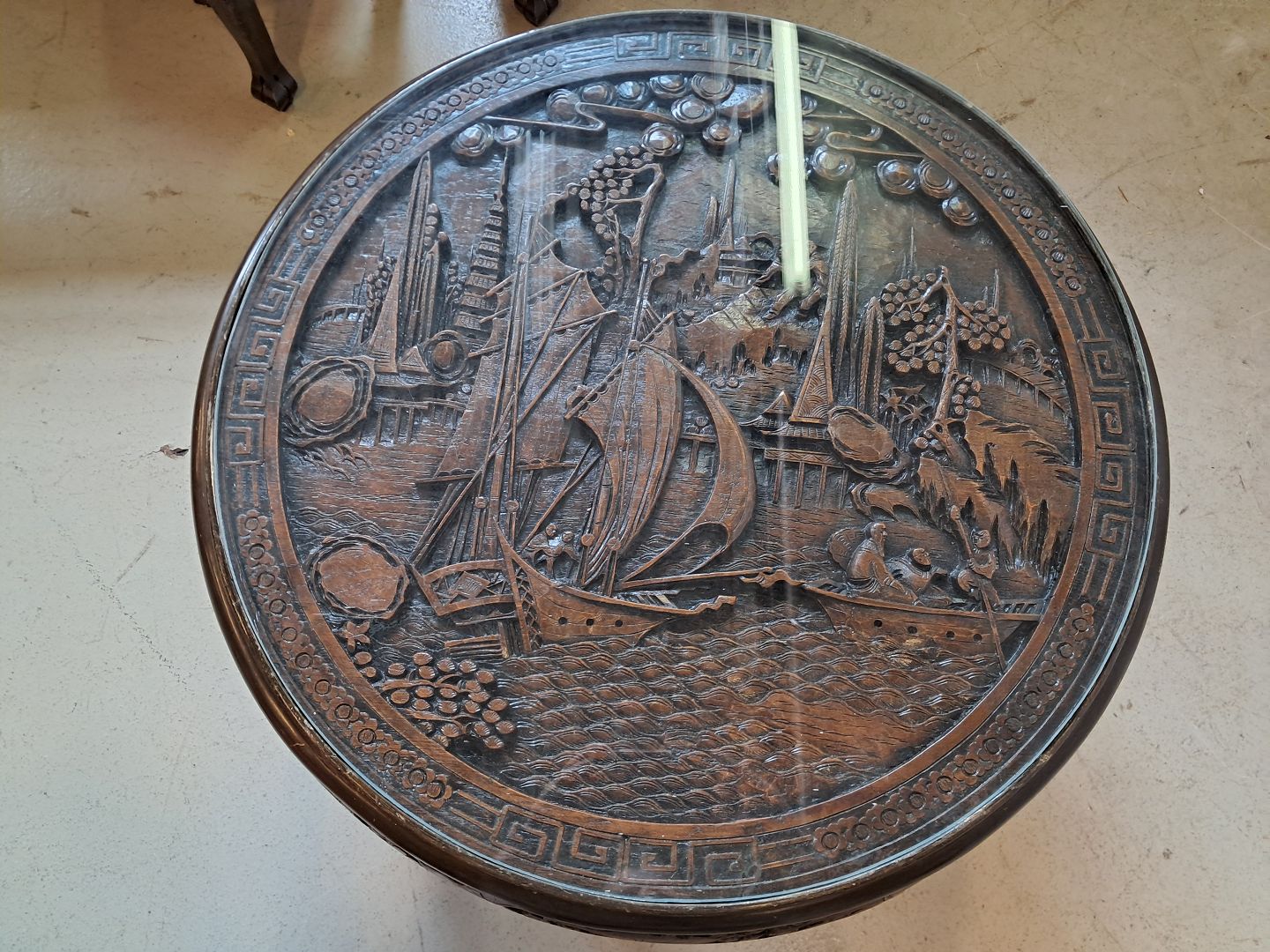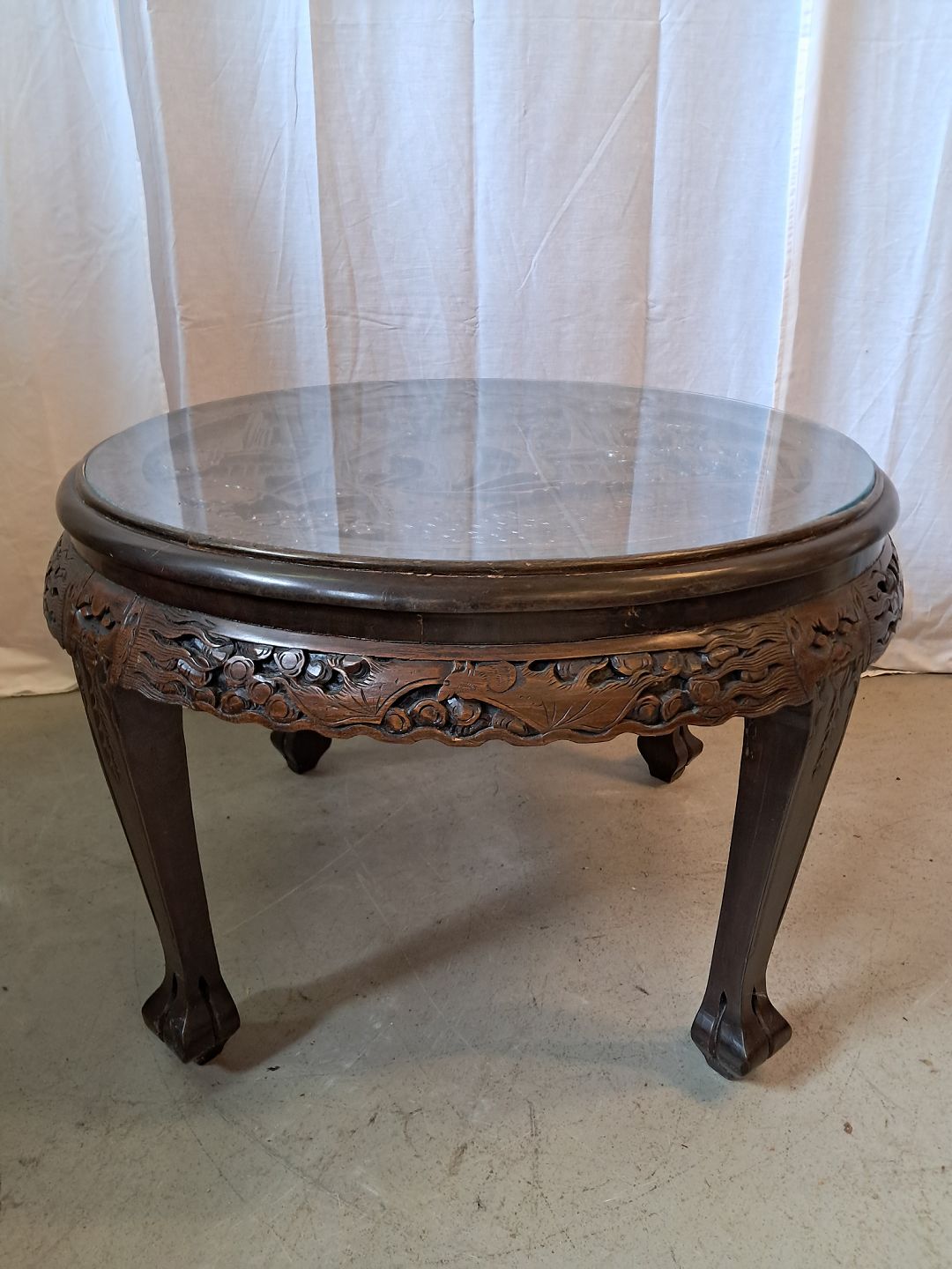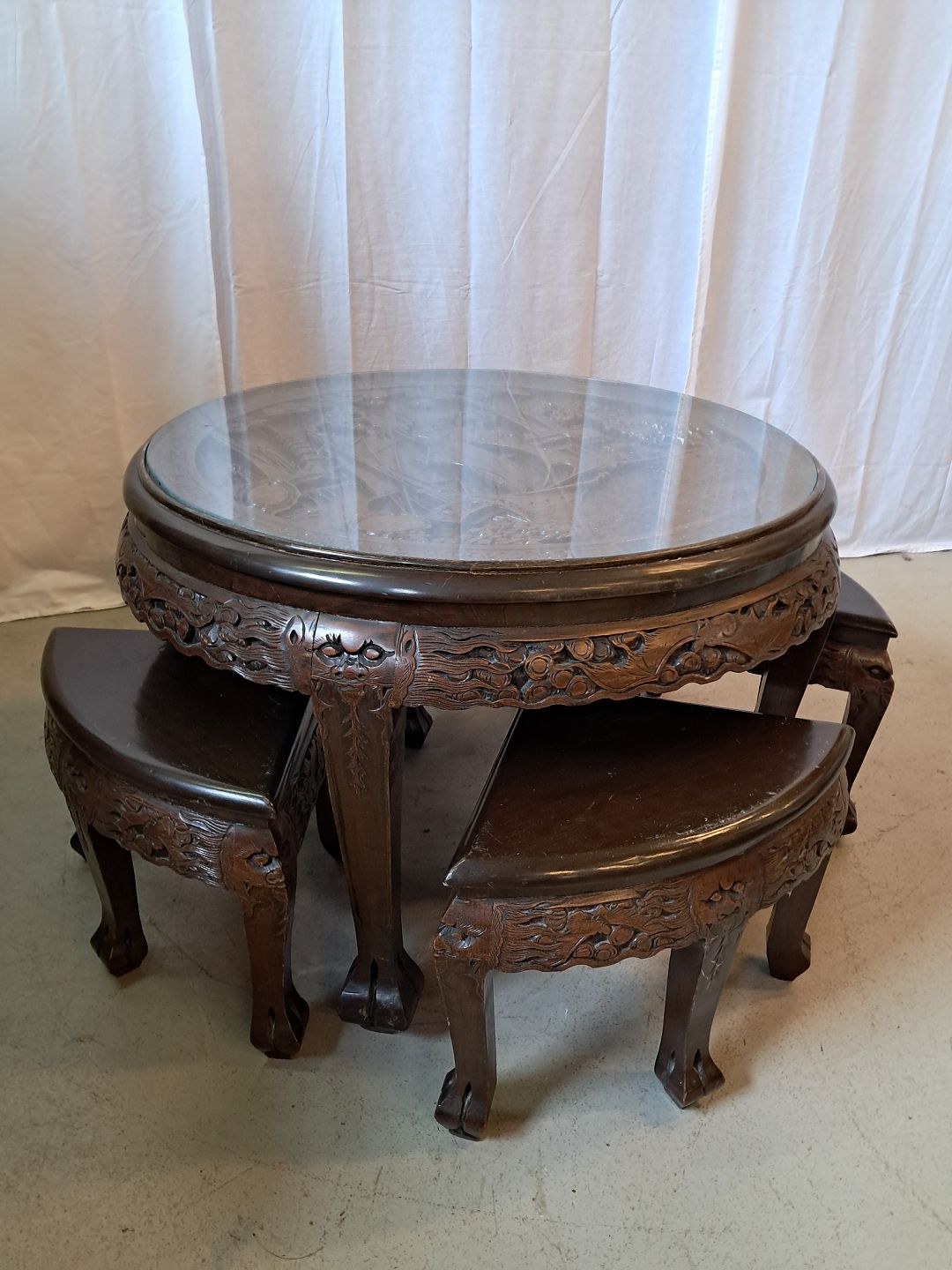 Kinesisk bord i massivt træ med glasplade og 4 taburetter, fra 1990erne.