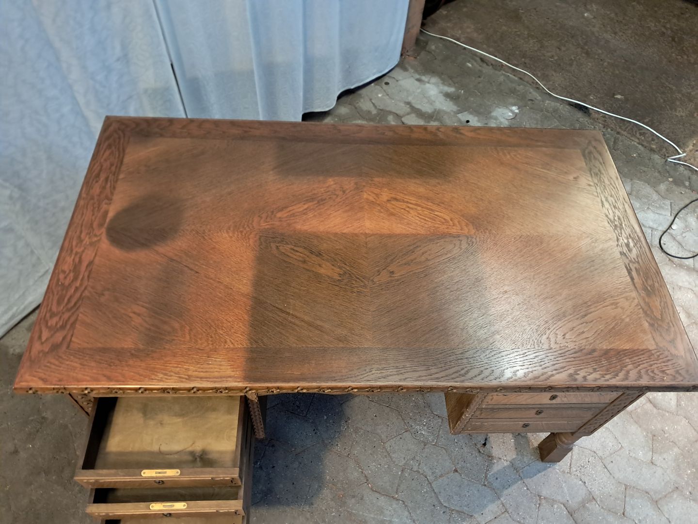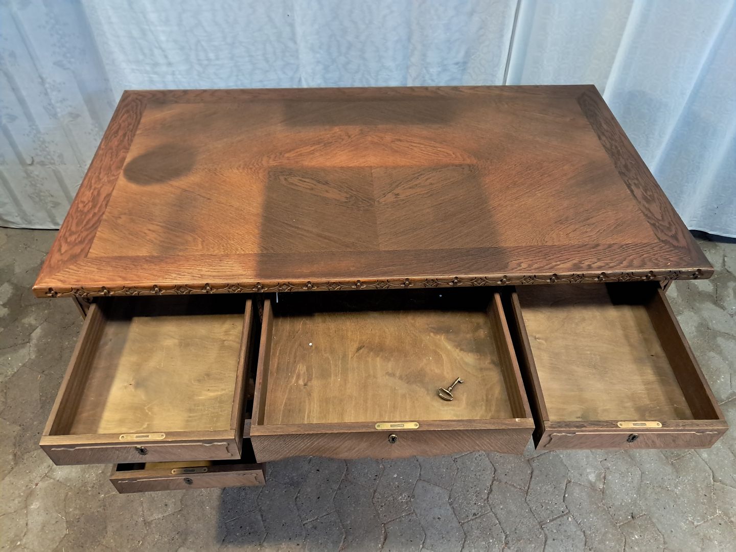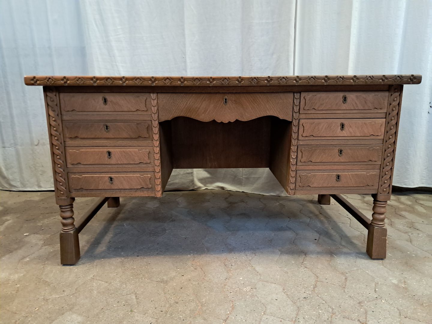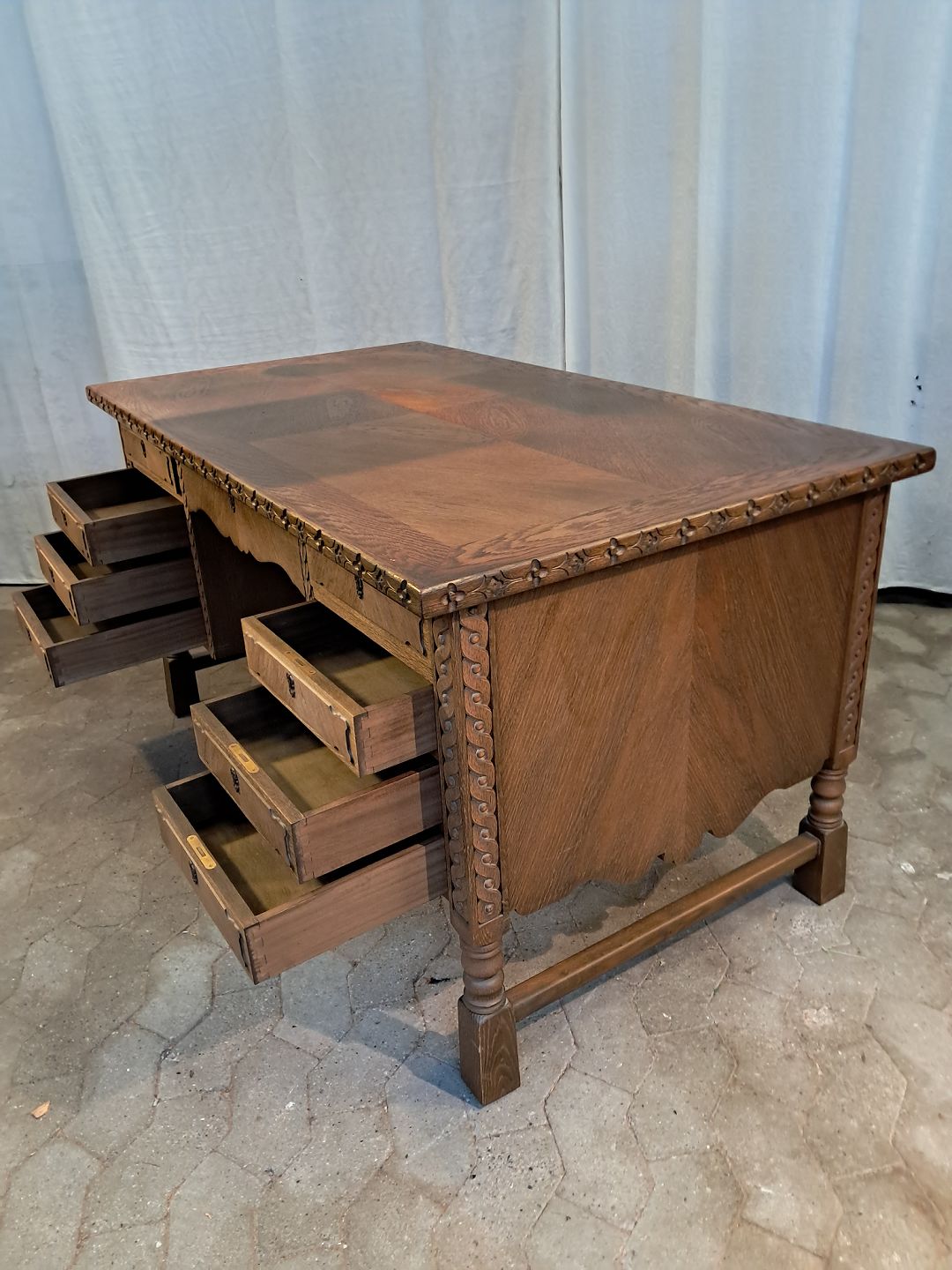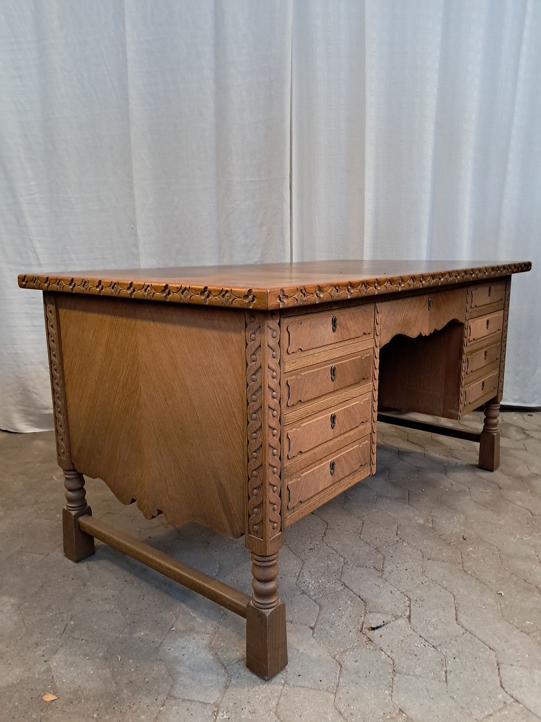 Skrivebord i fineret egetræ, fra 1980erne.
