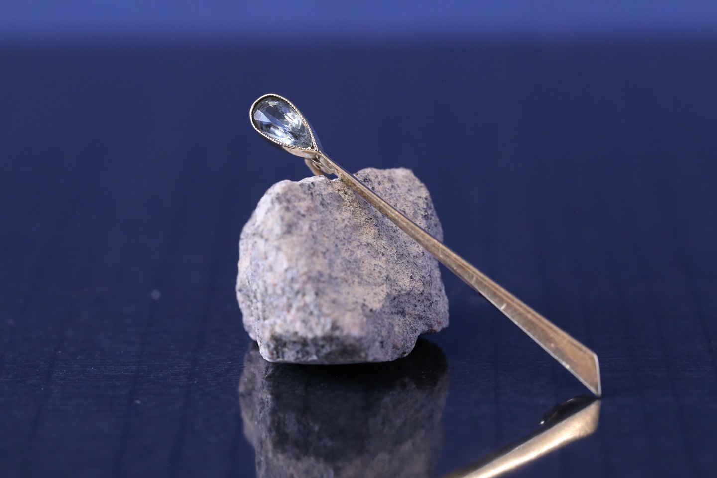 Stylish and beautiful gold brooch with sharp lines and beautiful blue teardrop-shaped aquamarine. The gold brooch is made in a timeless design that makes it suitable for any outfit and occasion. Wear it with a smart cardigan or a white shirt, for example, and you are sure that your dress code is on trend.