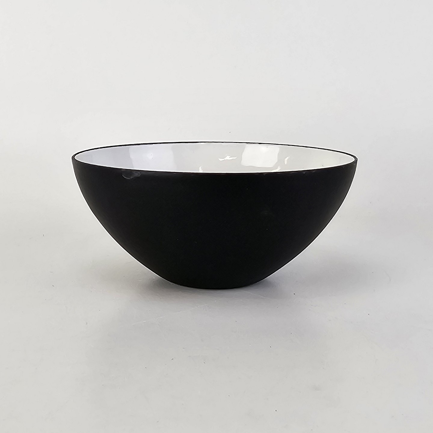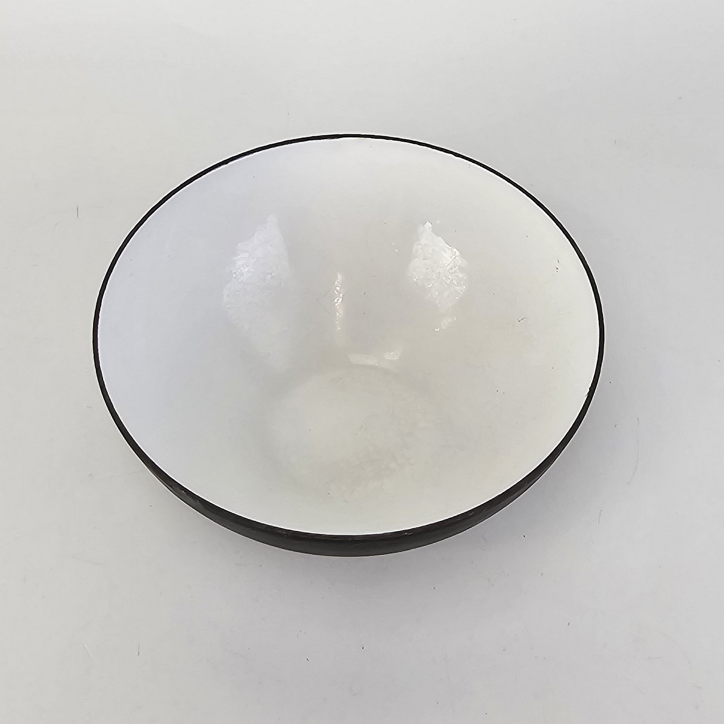 Text available in Danish: Lille sort skål med hvid emalje på indersiden