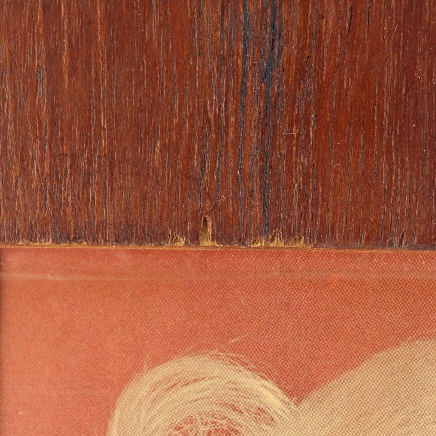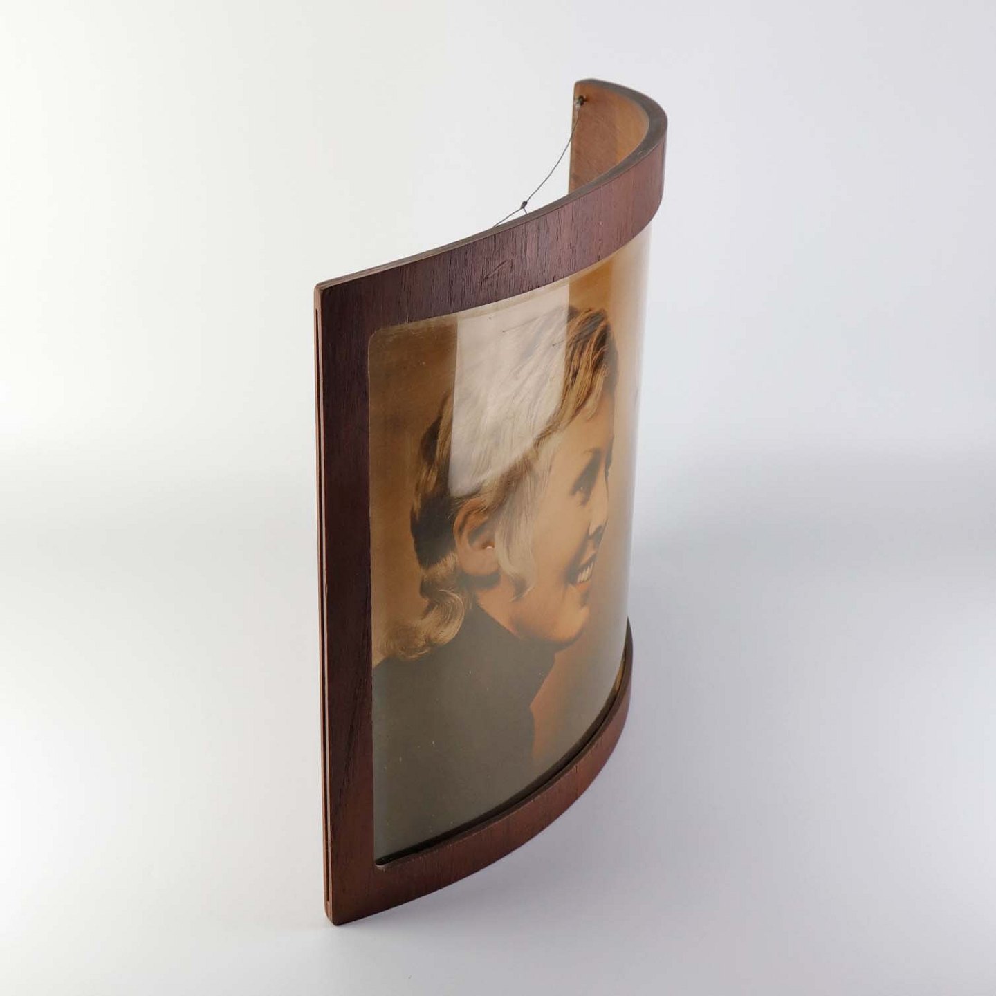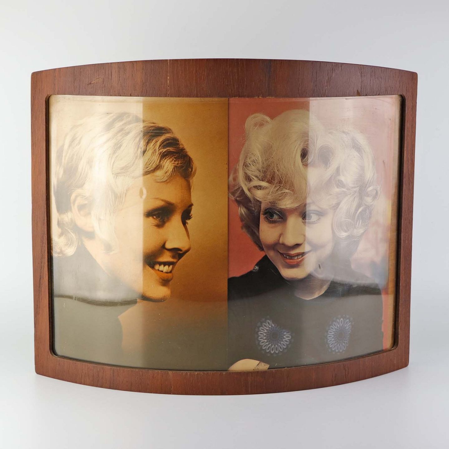 Indrammet tryk bag blødt past i buet ramme i teaktræsfiner. Trykket er med motiv fra frisørsalon.