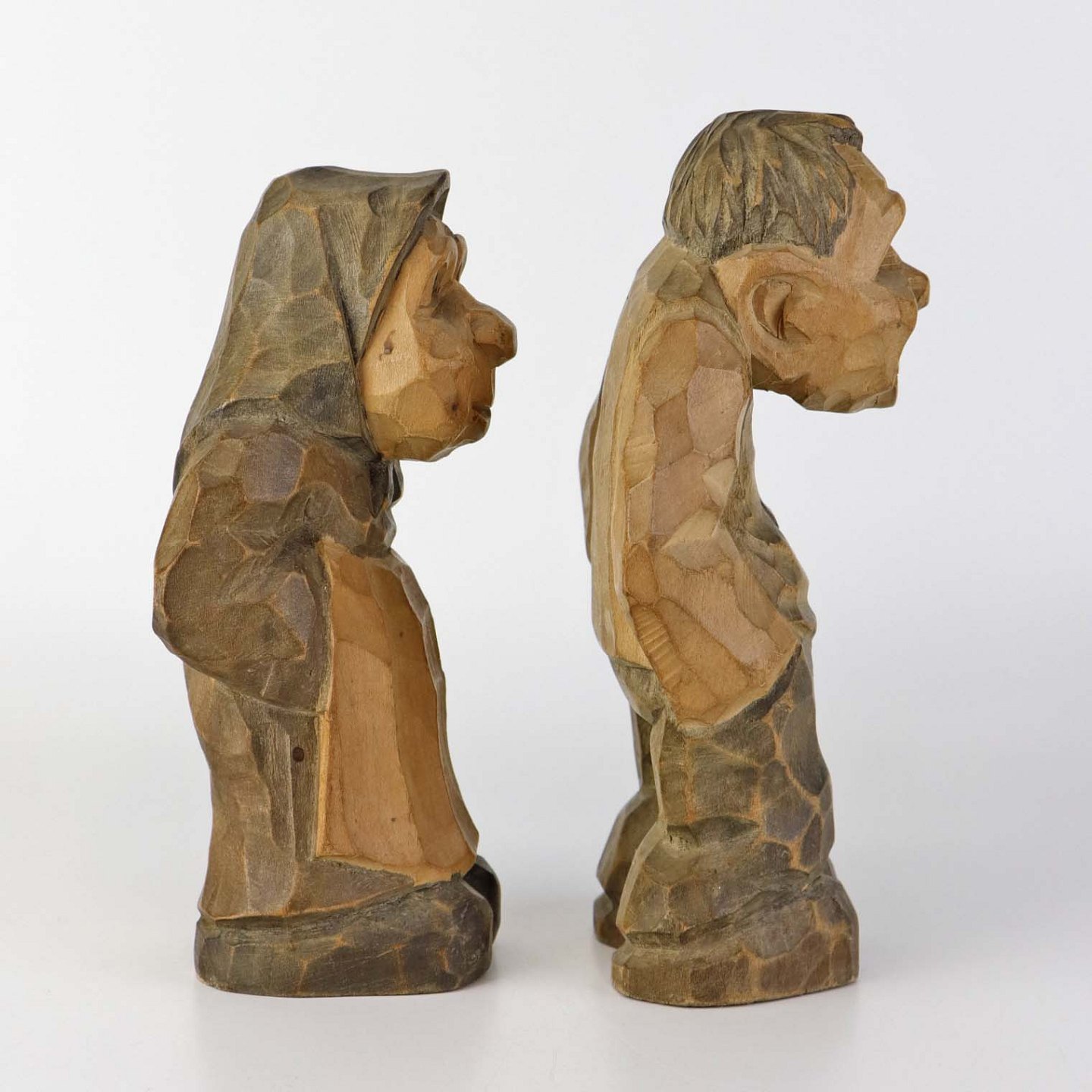 Et sæt håndsnittet figurer i træ med motiv af ældre mand og ældre kvinde