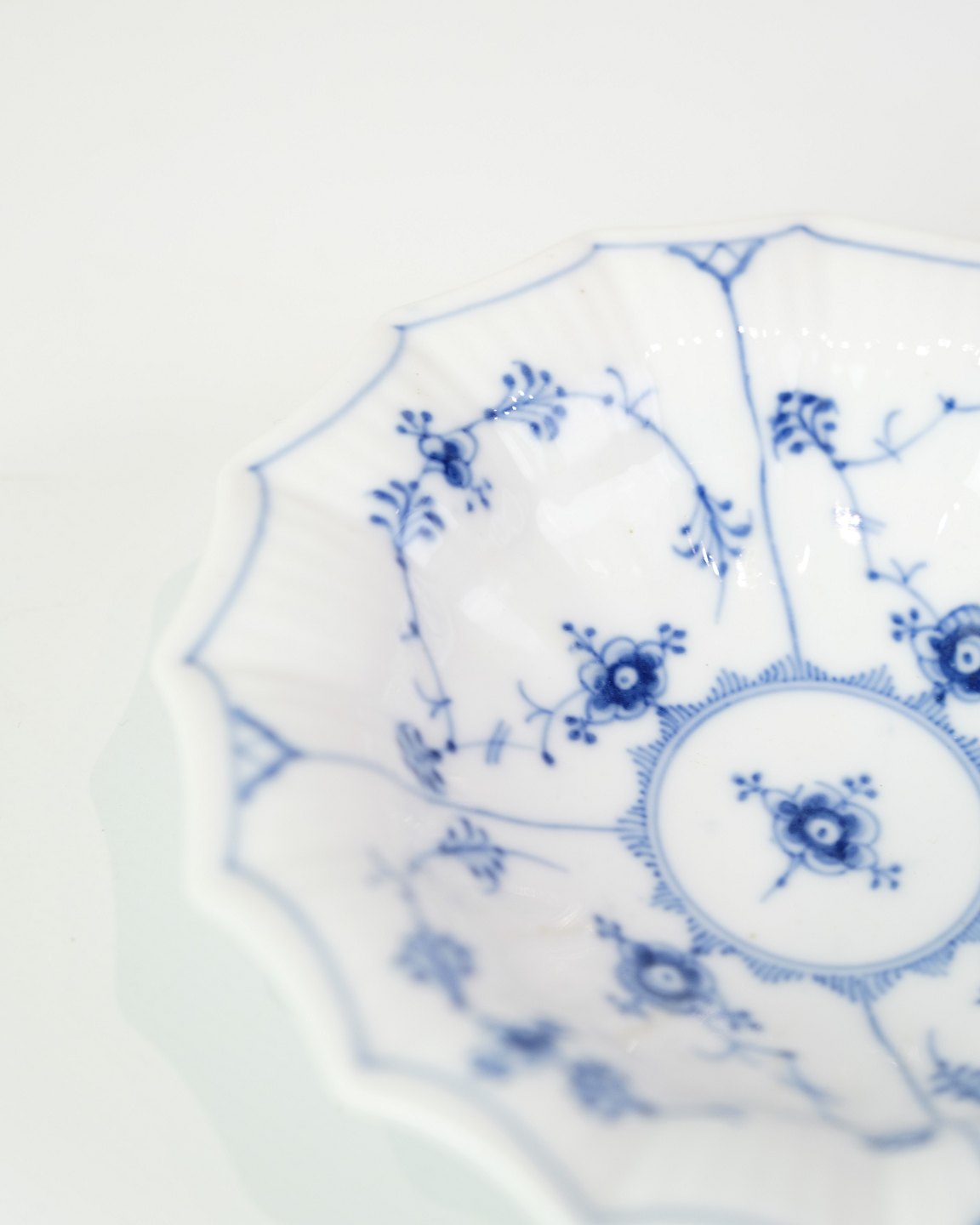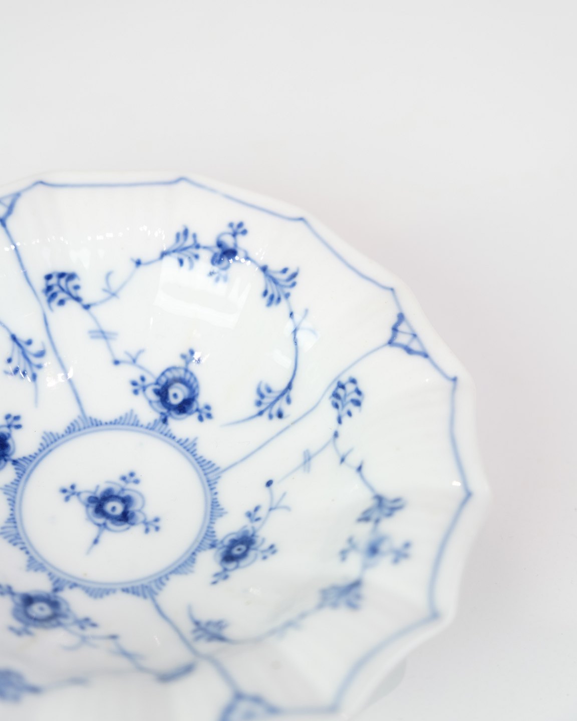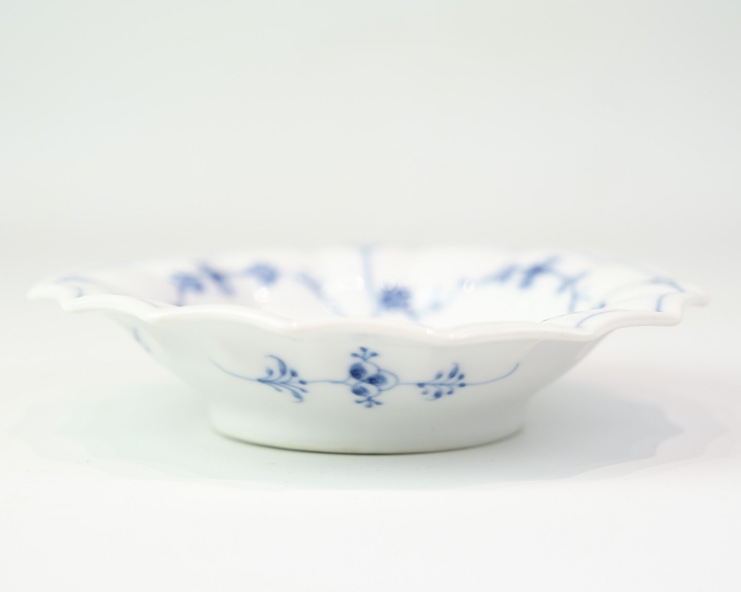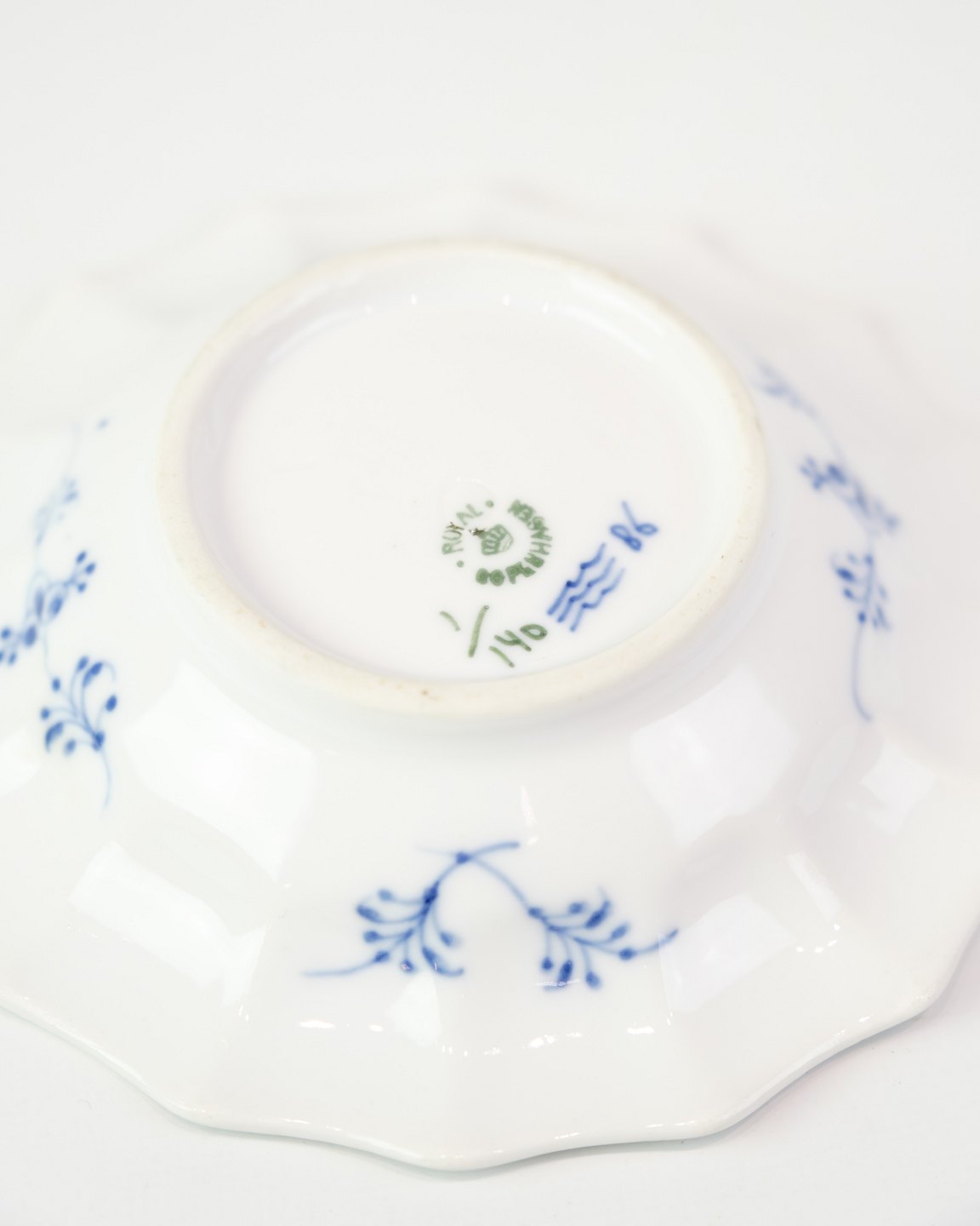 Bølgeskål fra Royal Copenhagen i det musselmalede mønster. Skålen har modelnummer 140/1 og en diameter på 15 cm. Udført i håndmalet porcelæn med klassisk blå dekoration.
