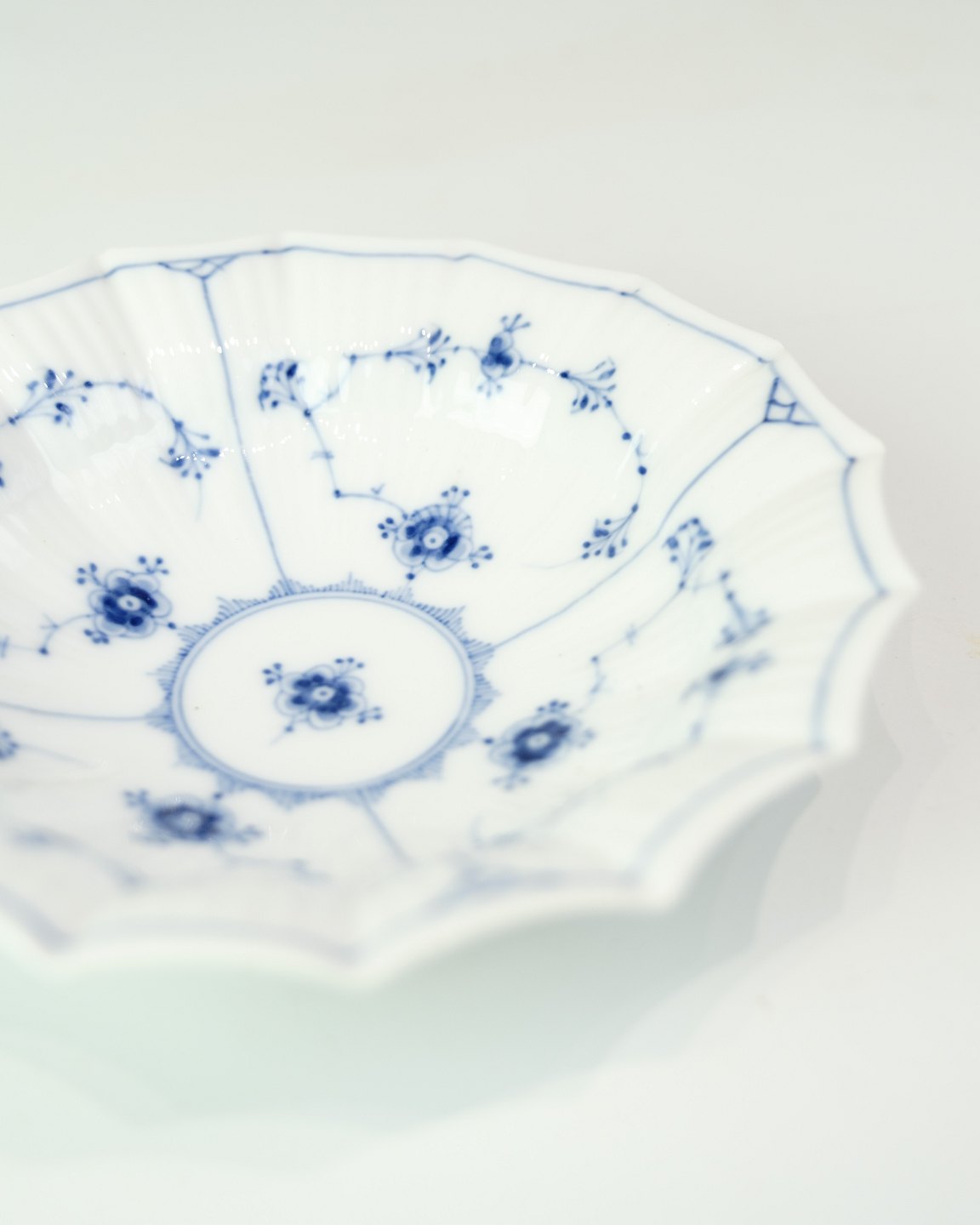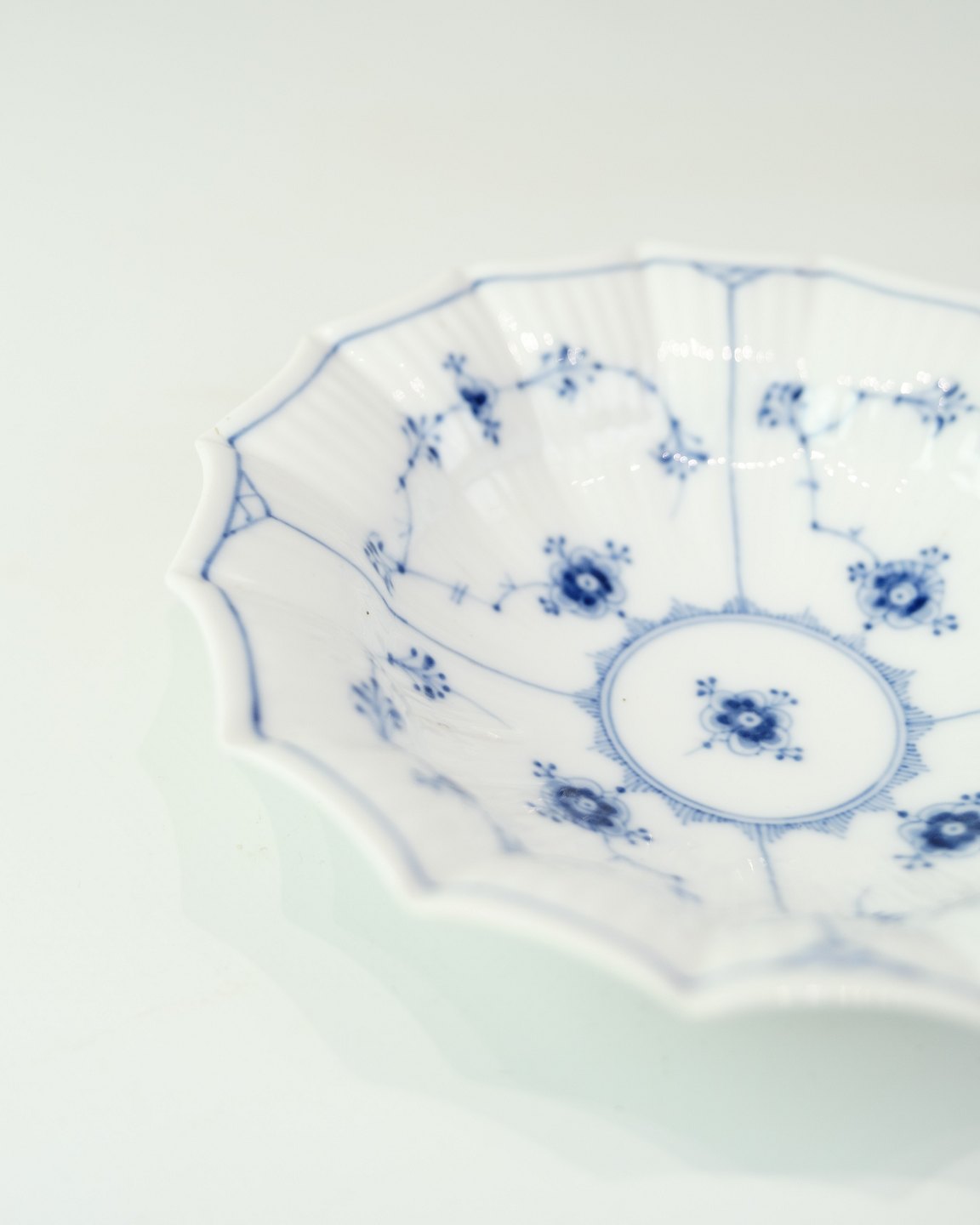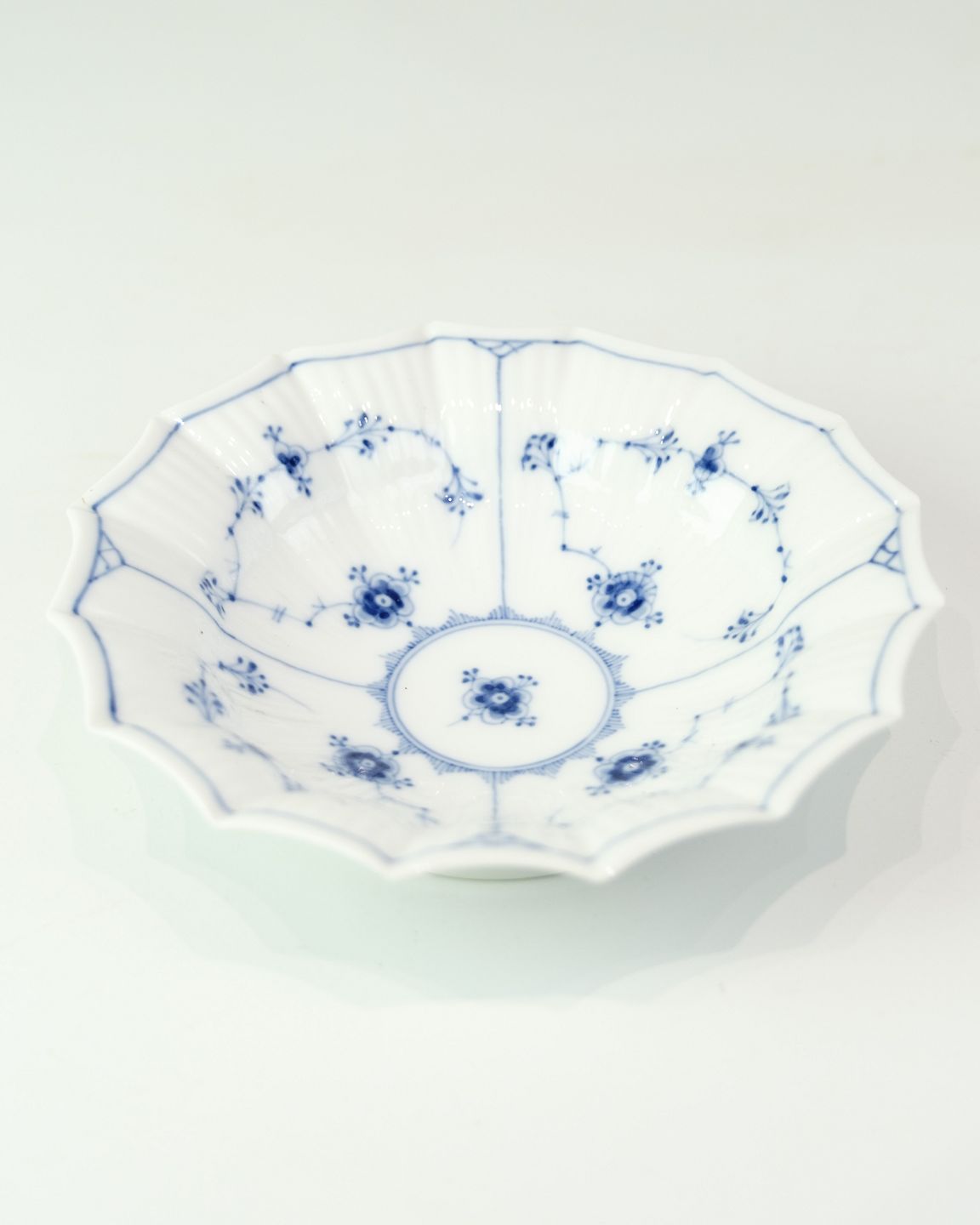 Asiet fra Royal Copenhagen i musselmalede mønster. Model No. 140 og er produceret i 1960. Udført i håndmalet porcelæn med den karakteristiske blå dekoration og riflet form, som kendetegner det klassiske stel.