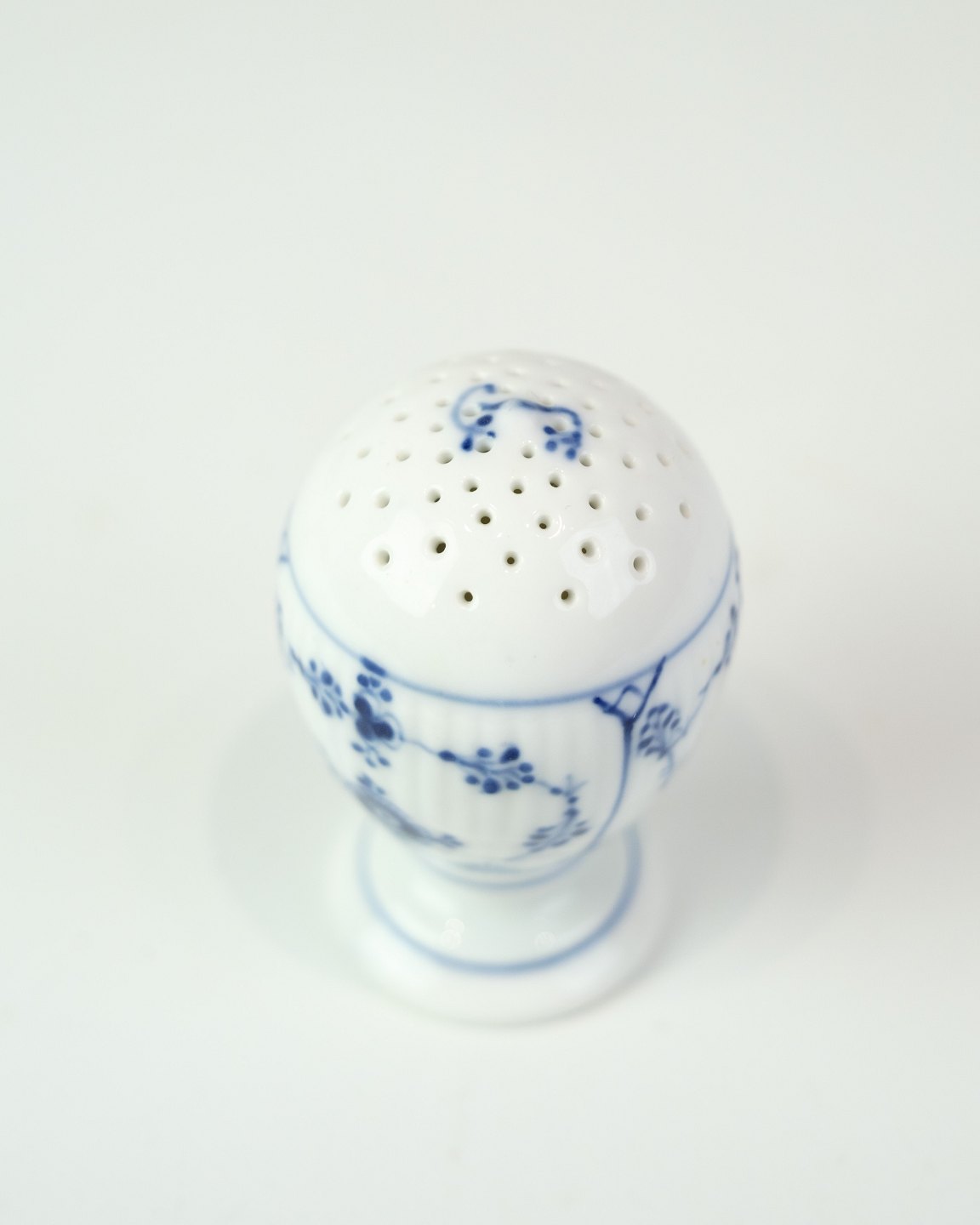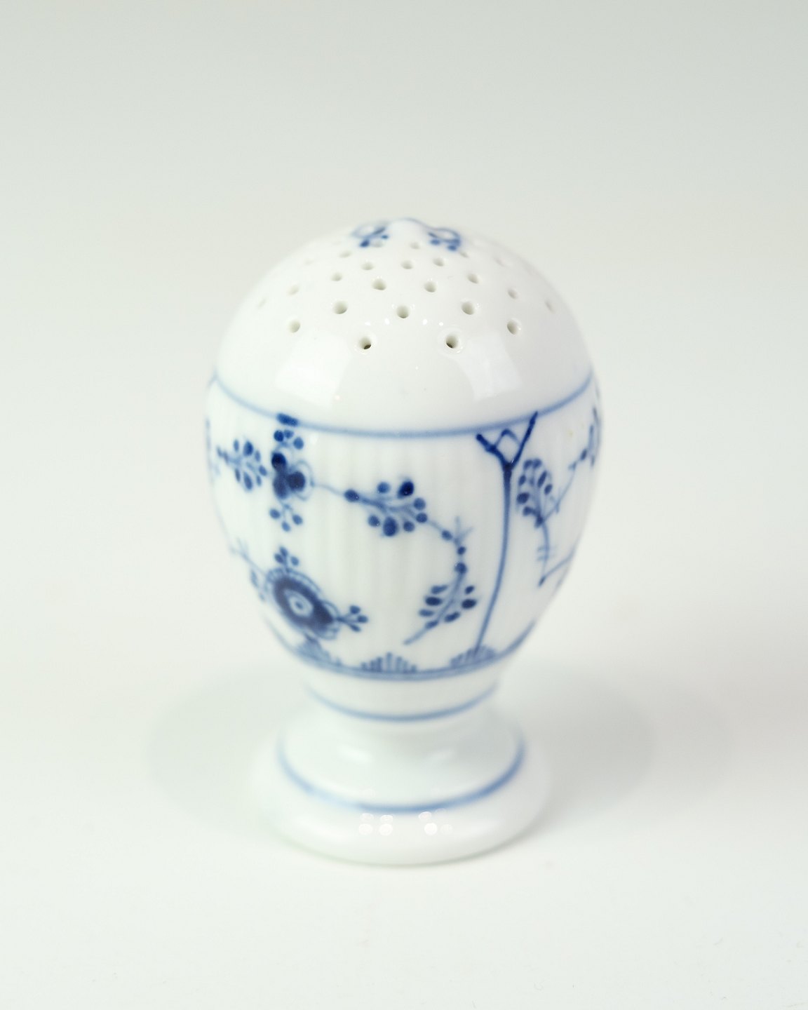 Peberbøsse fra Royal Copenhagen i det klassiske musselmalede mønster. Model No. 189 og er udført i håndmalet porcelæn med riflet overflade og blå dekoration.