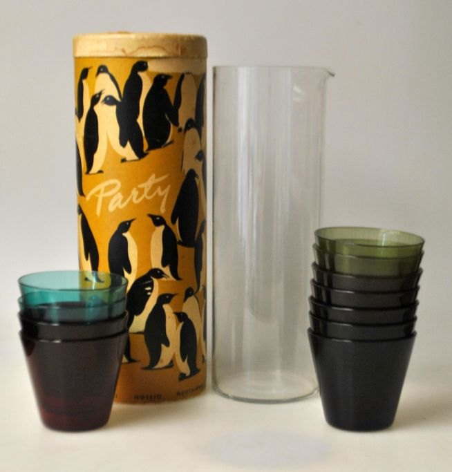 Franck, Kaj (1911 - 1989 ) Finland: Party glas og karaffel, ca. 1954. Produceret af Nuutajärvi Notsjö. Karaffel i klart glas med 11 drikkeglas i forskellige farver. Inkl. original beholder. Karaffel højde: 23 cm. Dia: 8 cm. Glas højde: 6 cm. Dia: 7 cm.