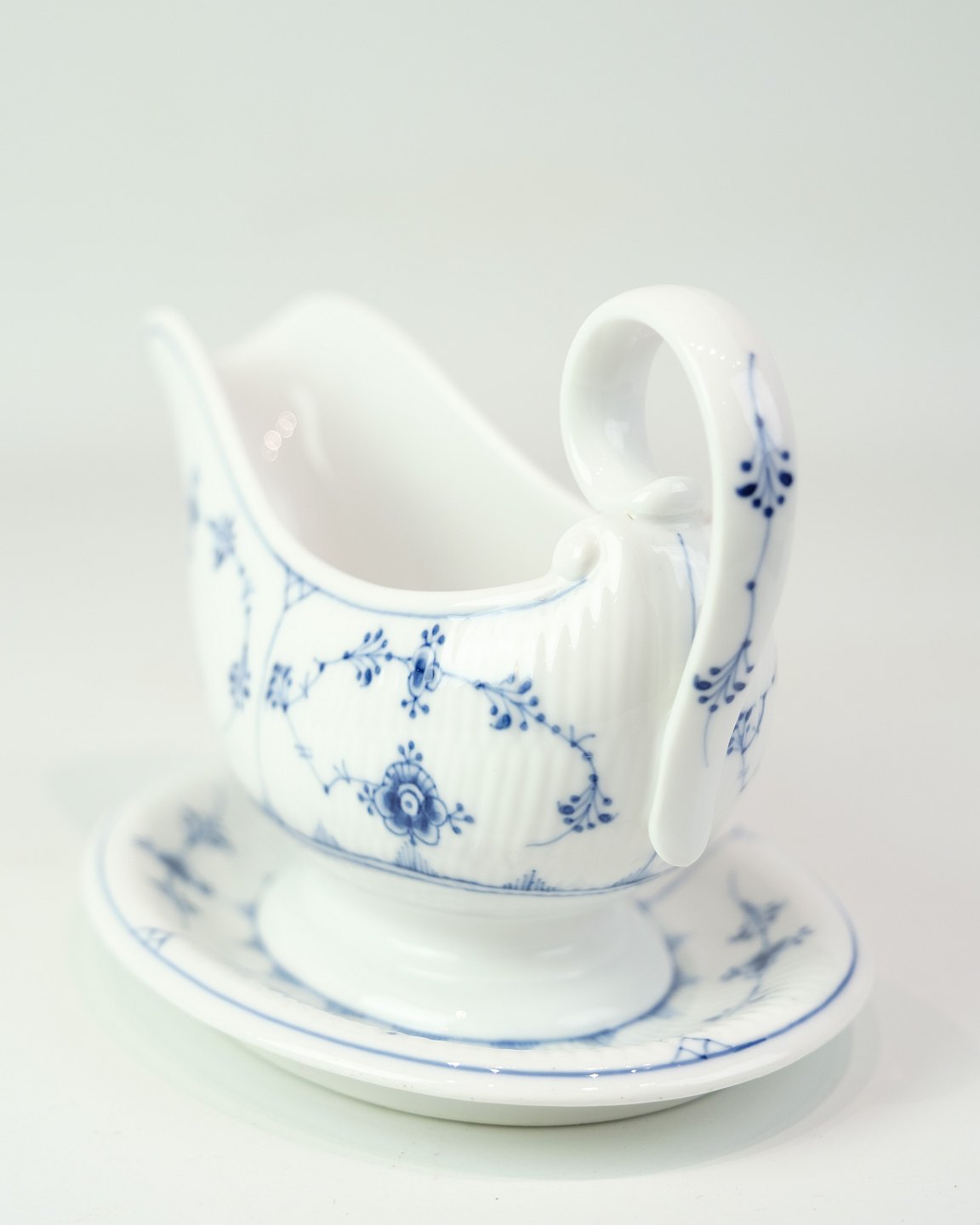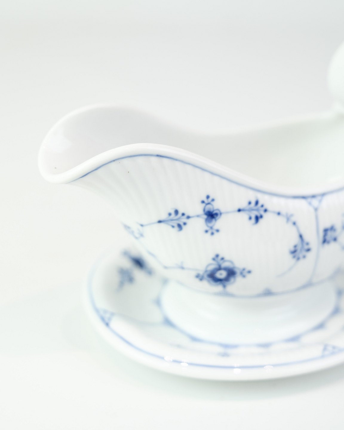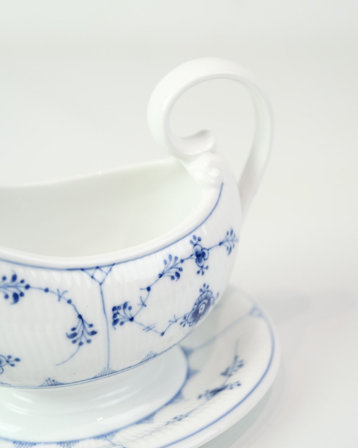 Klassisk saucekande med tilhørende underskål fra Royal Copenhagen i det ikoniske musselmalede riflet design. Modellen er No. 200 og udført i håndmalet porcelæn med koboltblå dekoration.