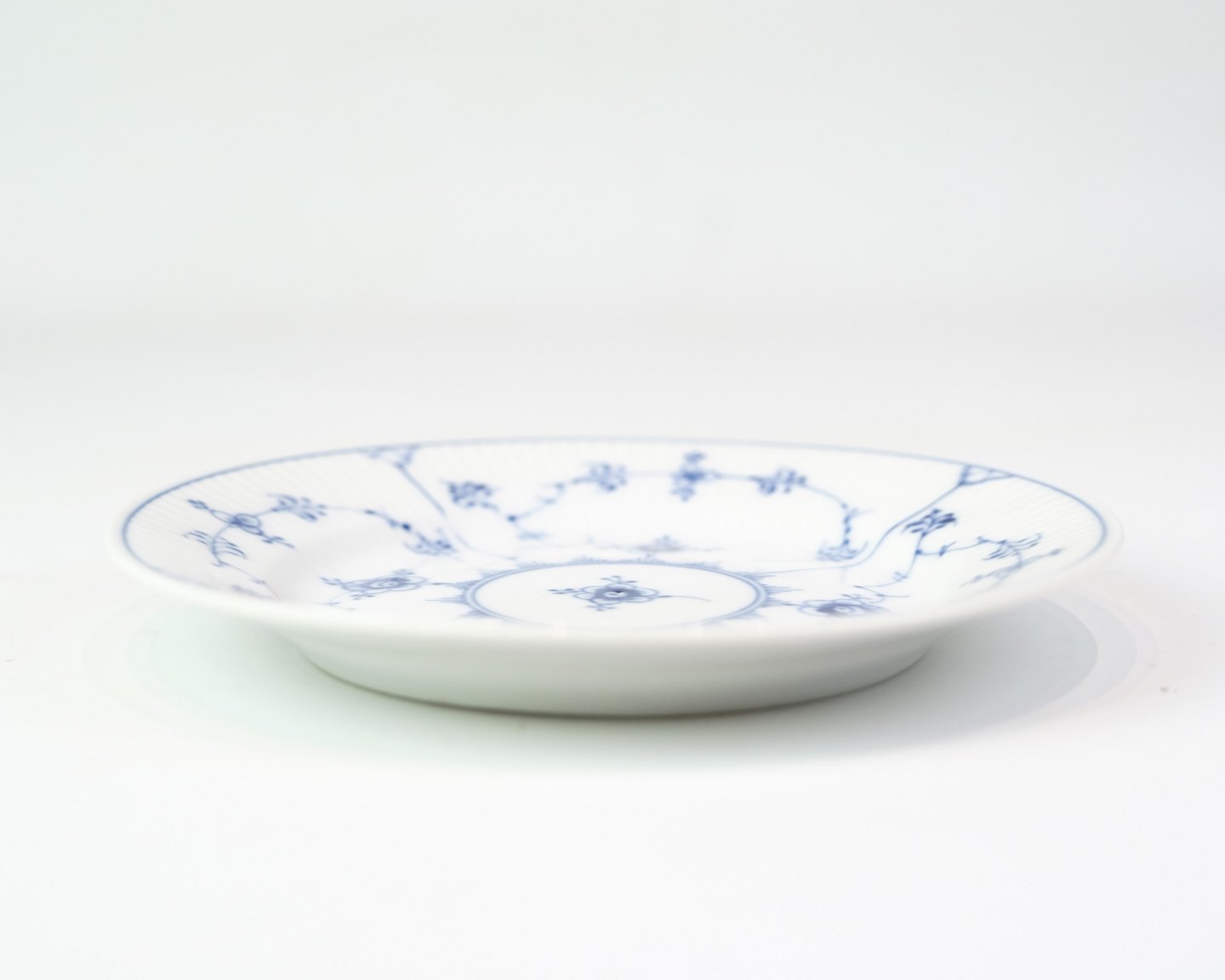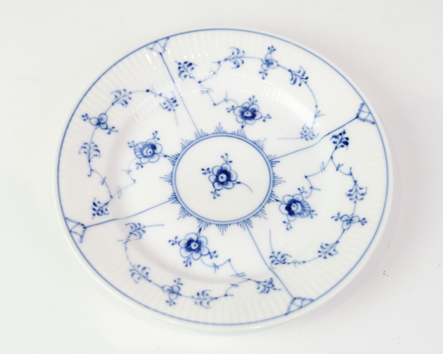 Kagetallerken fra Royal Copenhagen i musselmalede riflet mønster. Model No. 1/181 og er håndmalet i koboltblå på hvidt porcelæn med de berømte riflede detaljer. En fin størrelse til servering af kage, dessert eller småretter