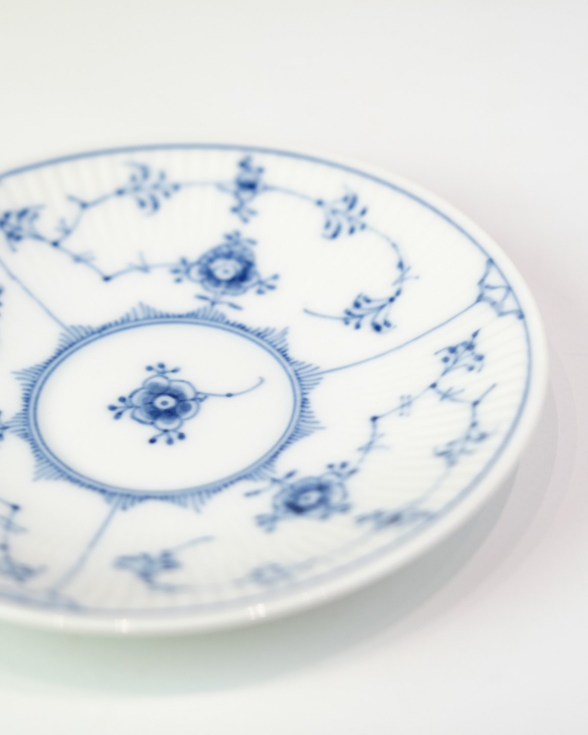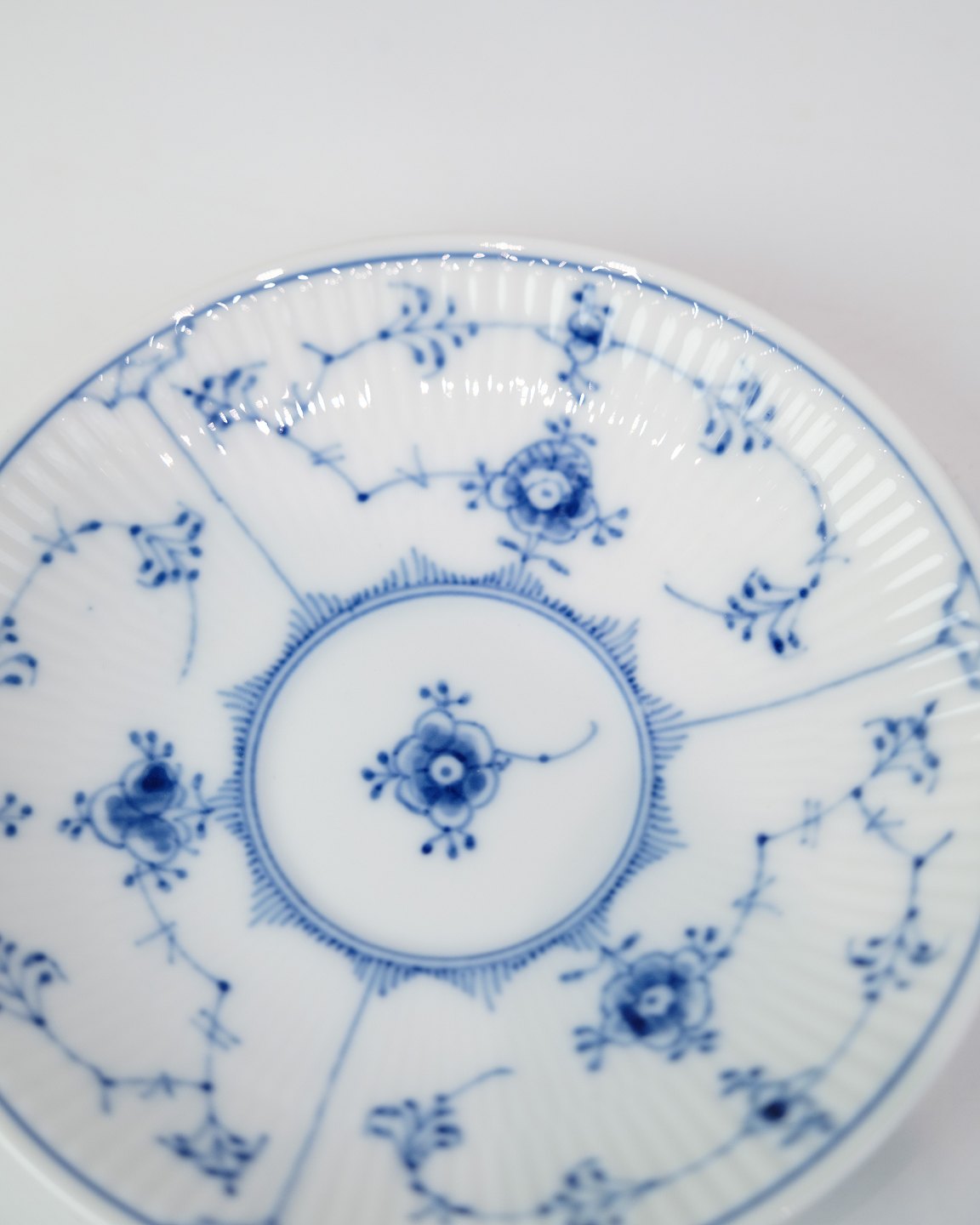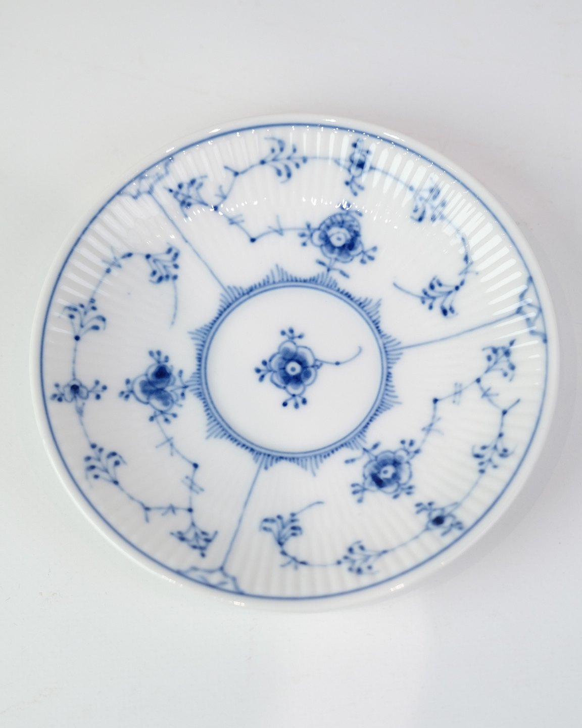 Håndmalet underkop fra Royal Copenhagens klassiske musselmalede riflet-serie. Modellen er No. 2162 og udført i porcelæn med den ikoniske koboltblå dekoration og den karakteristiske riflede overflade.